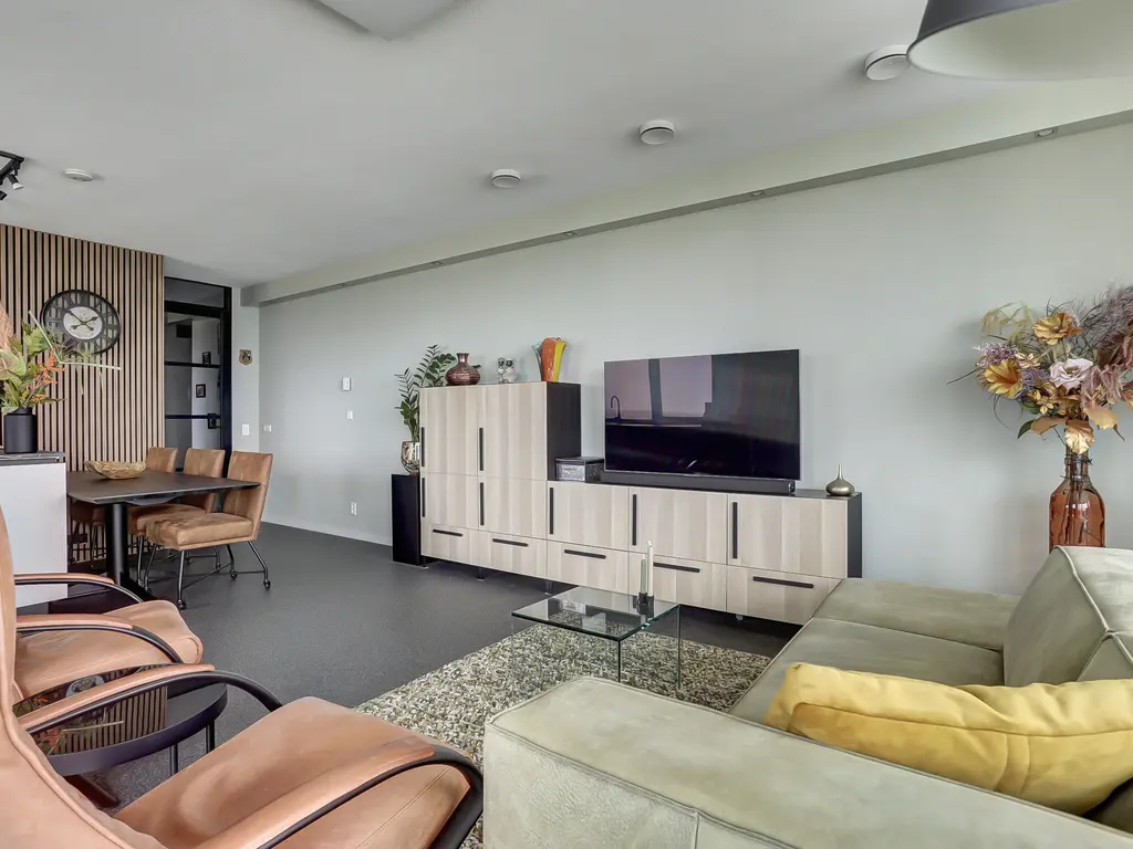 De lichte woonkamer biedt een zee aan ruimte en licht, mede dankzij de grote schuifpui naar het ruime terras met panoramisch uitzicht over het water richting de Spijkenisserbrug. Een heerlijke plek om te ontspannen, van zonsopkomst tot zonsondergang.