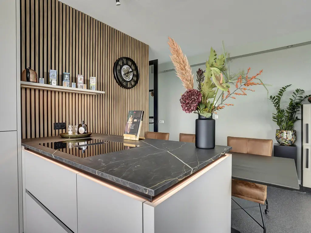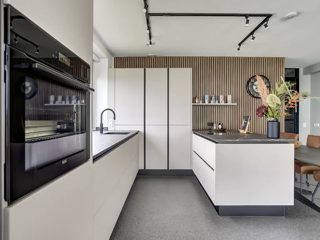 De moderne keuken (2024) bevindt zich aan de achterzijde van de woonkamer, met directe blik op de Oude Maas. De stijlvolle U-opstelling is voorzien van hoogwaardige AEG inbouwapparatuur, waaronder een koel-vriescombinatie, inductiekookplaat met geïntegreerde afzuiging, grote stoomoven, Quooker-kraan, een prachtig werkblad en volop kastruimte. Verder is de keuken voorzien van een vaatwasser (Miele).