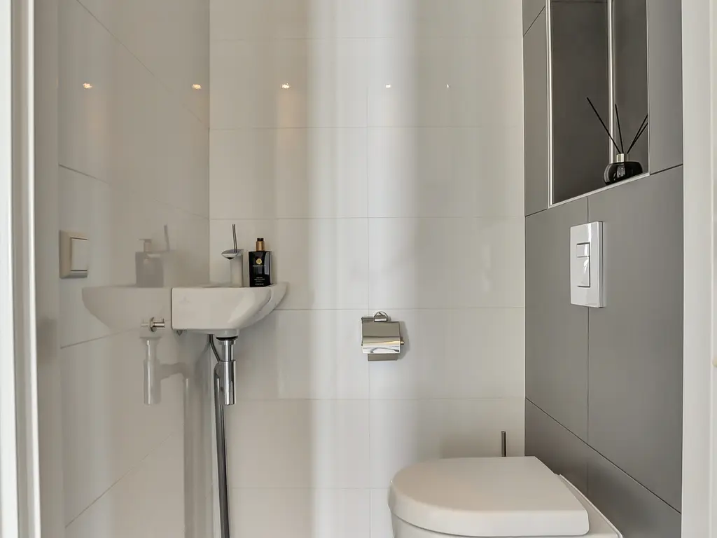 Het moderne, betegelde toilet (Villeroy & Boch) met fontein, kastruimte en aansluitingen voor wasmachine en droger is keurig afgewerkt. Hier bevinden zich tevens de warmtepomp en WTW-installatie.