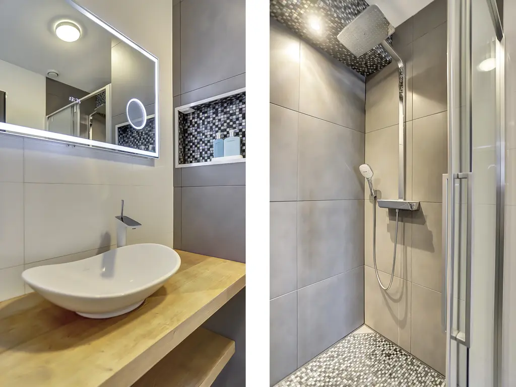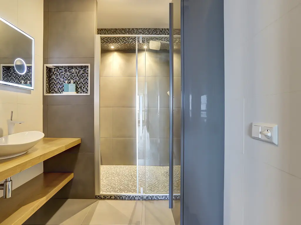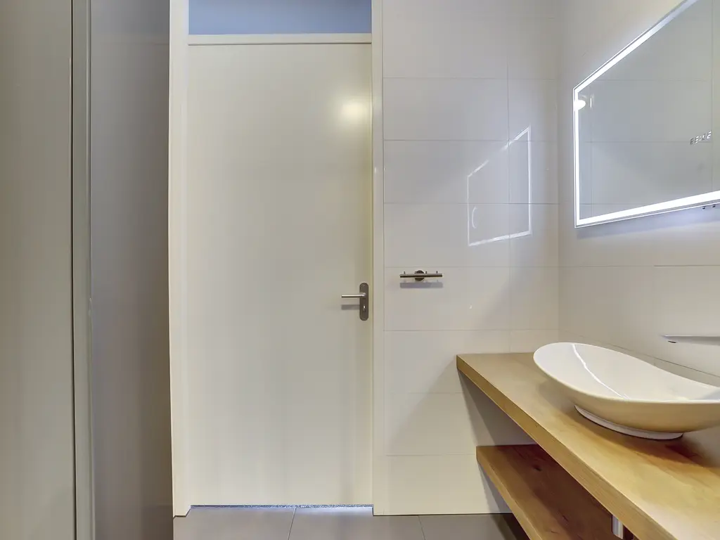 De moderne badkamer is stijlvol betegeld, voorzien van een ruime inloopdouche met glazen schuifwand, Grohe regendouche en een modern wastafelmeubel met spiegel inclusief ingebouwde verlichting.