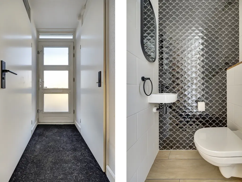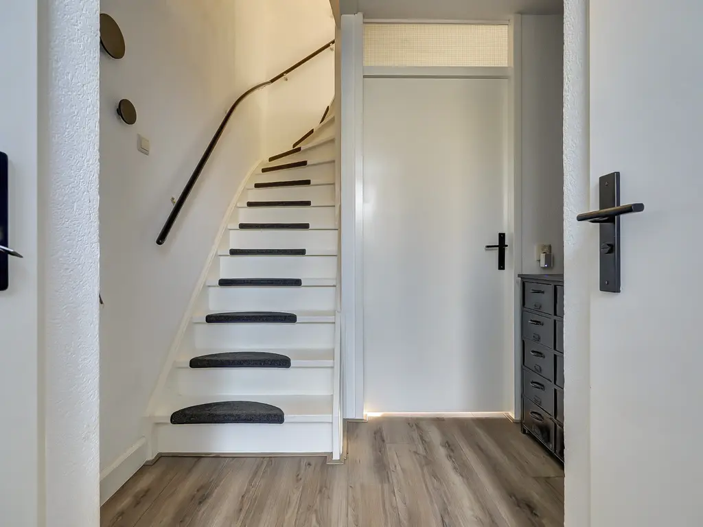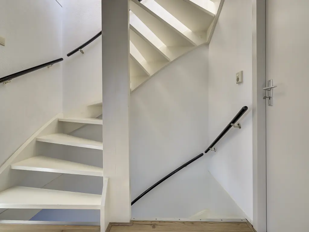 Begane grond: De entree geeft toegang tot de meterkast, de trapopgang en het moderne toilet dat is afgewerkt met een speelse zwarte tegel. Vanuit de hal stap je de woonkamer binnen. Een fijne lichte en ruime tuingerichte kamer met ingebouwde trapkast.