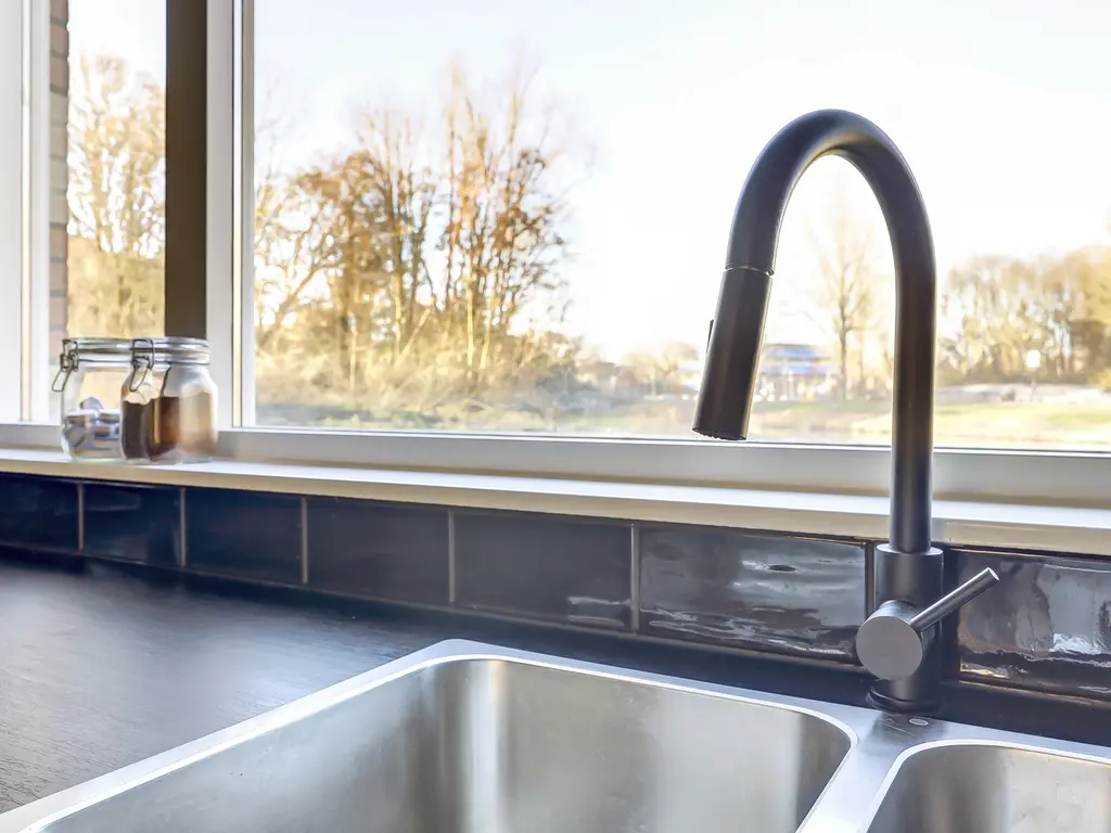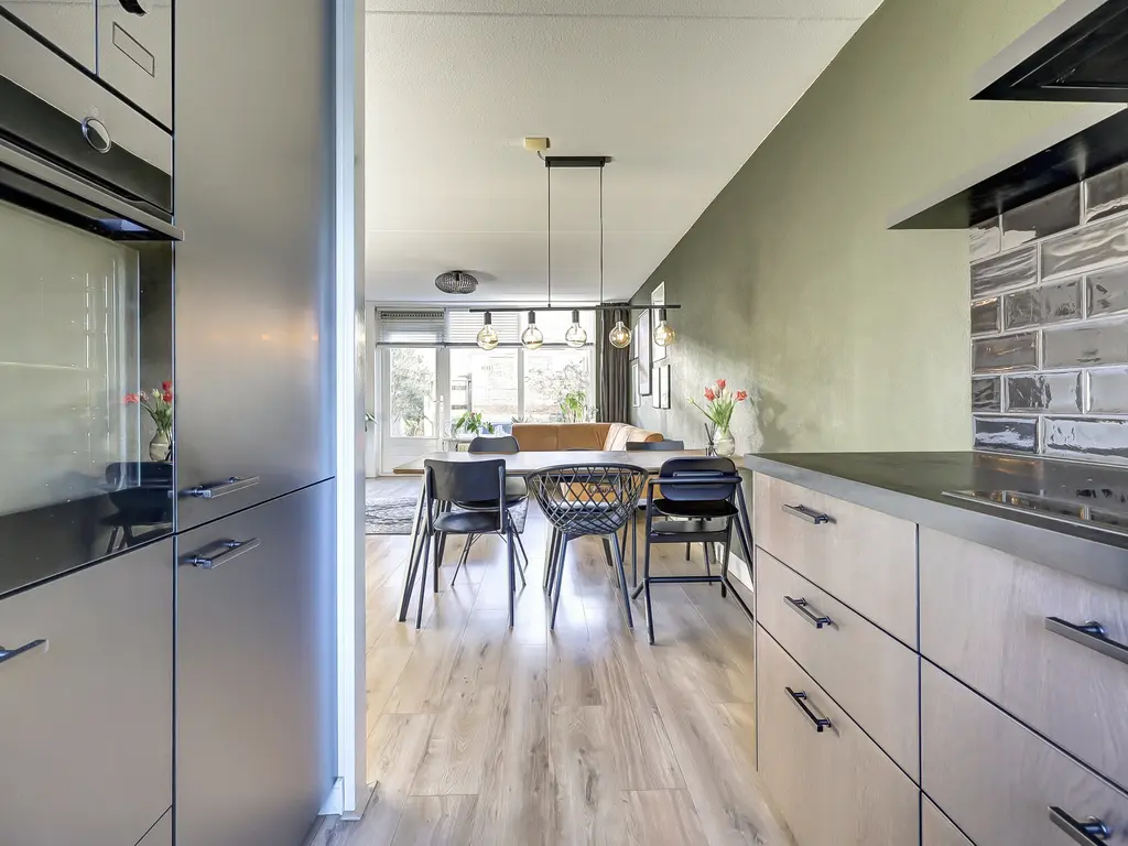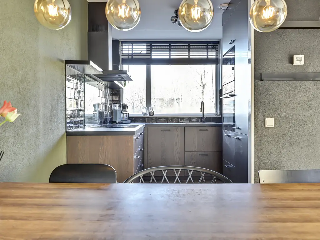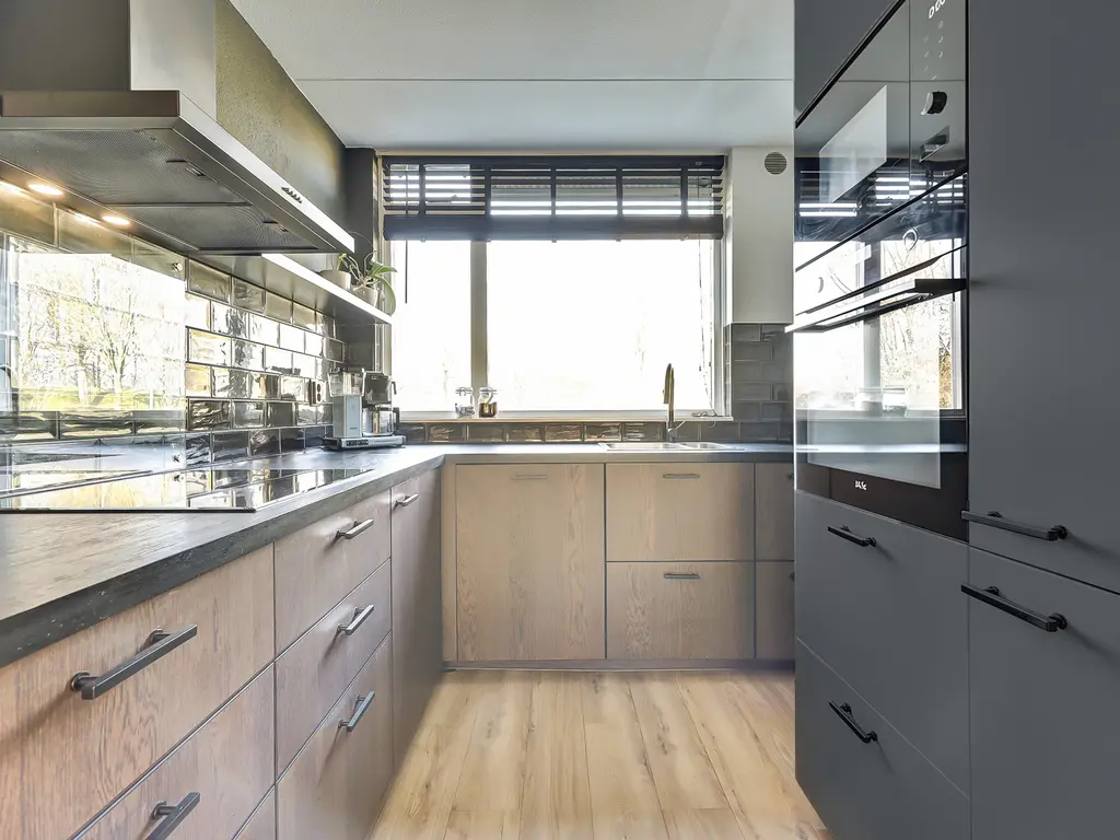 Aan de voorzijde van de woning bevindt zich de moderne keuken met een dubbele wandopstelling. De keuken (2025) is compleet uitgerust met een dubbele wasbak, vaatwasser, inductiekookplaat, afzuigkap, magnetron, oven en koel-vriescombinatie.
