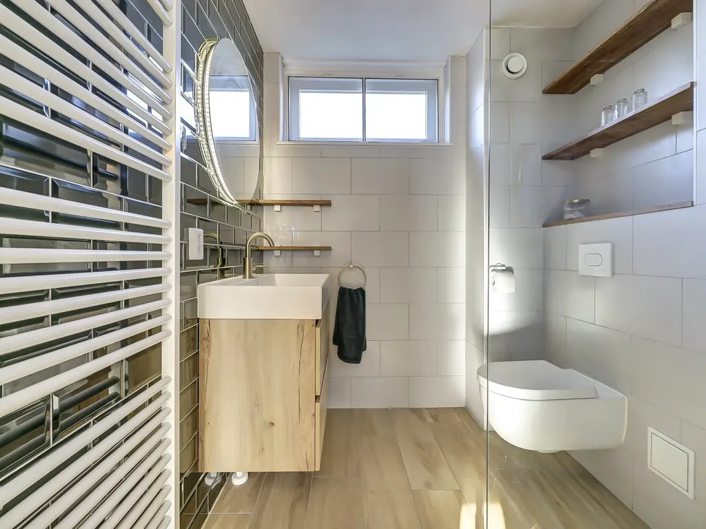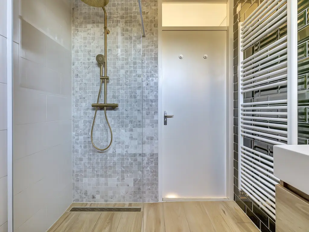 De moderne luxe badkamer (2021) is volledig betegeld en uitgevoerd met een grote inloop regendouche met anti-kalk douchewand, een tweede zwevend toilet, wastafelmeubel met opbergruimte, verwarmde spiegel en een handdoekenradiator.