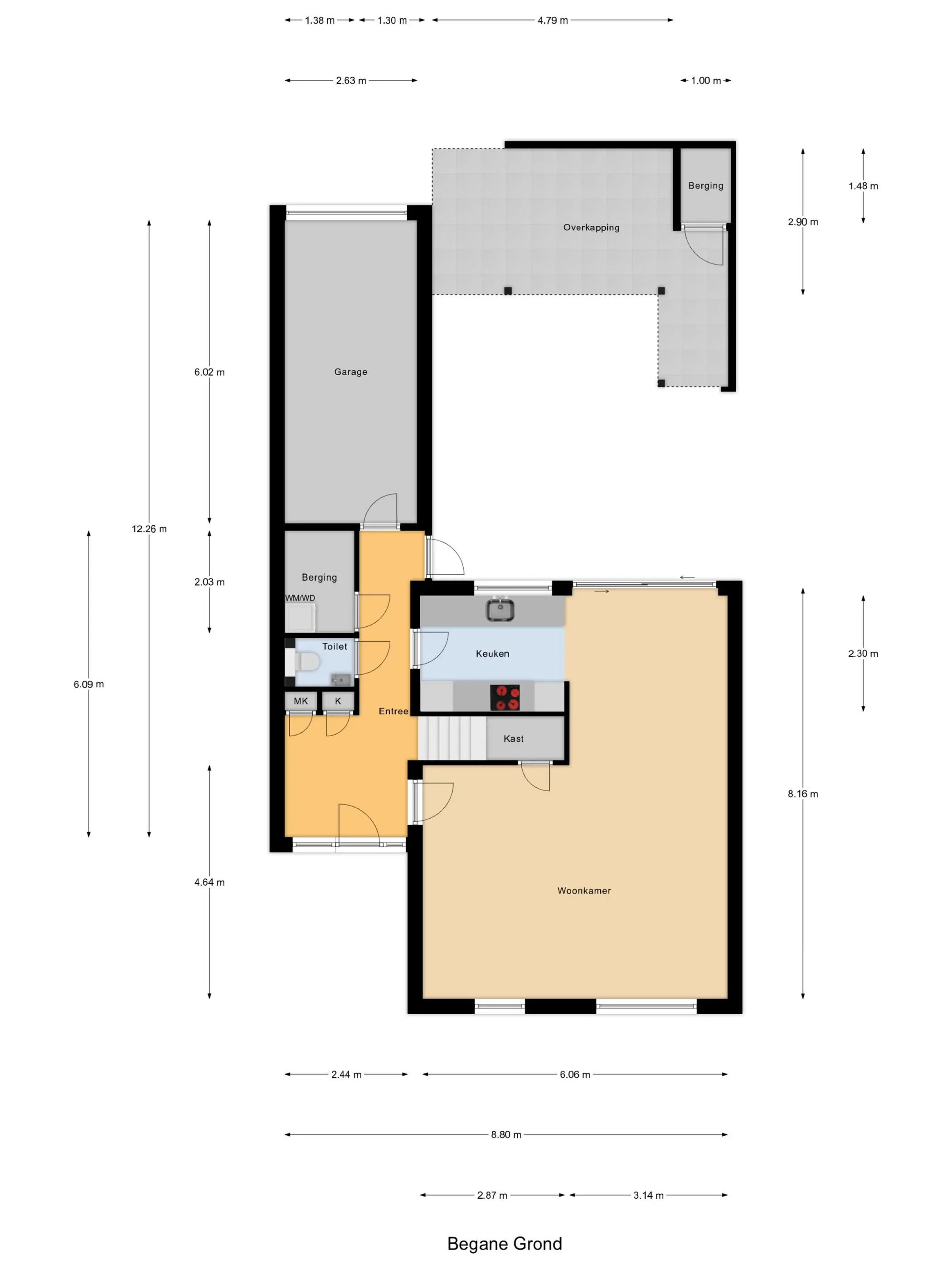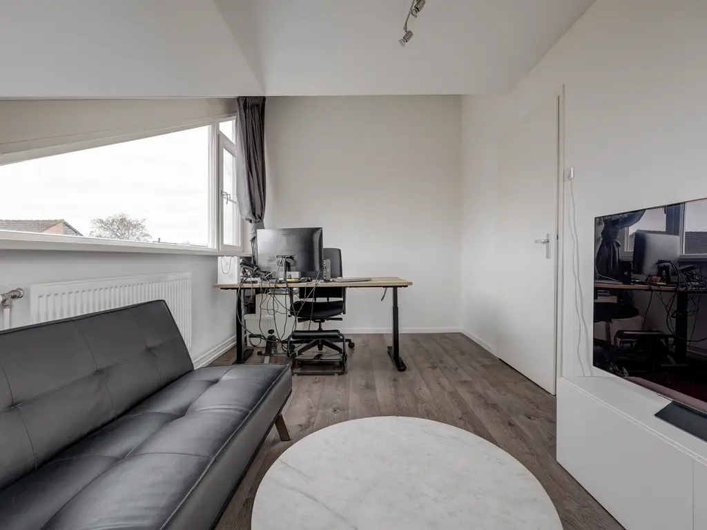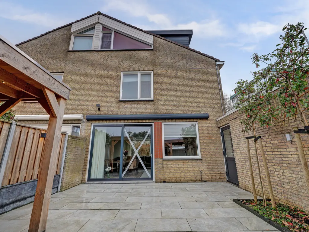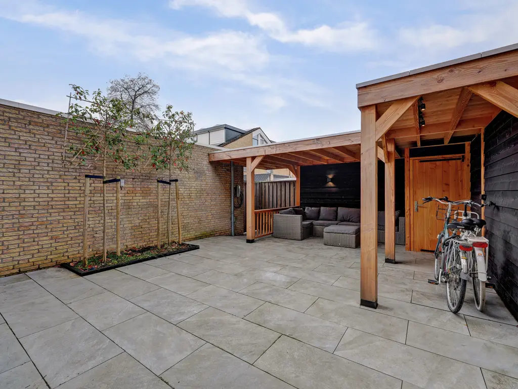 Begane grond: Via een eigen bruggetje bereik je de fraai betegelde voortuin en de entree met luifel. In de hal bevinden zich de meterkast, een vaste kast en de trapopgang. Via een stijlvolle bronzen aluminium deur kom je in de royale L-vormige woonkamer van circa 37,5 m². De living is strak afgewerkt en voorzien van een moderne tegelvloer met vloerverwarming, grote raampartijen voor veel lichtinval, een cinewall, een trapkast en een schuifpui naar de achtertuin. Aan de achterzijde ligt de prachtige open houtlook keuken (2025) in parallelopstelling, uitgevoerd met luxe inbouwapparatuur zoals een Bora kookplaat met geïntegreerde afzuiging, Quooker, vaatwasser, oven, magnetron en koffiezetapparaat. Vanuit de tussenhal bereik je het moderne toilet met vloerverwarming en de smaakvol ingerichte bijkeuken met opstelplaats voor de wasapparatuur en extra bergruimte. Vanuit deze ruimte is er tevens toegang tot de garage en de achtertuin. De zonnige achtertuin van circa 10 x 6 meter biedt volop privacy en is ingericht met een zonneterras en een sfeervolle overkapping, waardoor je hier vrijwel het hele jaar door heerlijk kunt zitten. Daarnaast is er een achterom en een eigen parkeerplaats met oplaadpunt voor een elektrische auto.