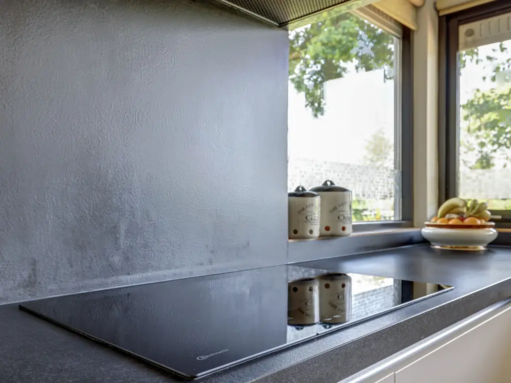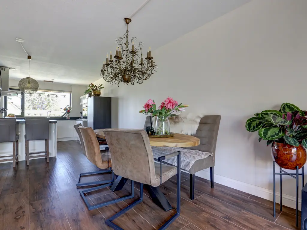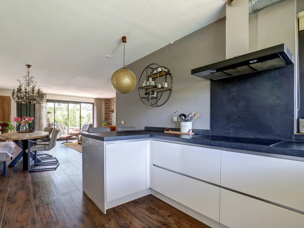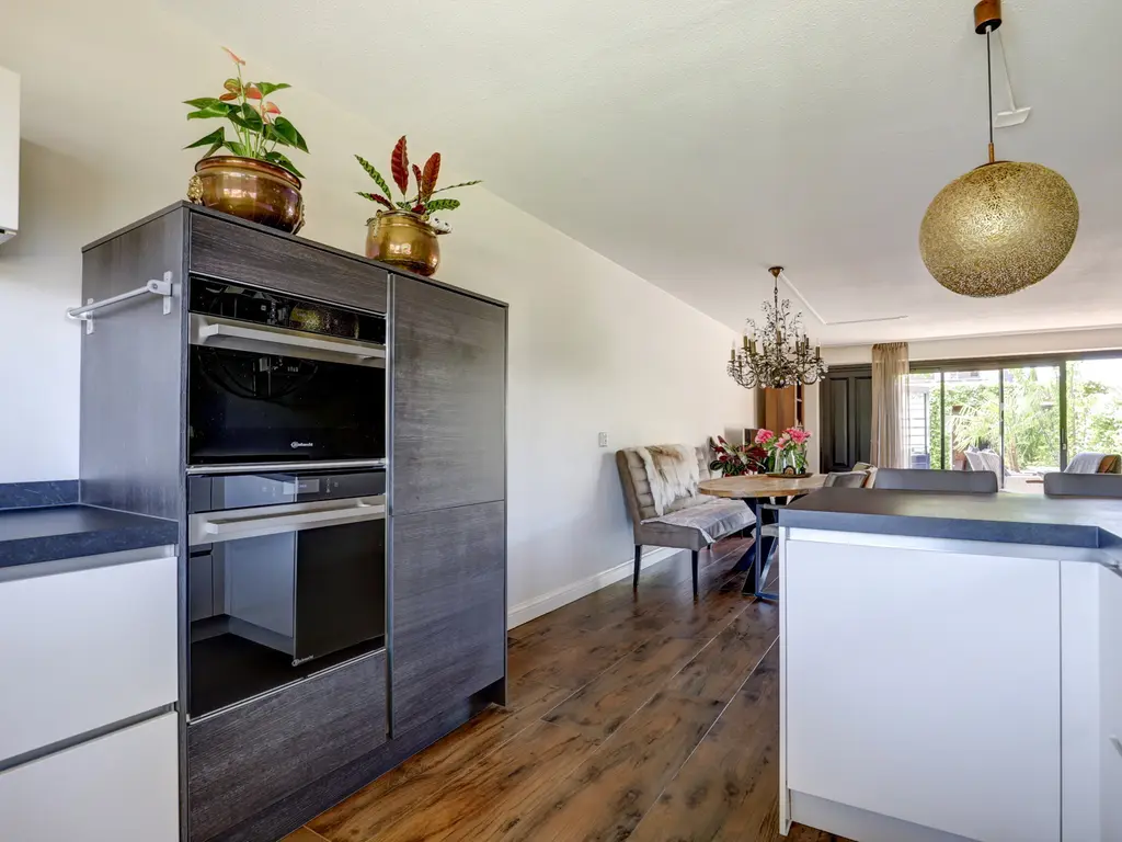De open keuken aan de voorzijde (vernieuwd in 2018) is een echte eyecatcher: luxe uitgevoerd in U-opstelling met bar, veel werkruimte en compleet met inbouwapparatuur zoals koelkast, vriezer, oven, kookplaat, vaatwasser, magnetron en afzuigkap.