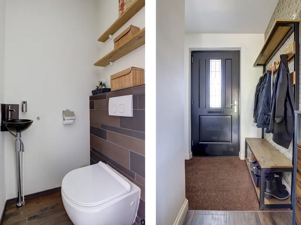 Aan de achterzijde is een praktische bijkeuken/berging met aansluitingen voor de wasmachine en droger. De gehele begane grond is afgewerkt met een stijlvolle houtlook tegelvloer én comfortabele vloerverwarming (5 groepen).