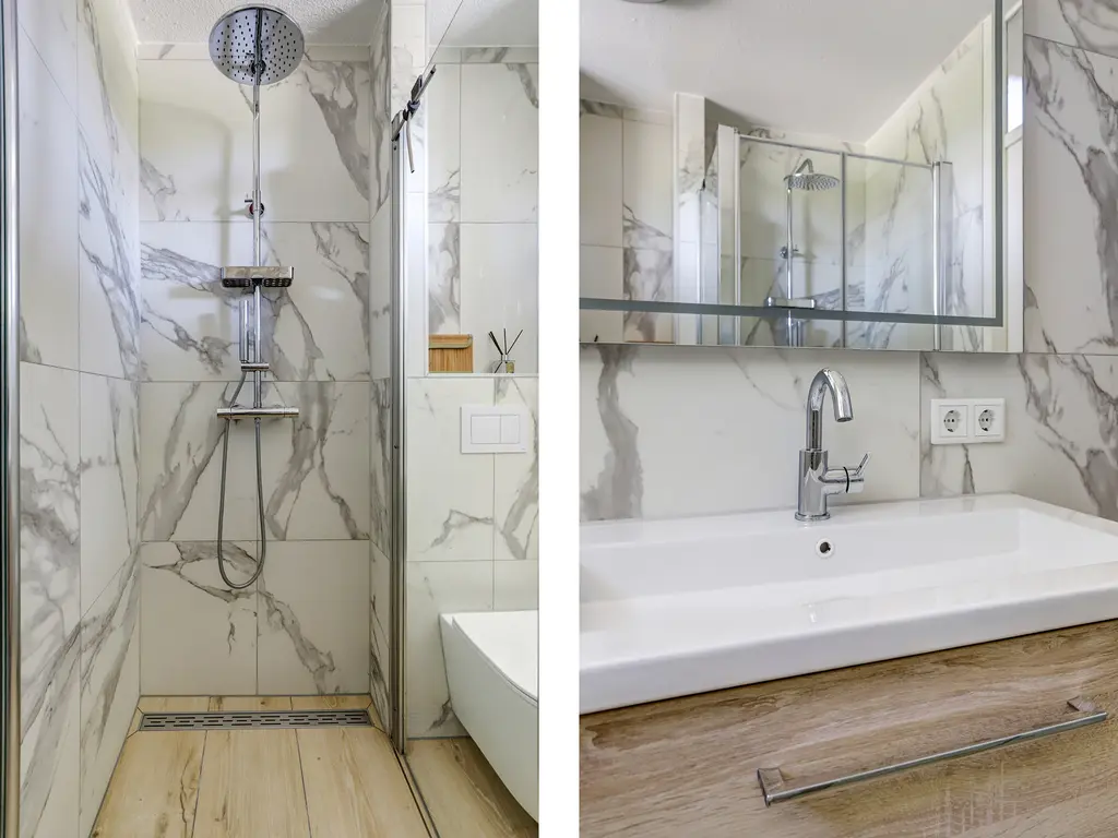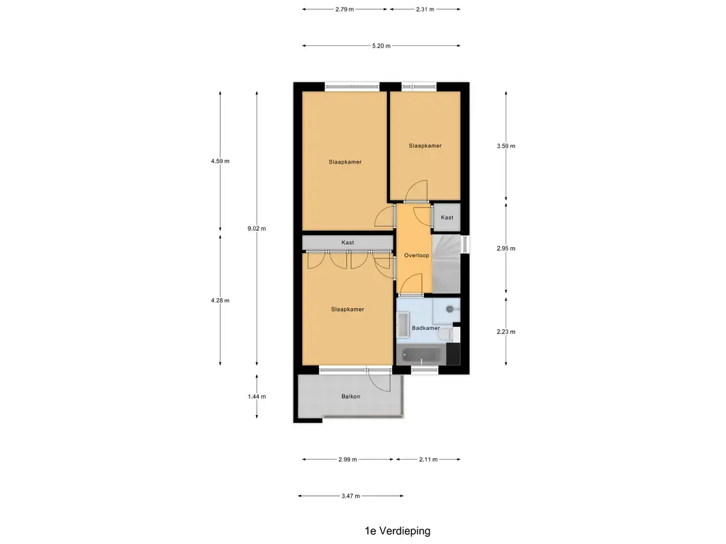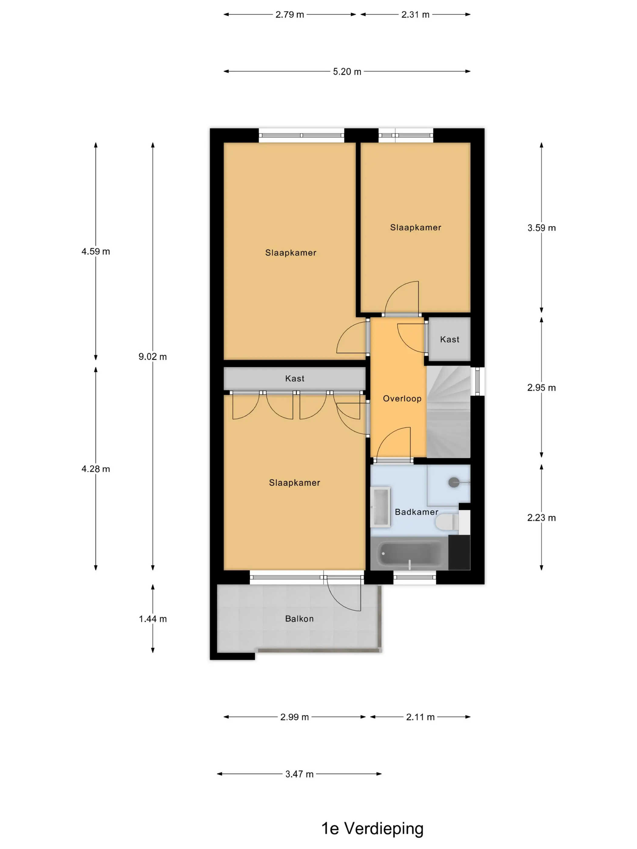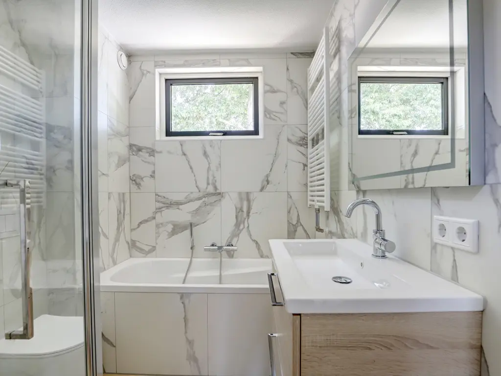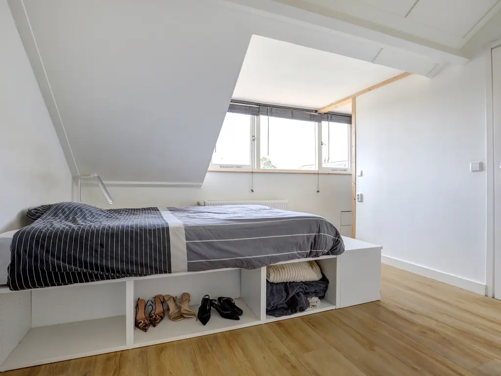 Overloop met bergkast, drie slaapkamers waarvan één met balkon aan de voorzijde. De moderne badkamer (2019) is luxe uitgevoerd met een ligbad, aparte douche, tweede toilet en een fraai wastafelmeubel.