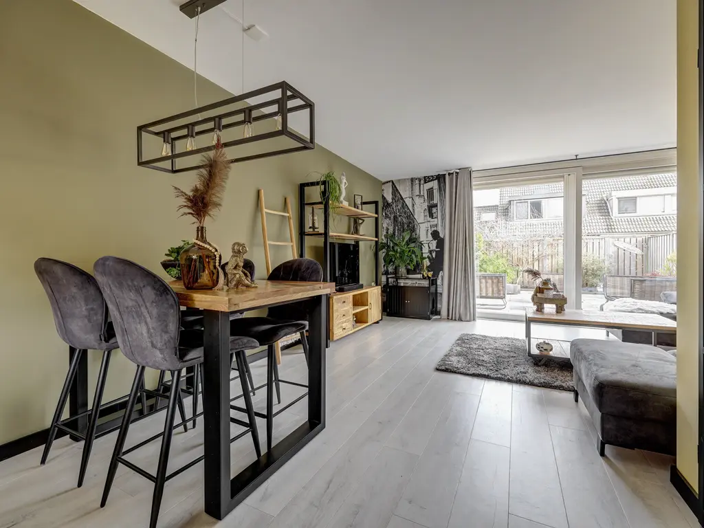 Begane grond: Via de entree/hal met meterkast (2022), modern zwevend toilet en trapopgang naar de eerste verdieping betreedt u deze fijne woning. Bij binnenkomst valt direct de prachtige stalen deur van GERS op, die toegang geeft tot de ruime en heerlijk lichte woonkamer. Deze leefruimte ademt sfeer en comfort en nodigt uit tot ontspannen momenten met familie en vrienden. De woonkamer is afgewerkt met een nette laminaatvloer, beschikt over een praktische voorraadkast en staat via de schuifpui in directe verbinding met de zonnige achtertuin. Hier geniet u volop van privacy en rust een heerlijke plek om in de zomer lange avonden buiten door te brengen.