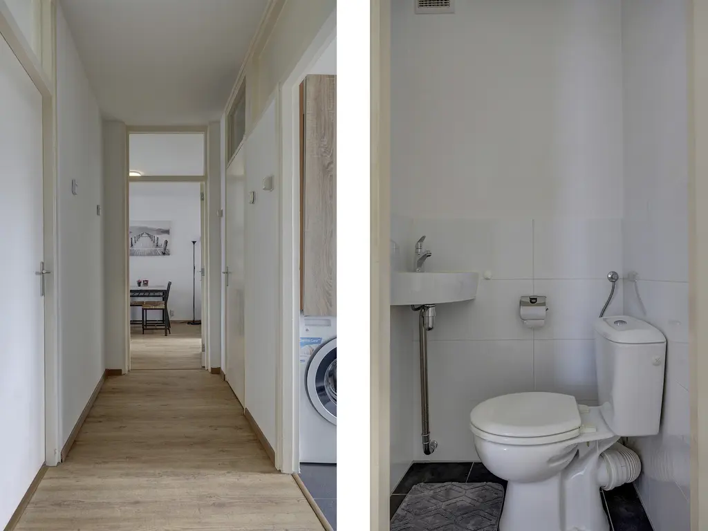 Tweede verdieping: Via de entree/hal bereik je de meterkast, het toilet en de verschillende vertrekken. Aan de achterzijde bevindt zich slaapkamer 1, voorzien van een nette laminaatvloer en toegang tot het balkon op het oosten – een heerlijke plek om de dag rustig te beginnen.