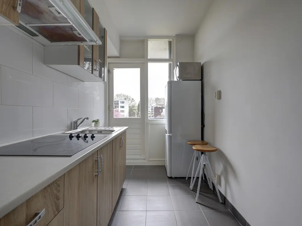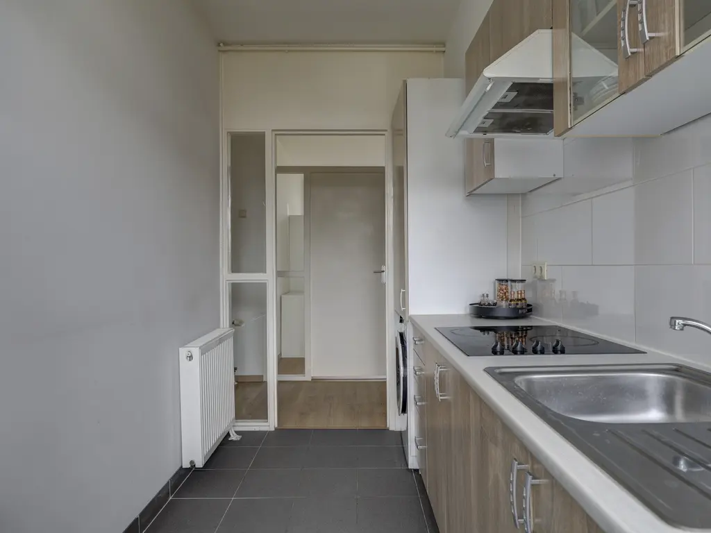De nette, dichte keuken is uitgerust met inbouwapparatuur, waaronder een kookplaat en afzuigkap, en beschikt daarnaast over een aansluiting voor de wasmachine. Vanuit de keuken heb je toegang tot het tweede balkon aan de westzijde. Hier is tevens de cv-combiketel (2015) geplaatst.
