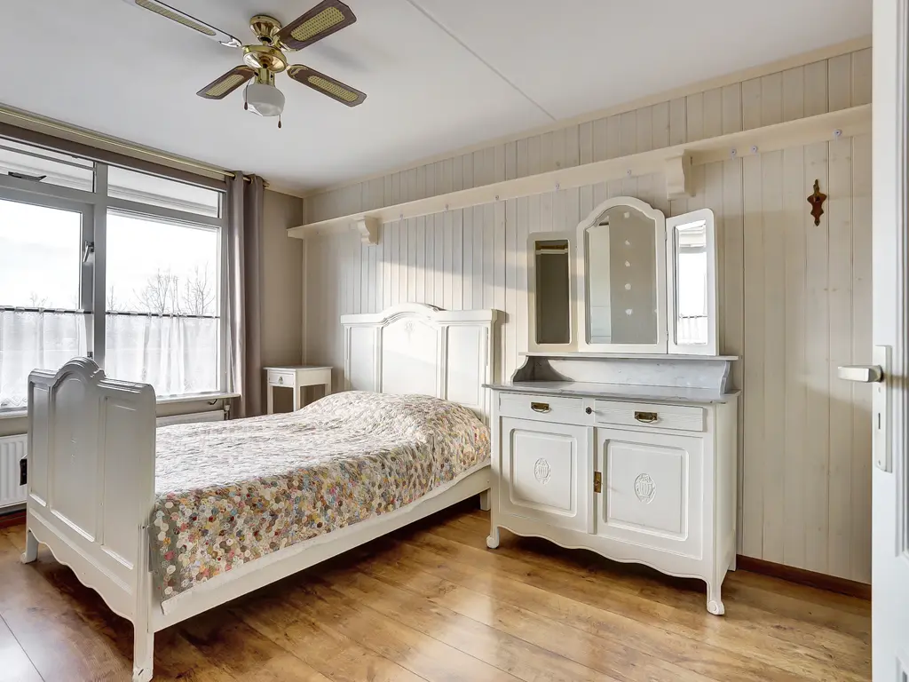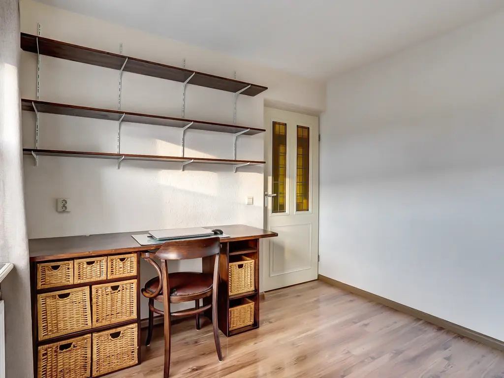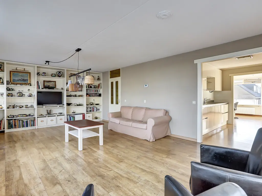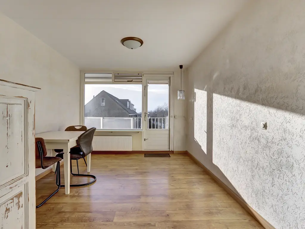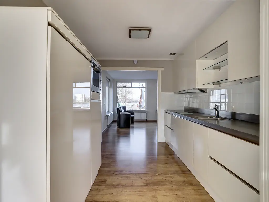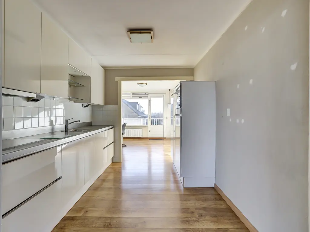 Aan de achterzijde bevindt zich de vierde kamer, ideaal als eetkamer of werkplek, met directe toegang tot het ruime balkon op het zuiden. Hier is het genieten van de zon en de rust. De centraal geplaatste keuken in dubbele wandopstelling zorgt voor een gezellige sfeer en is uitgerust met o.a. een inductiekookplaat, afzuigkap, vaatwasser, combi-oven en koelkast.