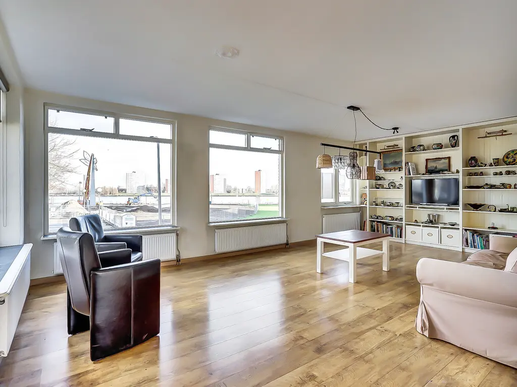 1e verdieping / het appartement: Via de hal met meterkast, toilet en een handige kast met de opstelling van de CV-ketel (circa 2020) en MV-box, bereik je de lichte en uitnodigende woonkamer. Dankzij de grote raampartijen heb je hier een adembenemend panorama over de Oude Maas een uitzicht dat elke dag weer anders is.