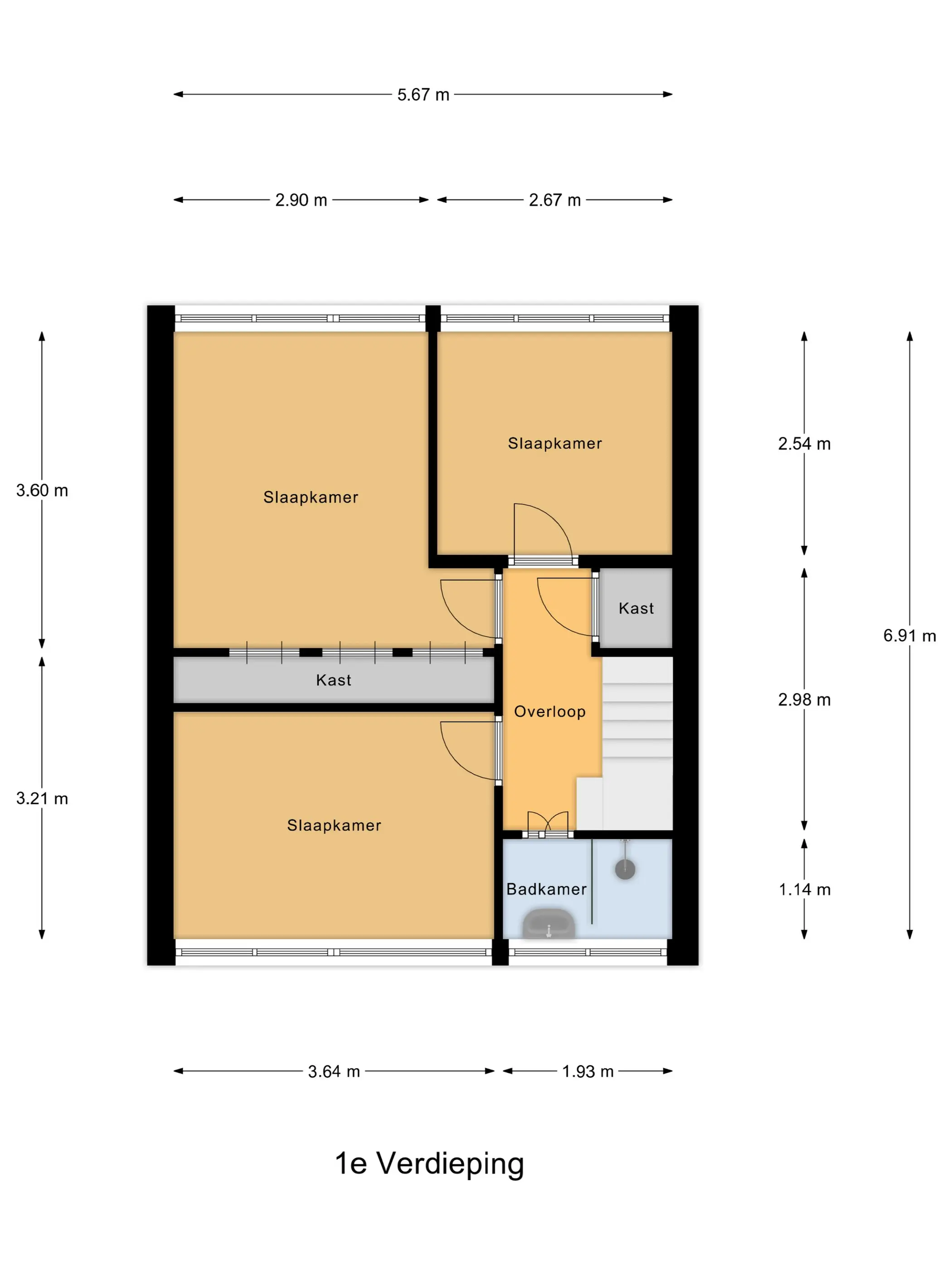 1e Verdieping: De overloop biedt toegang tot de 3 slaapkamers waarvan er 2 zijn v.v. een laminaatvloer. De badkamer beschikt over een douche en wastafel.
