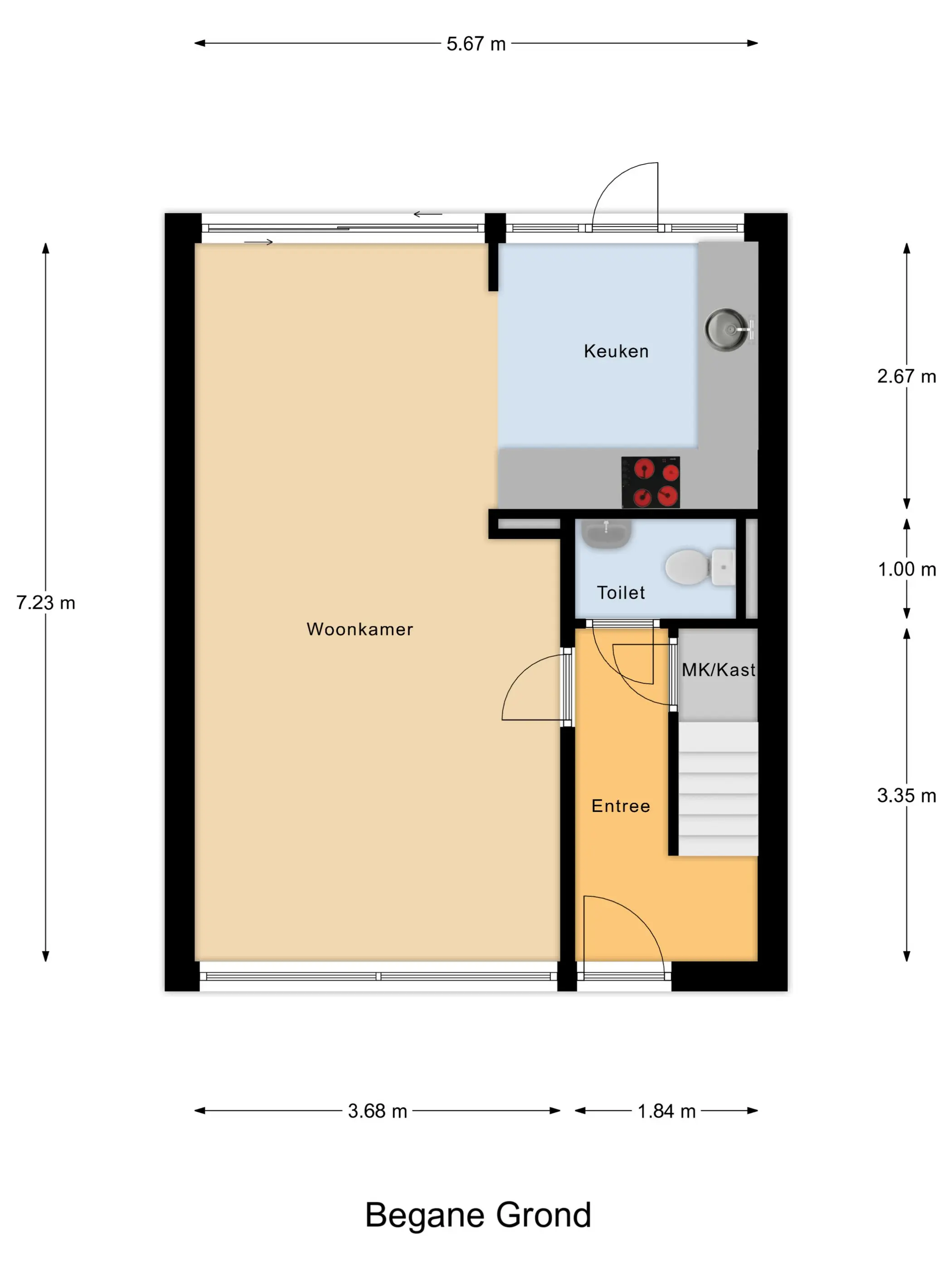 Begane grond: Entree/hal met toegang tot het toilet, meterkast en de trap naar de eerste verdieping en de ruime woonkamer. De woonkamer biedt volop mogelijkheden voor een gezellige zithoek én een ruime eettafel. Dankzij de tegelvloer en houten kozijnen met dubbelglas is het hier comfortabel wonen.
