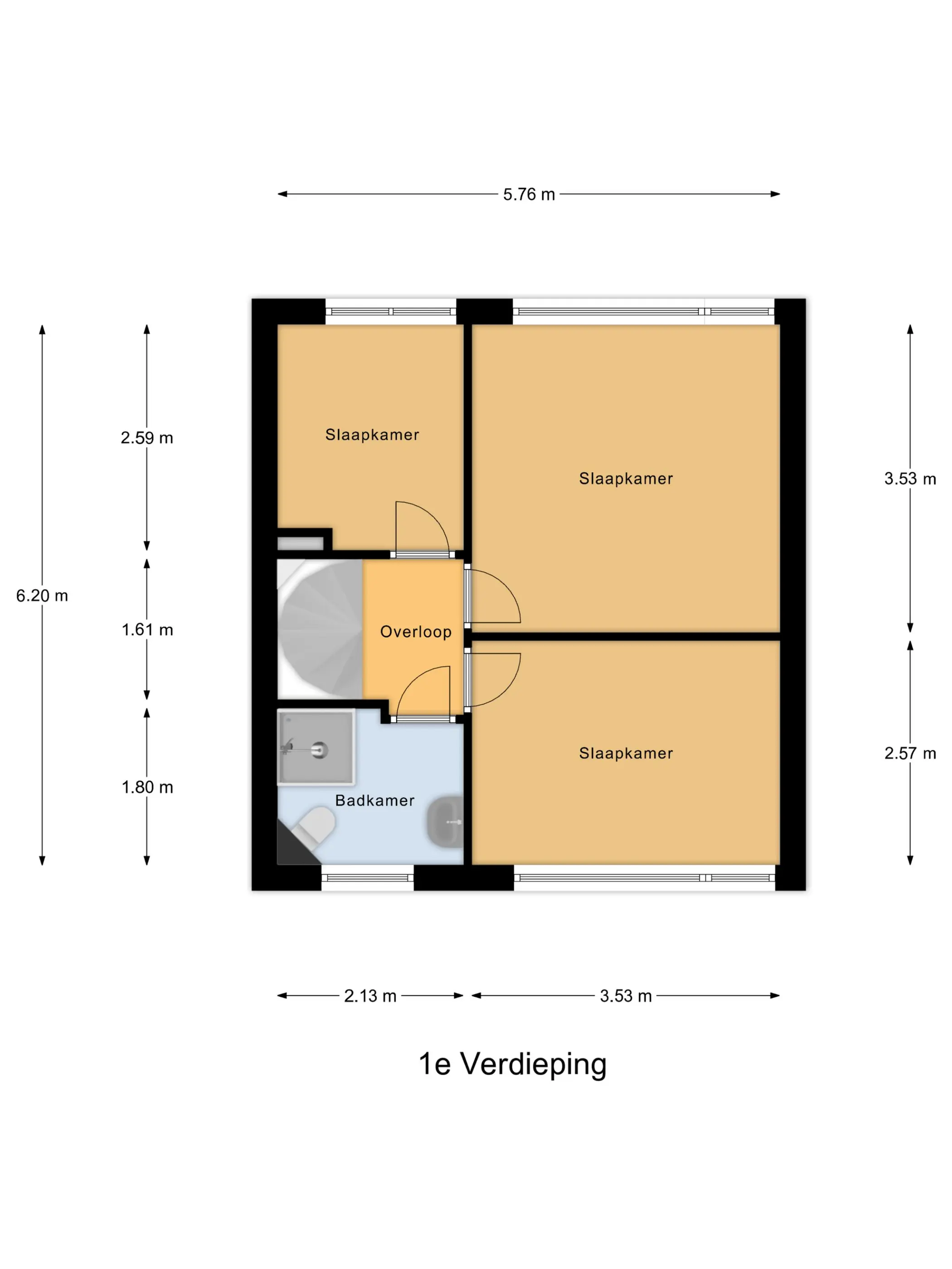 Eerste verdieping: Overloop met toegang tot drie slaapkamers, allen met rechte gevels wat zorgt voor extra ruimte en gebruiksgemak. De slaapkamers zijn voorzien van een nette laminaatvloer. Alle slaapkamers zijn voorzien van rolluiken. De doucheruimte is praktisch ingericht met een douche, wastafel en een tweede toilet.