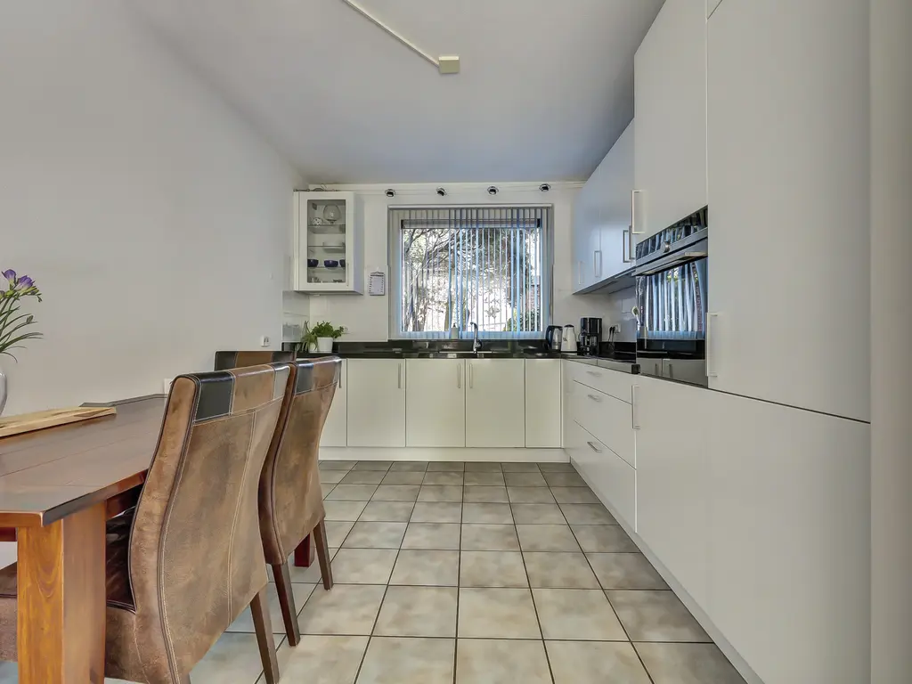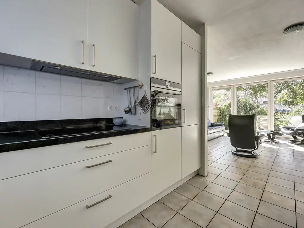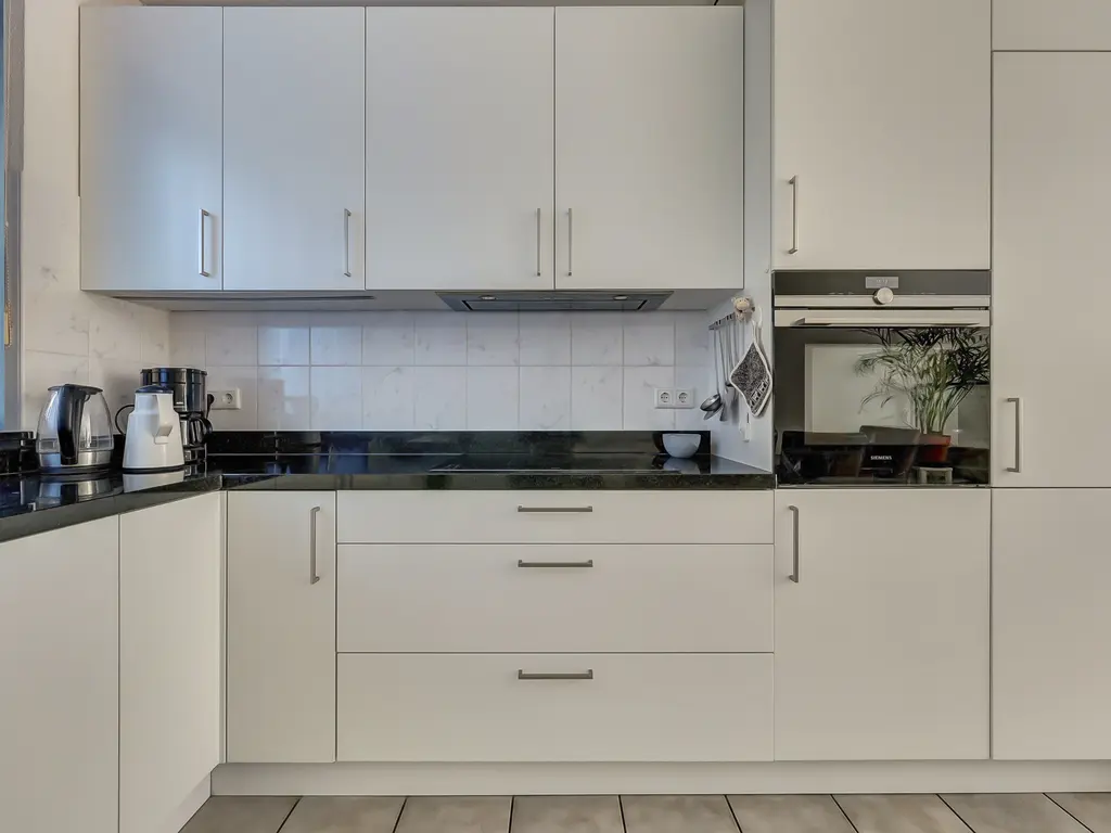 De moderne open keuken (2019) aan de voorzijde is uitgevoerd in L-opstelling en voorzien van alle gemakken: een inductiekookplaat met flexibele kookzones, smart afzuigkap, grote combimagnetron, koelkast en vriezer.