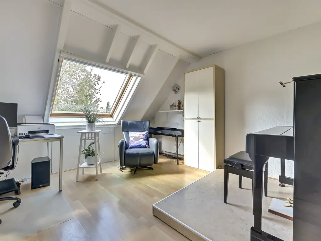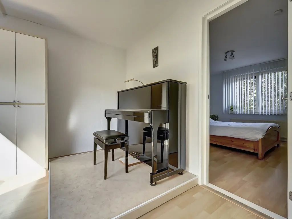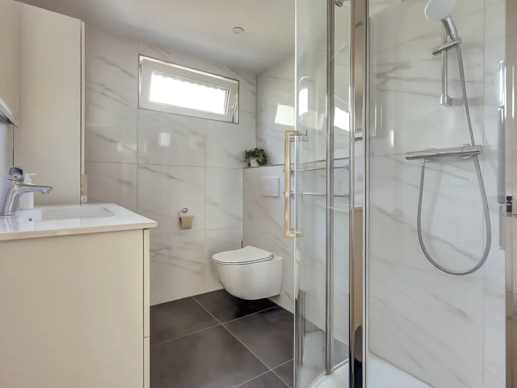 Eerste verdieping: Vanaf de overloop zijn twee ruime slaapkamers bereikbaar, beide met een handige schuifwandkast. De moderne badkamer (2024) is fraai afgewerkt en voorzien van een douche, wastafelmeubel, zwevend toilet en vloerverwarming.
