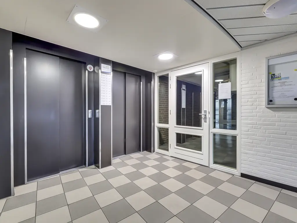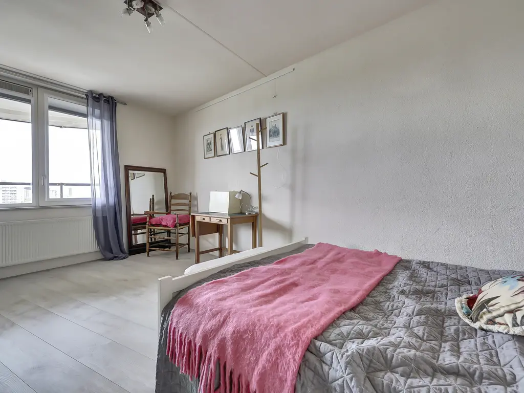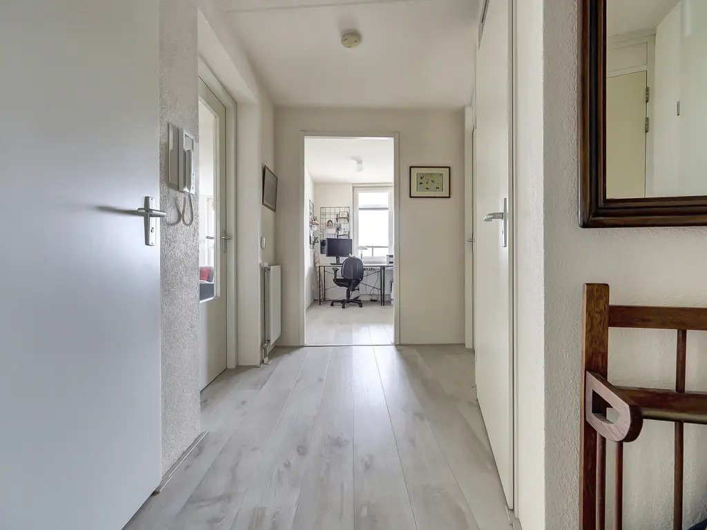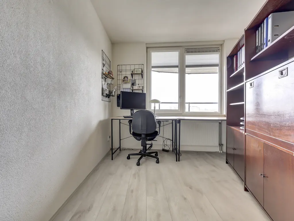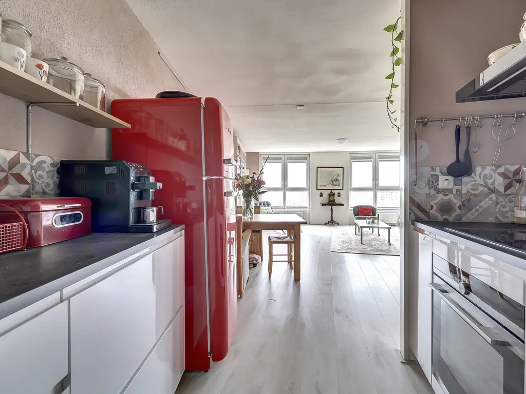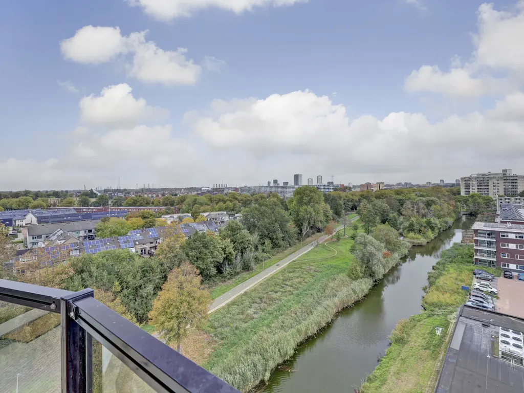 9e verdieping: Via de entree/hal met toilet zijn alle vertrekken bereikbaar. Er is een praktische inpandige berging met opstelling van de Remeha Tzerra HR-combiketel (2022), mechanische ventilatie en aansluitingen voor wasmachine en droger. De nette badkamer beschikt over een douche en wastafel. De twee ruime slaapkamers grenzen beide direct aan het balkon, waardoor er veel lichtinval en een fijne verbinding met buiten ontstaat. De royale woonkamer met grote raampartijen, laminaatvloer en dat fantastisch vrije uitzicht vormt het hart van het appartement. Vanuit hier stap je zo het zonnige balkon/terras op het oosten op, perfect voor een ochtendkoffie in de zon. Dankzij de vrije ligging en het ontbreken van inkijk geniet je hier van optimale rust en privacy. De moderne open keuken (2020) is opgesteld aan twee zijden en voorzien van diverse inbouwapparatuur, waaronder een vaatwasser, inductiekookplaat, Quooker-kraan, afzuigkap, oven en koelkast (ter overname).