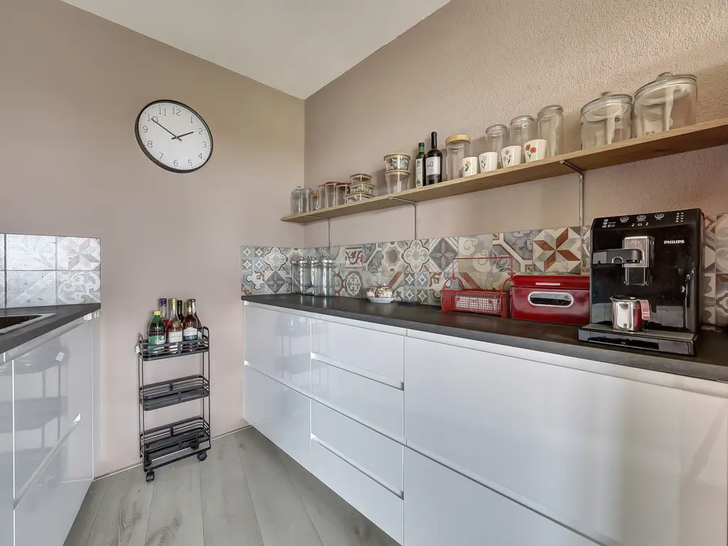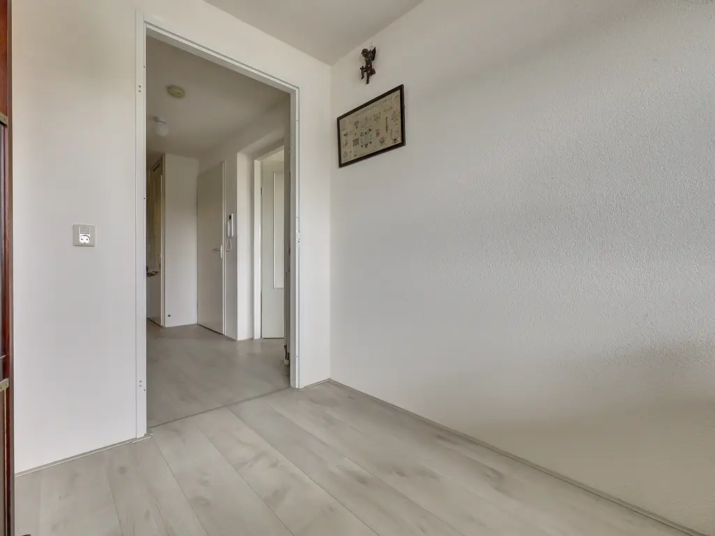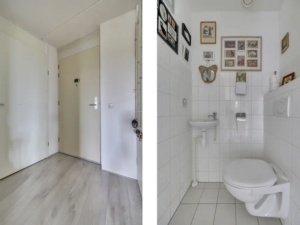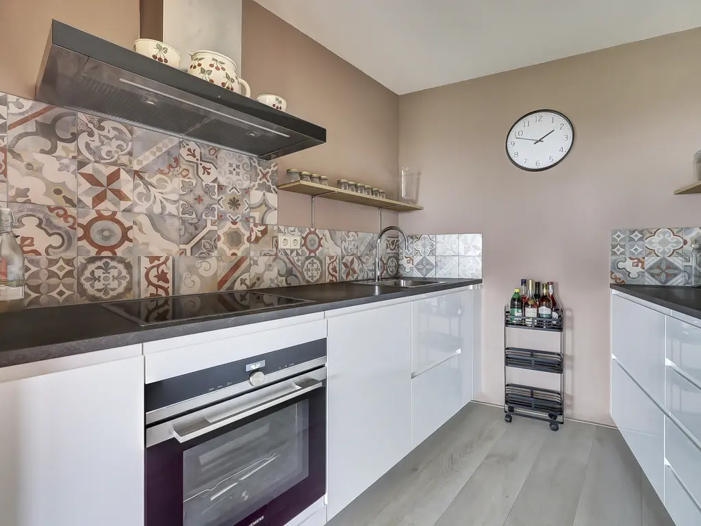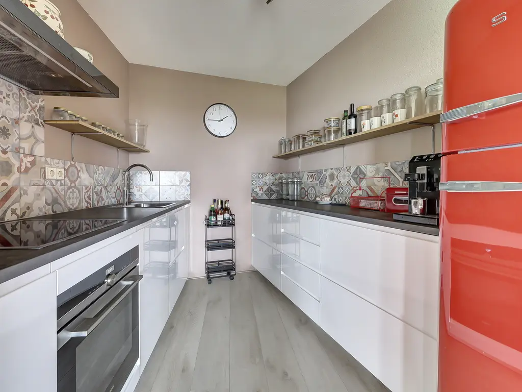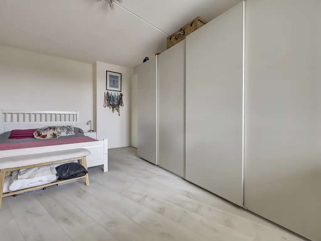 9e verdieping: Via de entree/hal met toilet zijn alle vertrekken bereikbaar. Er is een praktische inpandige berging met opstelling van de Remeha Tzerra HR-combiketel (2022), mechanische ventilatie en aansluitingen voor wasmachine en droger. De nette badkamer beschikt over een douche en wastafel. De twee ruime slaapkamers grenzen beide direct aan het balkon, waardoor er veel lichtinval en een fijne verbinding met buiten ontstaat. De royale woonkamer met grote raampartijen, laminaatvloer en dat fantastisch vrije uitzicht vormt het hart van het appartement. Vanuit hier stap je zo het zonnige balkon/terras op het oosten op, perfect voor een ochtendkoffie in de zon. Dankzij de vrije ligging en het ontbreken van inkijk geniet je hier van optimale rust en privacy. De moderne open keuken (2020) is opgesteld aan twee zijden en voorzien van diverse inbouwapparatuur, waaronder een vaatwasser, inductiekookplaat, Quooker-kraan, afzuigkap, oven en koelkast (ter overname).