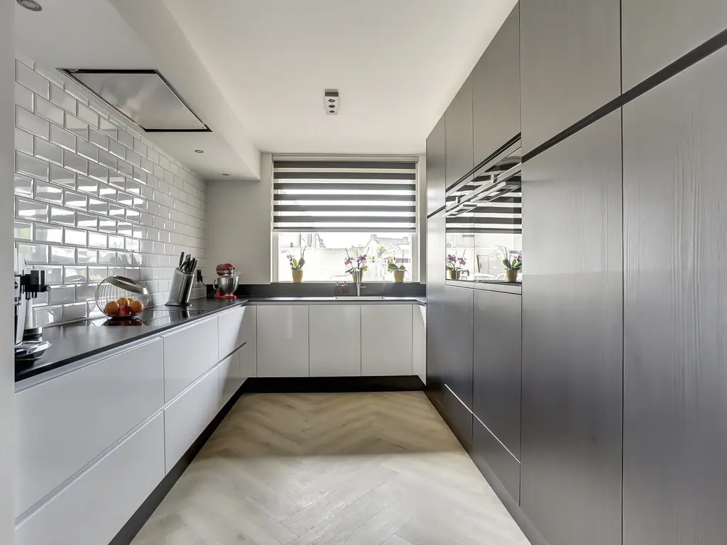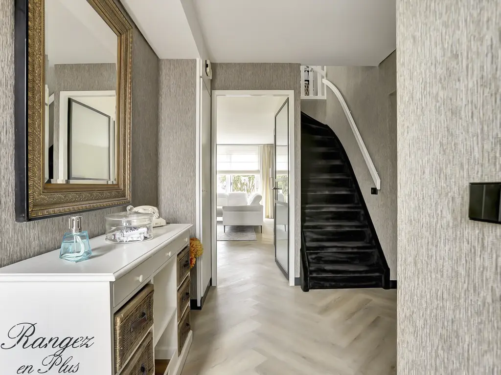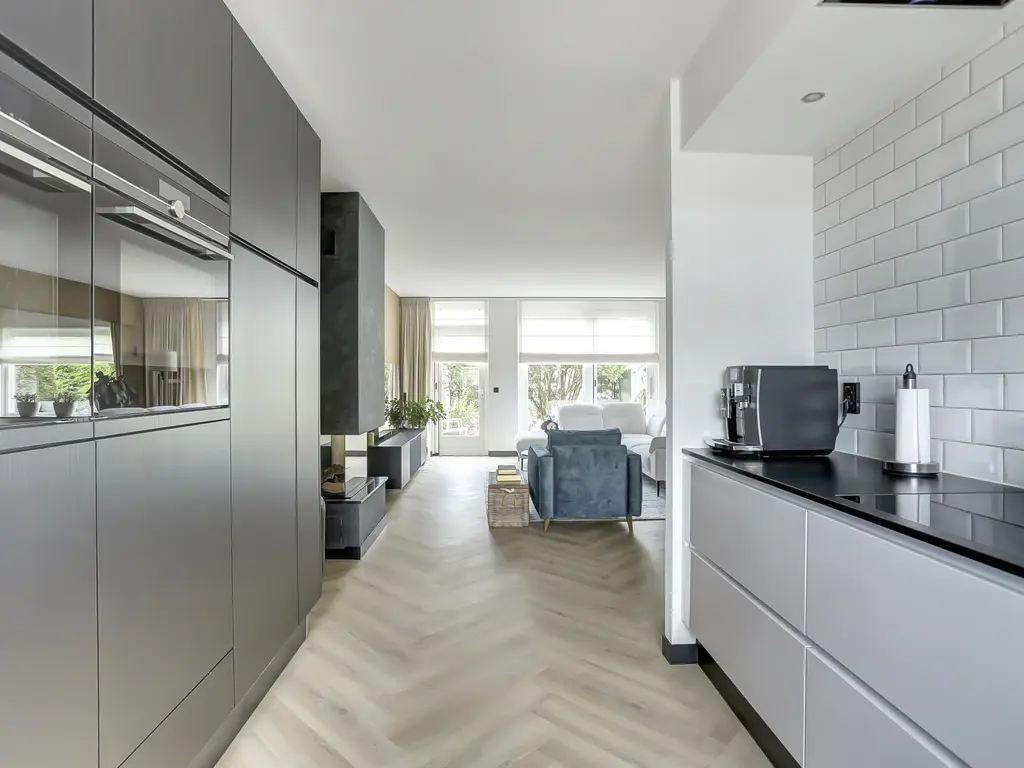 De luxe keuken in U-opstelling is een droom voor elke kookliefhebber. Compleet uitgerust met hoogwaardige inbouwapparatuur waaronder een koelkast, vriezer, vaatwasser, Quooker, inductiekookplaat, conventionele oven, stoomcombimagnetron en een afzuigkap fraai verwerkt in een verlaagd plafond met inbouwspots.