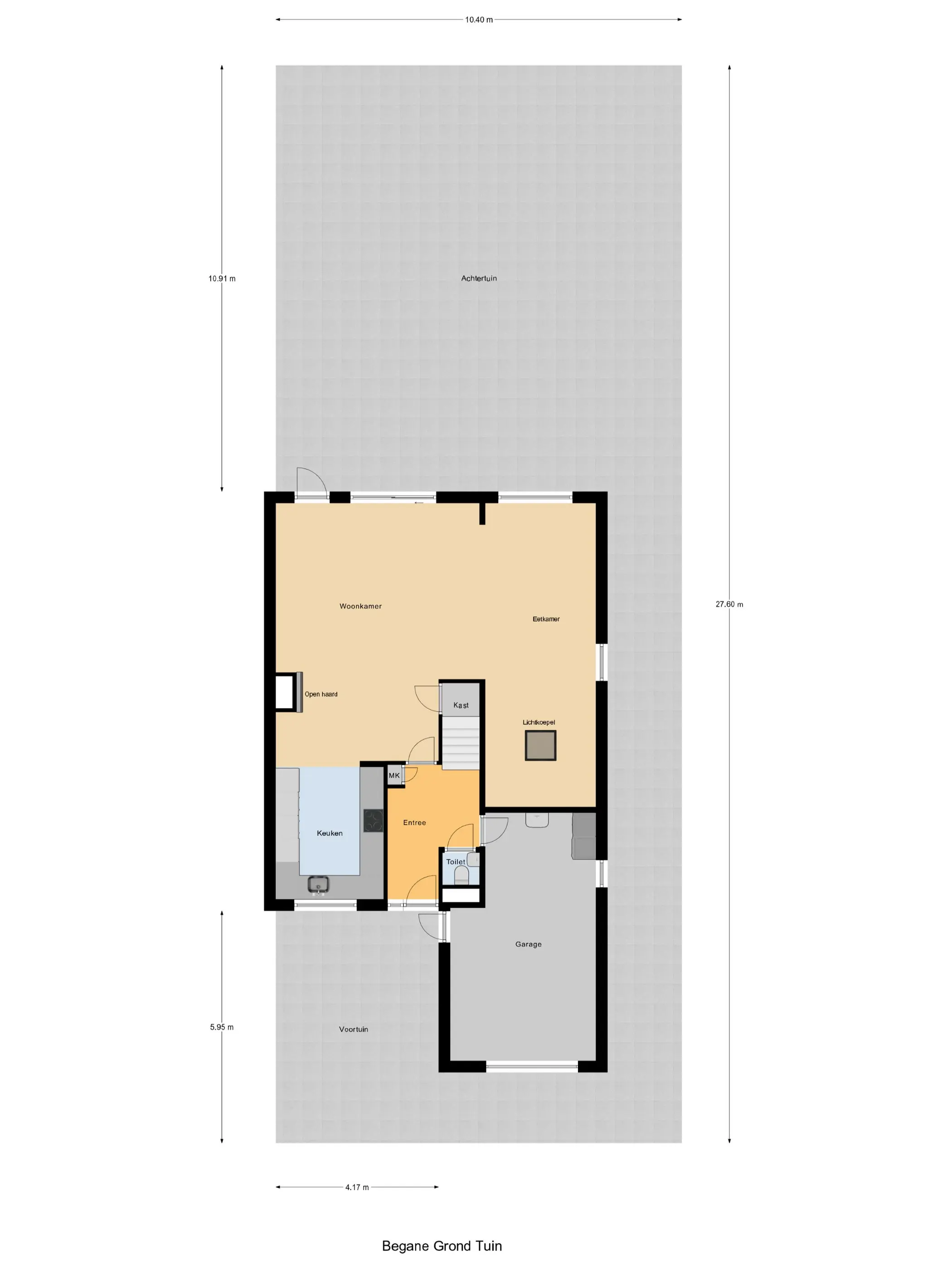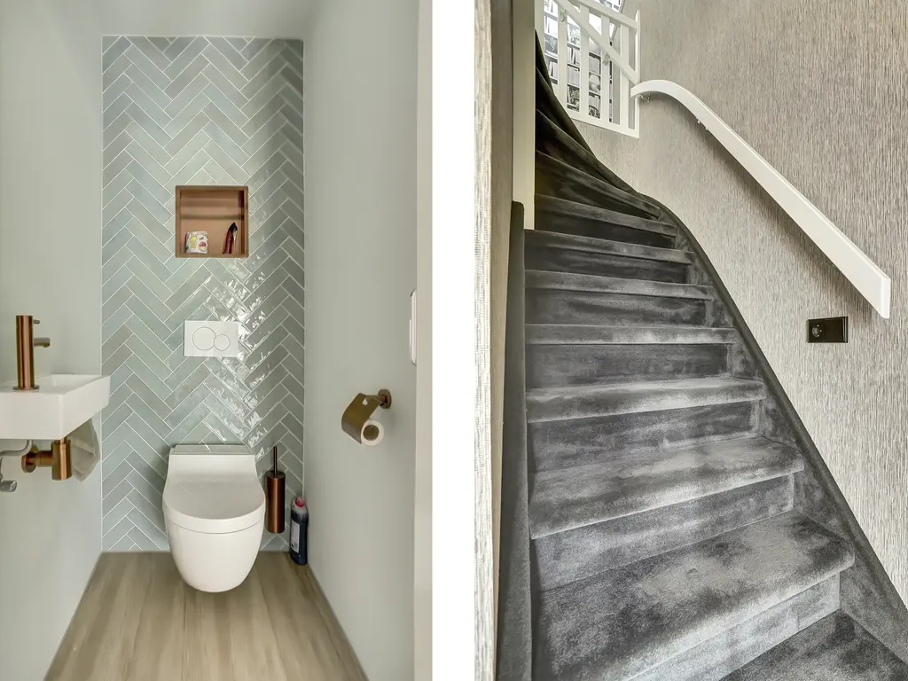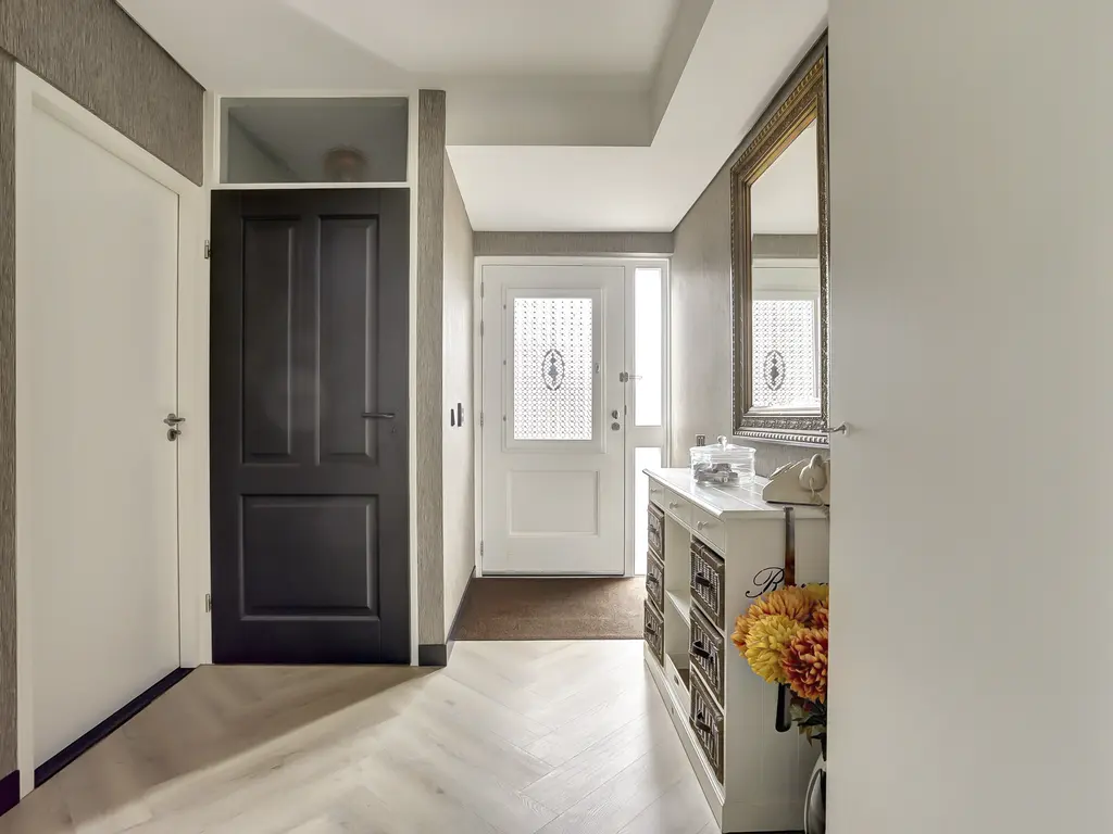 Via de eigen oprit bereik je de entree van de woning. In de hal vind je de meterkast, een modern AquaClean-toilet en toegang tot de geïsoleerde garage met elektra, wasmachine- en drogeraansluiting en elektrische roldeur.