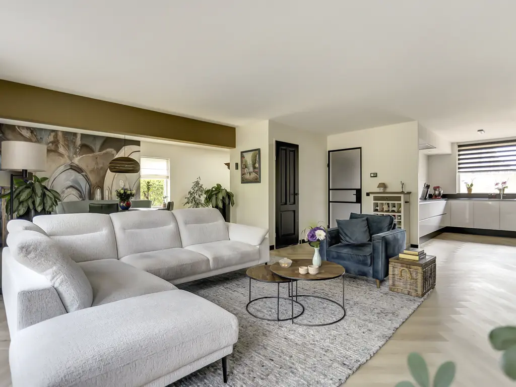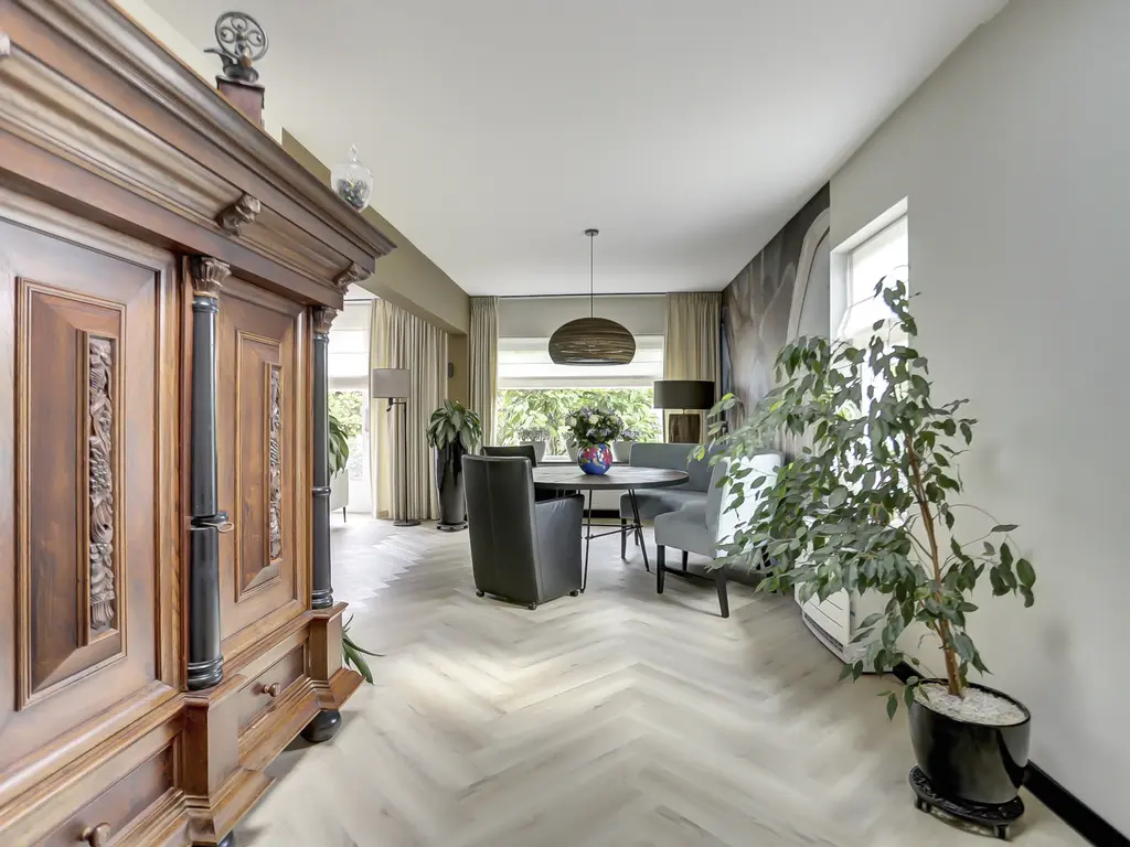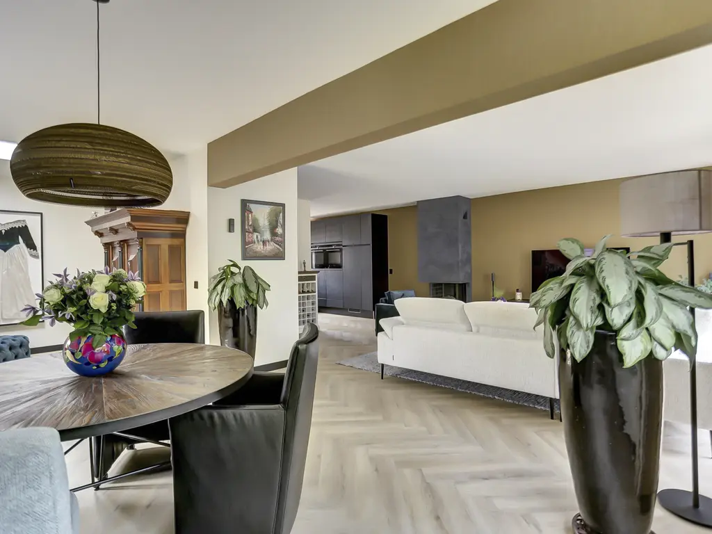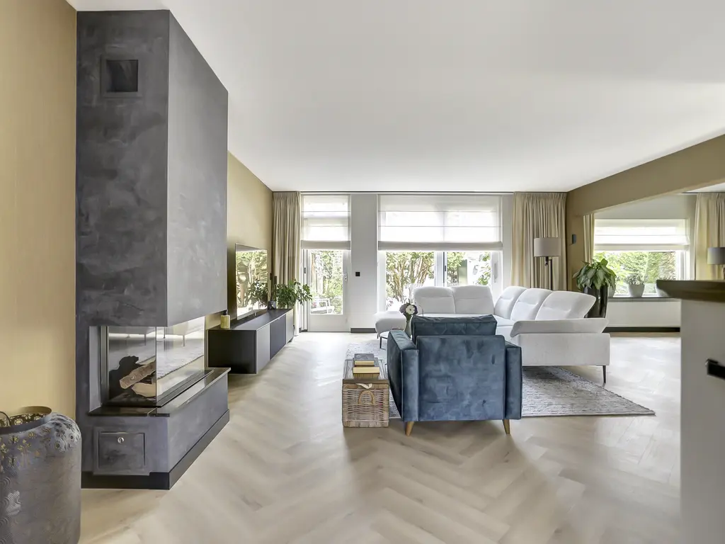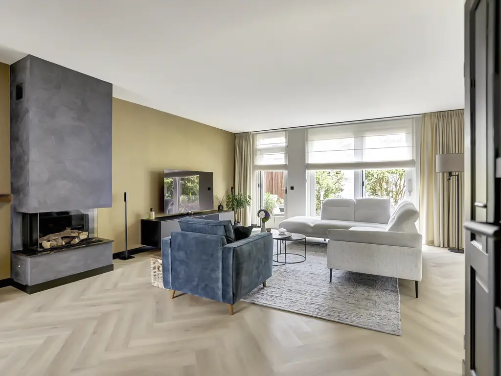 De lichte en sfeervolle woonkamer is voorzien van een moderne visgraat PVC-vloer en een stijlvolle gashaard. De achtertuin is bereikbaar vanuit de woonkamer middels de schuifpui en heeft uitzicht op het groen – een heerlijke plek om te ontspannen.