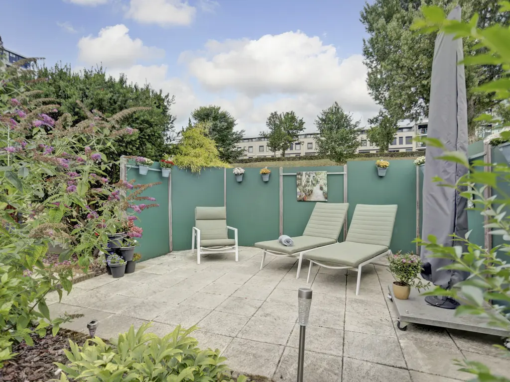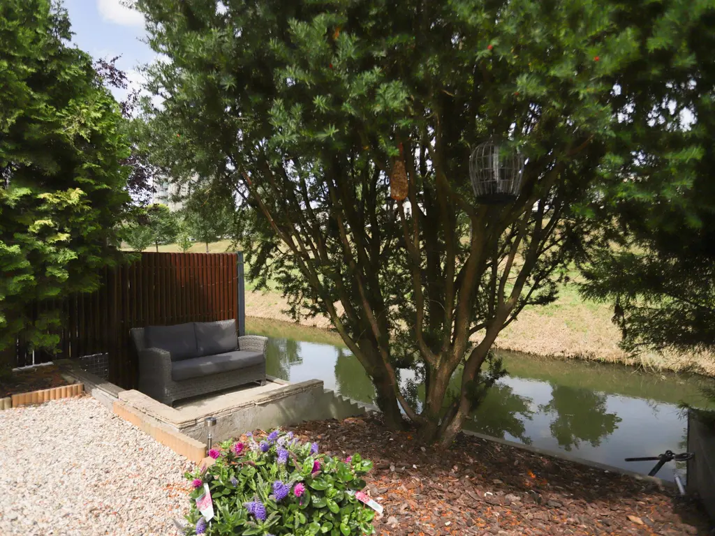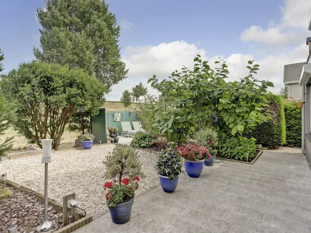 De fraai aangelegde achtertuin is gelegen aan het water en beschikt over meerdere terrassen, de ideale plek om in alle rust van de zon en natuur te genieten. Ook in de voortuin is voldoende ruimte voor het aanleggen van een extra parkeerplaats.