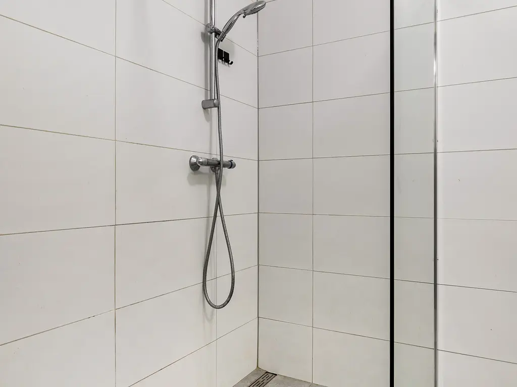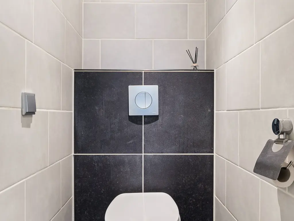 Middels een een deur in de woonkamer heb je toegang tot de 2 slaapkamers, modern separaat toilet en de badkamer. De badkamer is tot bovenaan betegeld en v.v. een inloopdouche, wastafel met meubel en wasmachine aansluiting.
