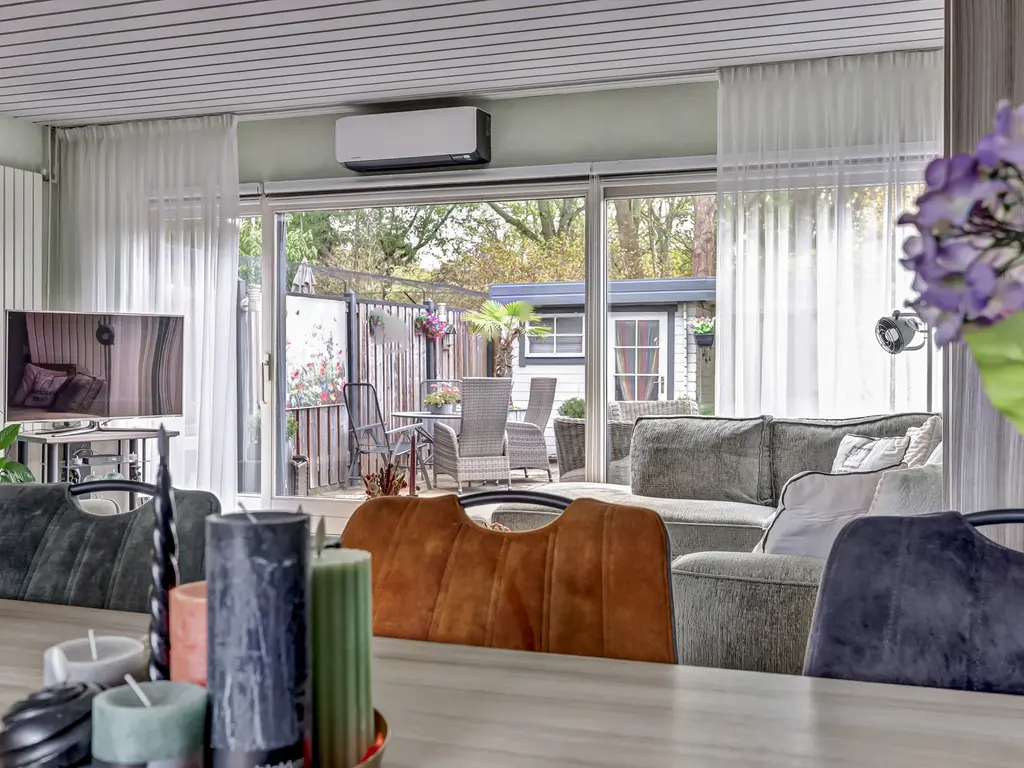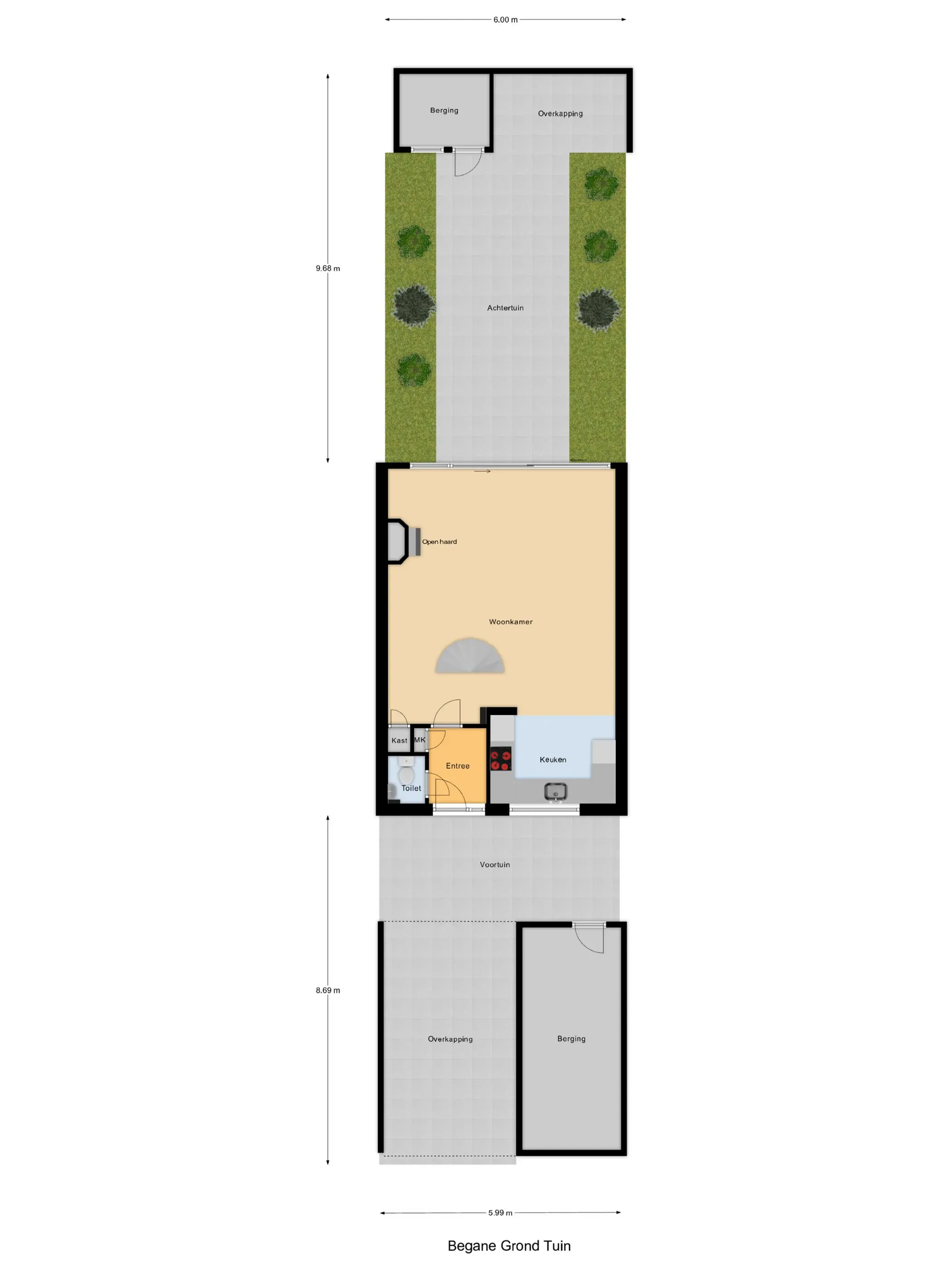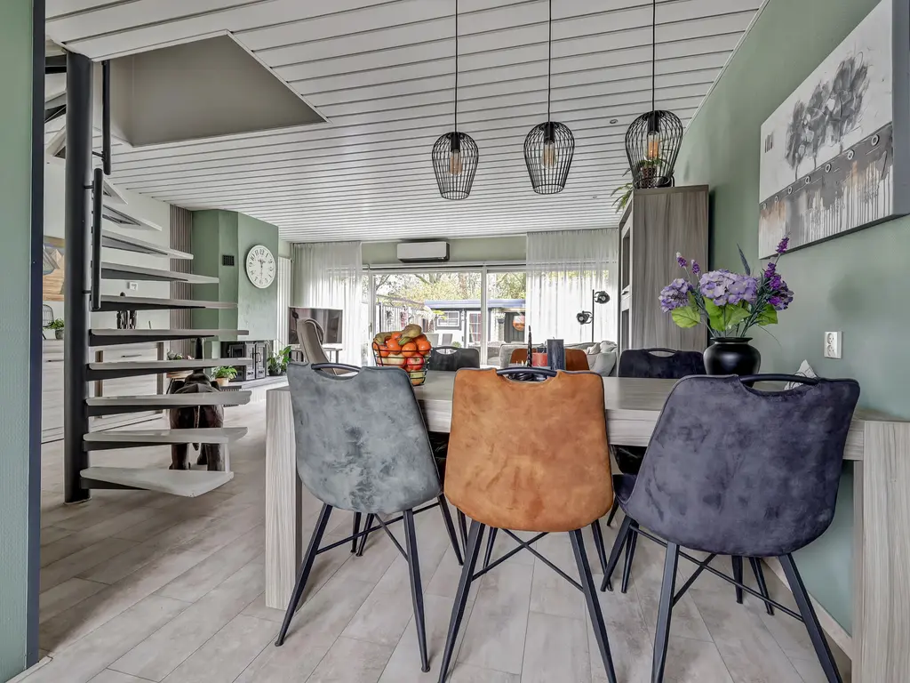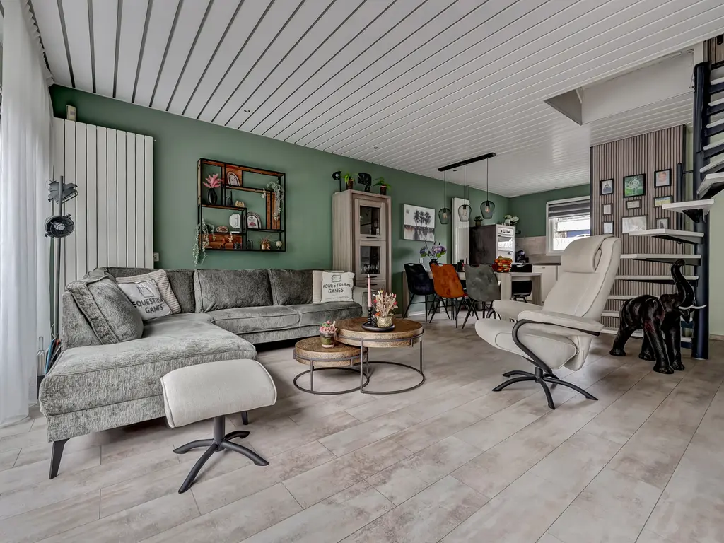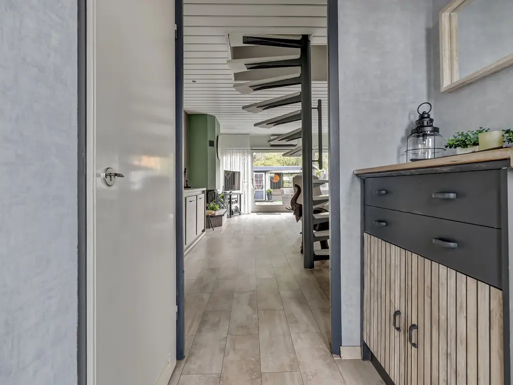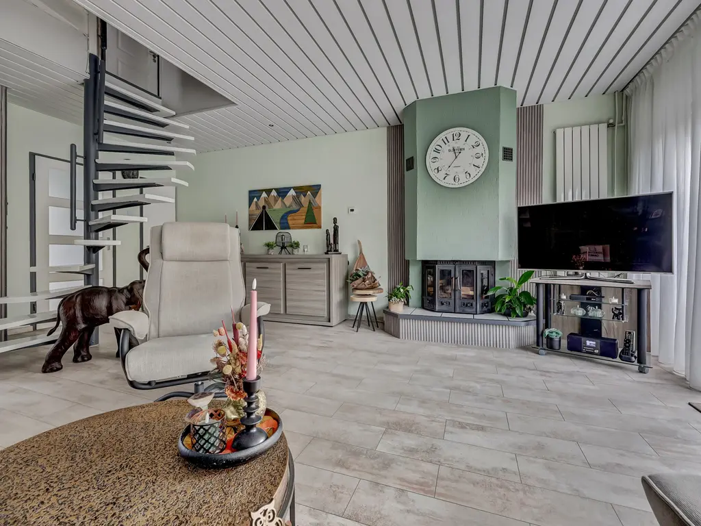 Begane grond: Via de voortuin met carport en stenen berging kom je bij de entree. De hal biedt toegang tot het toilet en de woonkamer. De ruime, lichte woonkamer is voorzien van laminaat, airco’s, een open haard en een wenteltrap naar de eerste verdieping. Dankzij de schuifpui loop je zo de zonnige tuin op, waar een overkapping en groen uitzicht zorgen voor een heerlijke buitenbeleving. De open keuken aan de voorzijde is voorzien van diverse inbouwapparatuur: oven, keramische kookplaat, vaatwasser, koelkast en vriezer.