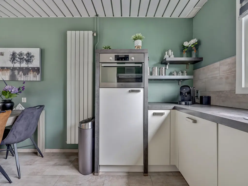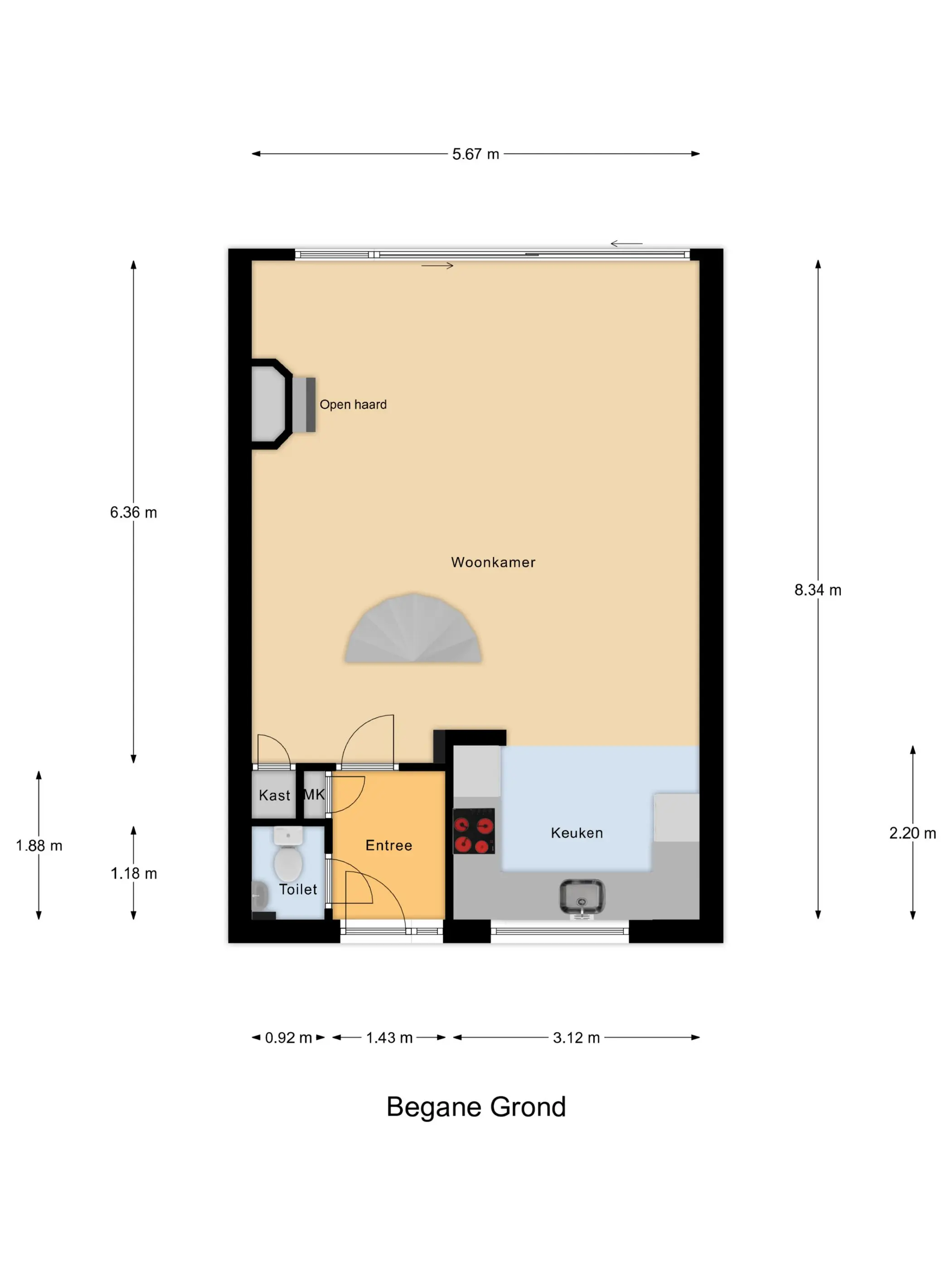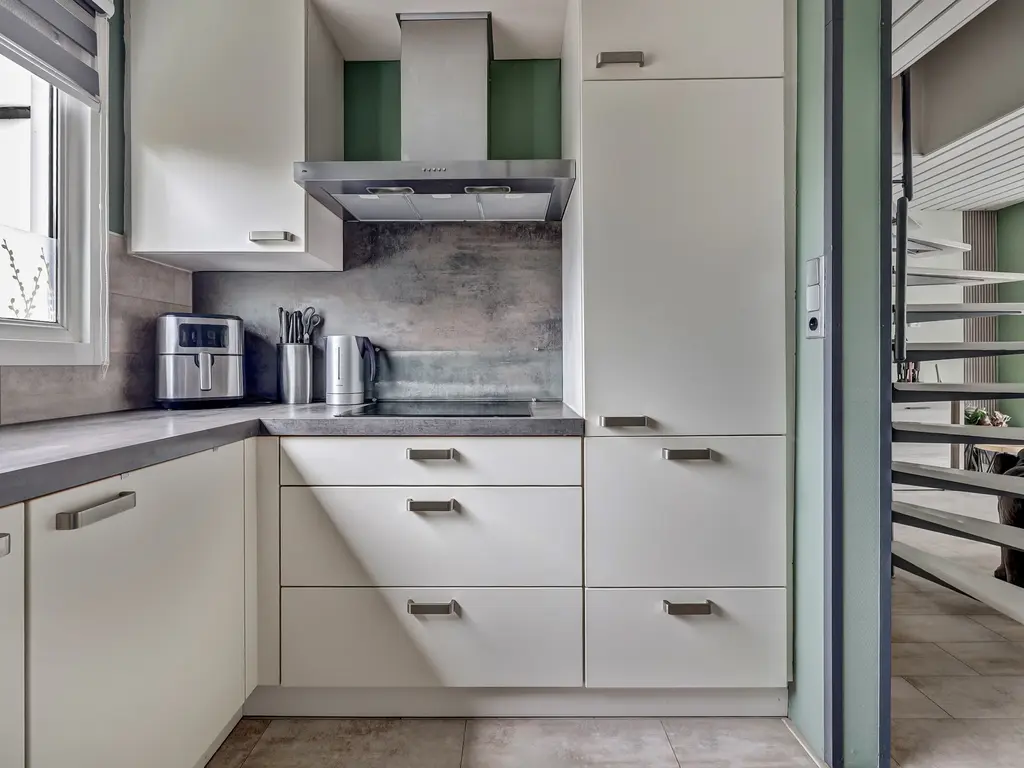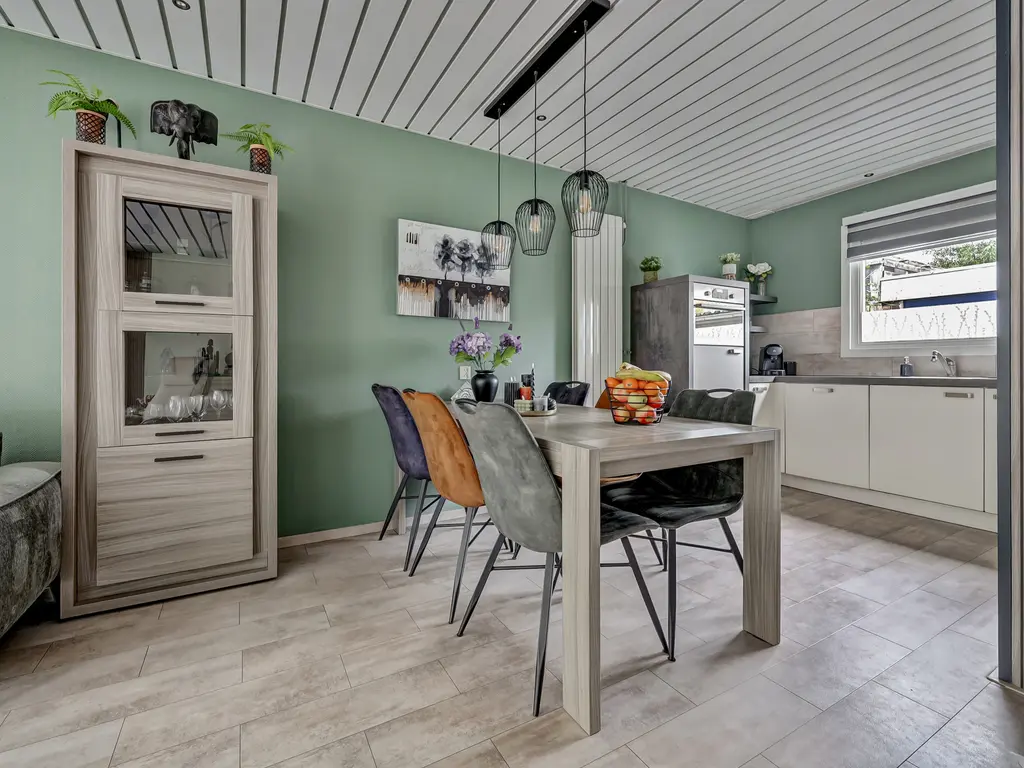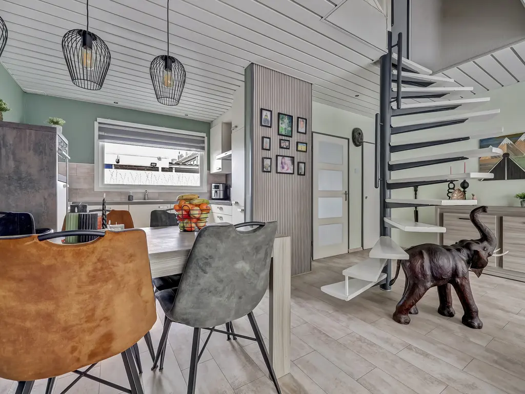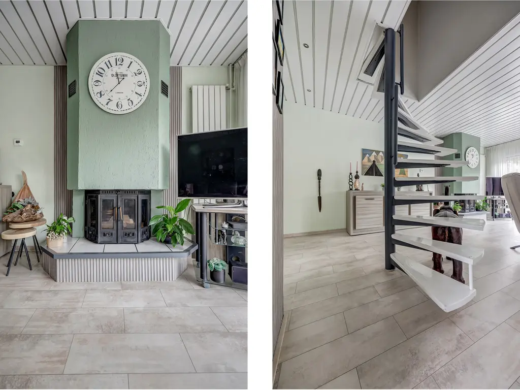 Begane grond: Via de voortuin met carport en stenen berging kom je bij de entree. De hal biedt toegang tot het toilet en de woonkamer. De ruime, lichte woonkamer is voorzien van laminaat, airco’s, een open haard en een wenteltrap naar de eerste verdieping. Dankzij de schuifpui loop je zo de zonnige tuin op, waar een overkapping en groen uitzicht zorgen voor een heerlijke buitenbeleving. De open keuken aan de voorzijde is voorzien van diverse inbouwapparatuur: oven, keramische kookplaat, vaatwasser, koelkast en vriezer.