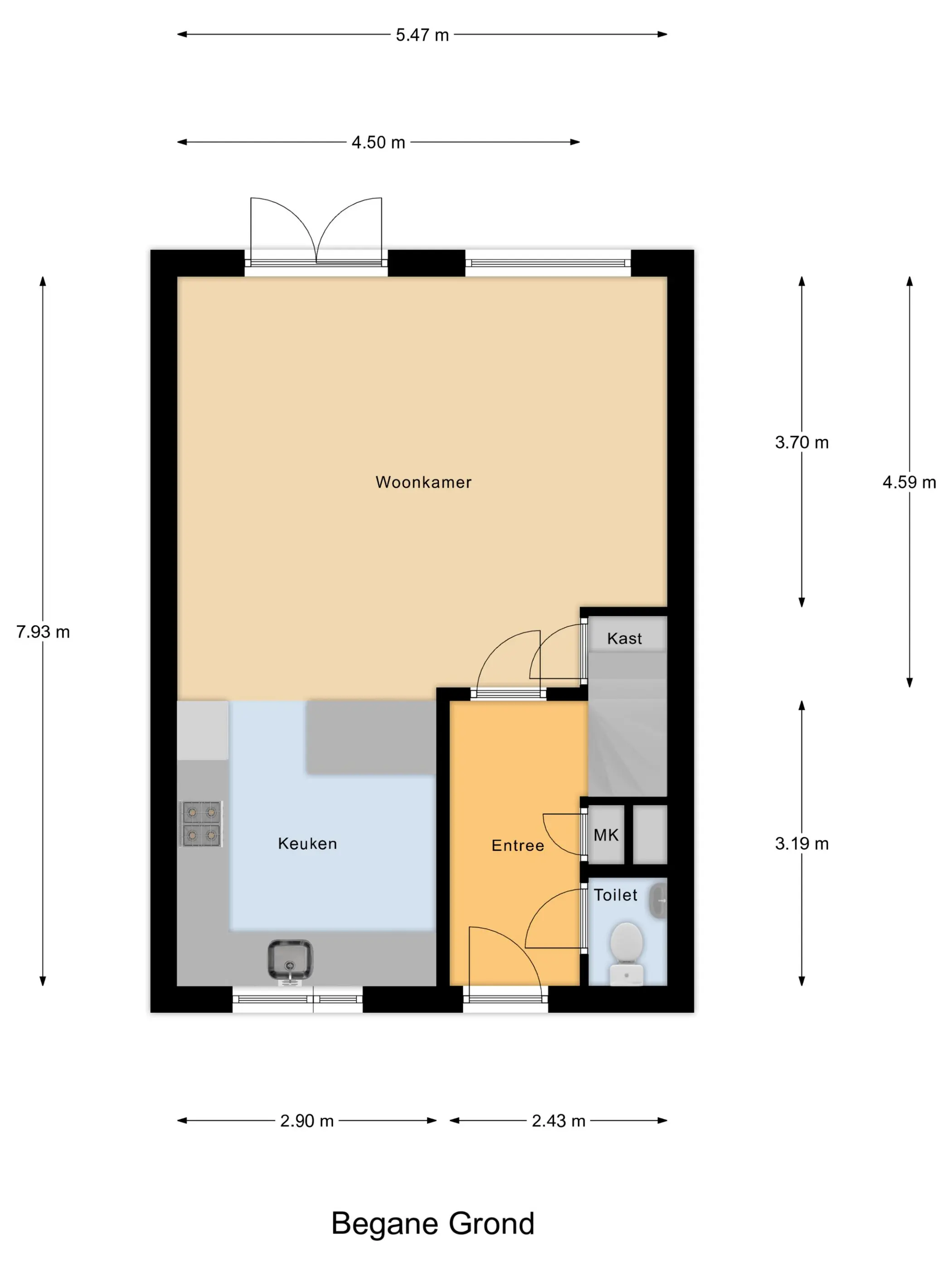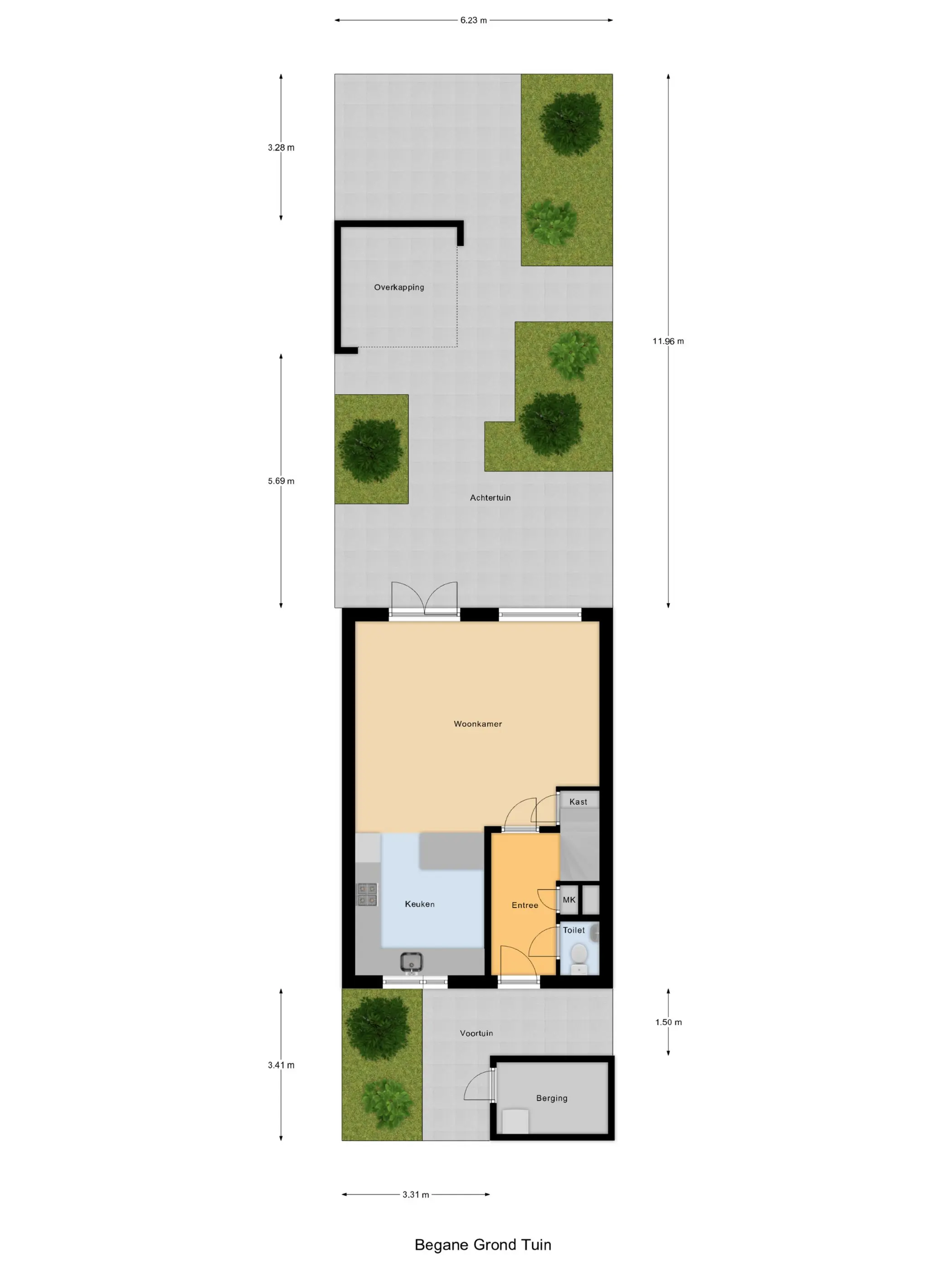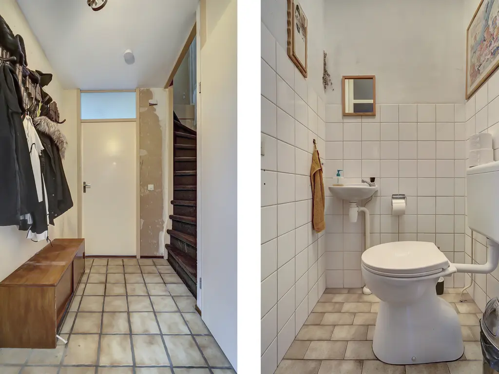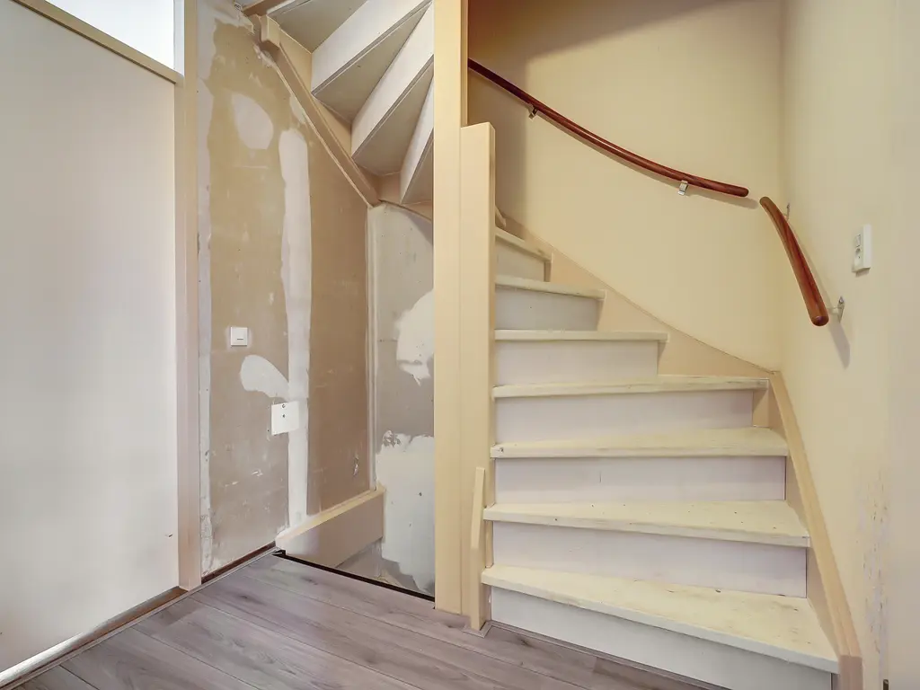 Begane grond: Via de entree kom je in de hal met toilet, meterkast en trapopgang naar de eerste verdieping. De ruime, tuingerichte woonkamer is voorzien van een laminaatvloer en biedt via de deur toegang tot de zonnige achtertuin met een gezellige overkapping – een perfecte plek om te ontspannen, ongeacht het weer.