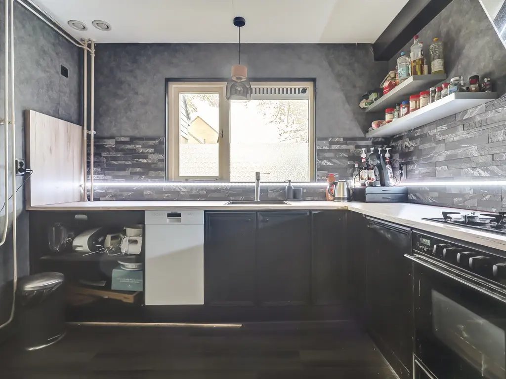 De open keuken aan de voorzijde heeft een praktische hoekopstelling en is uitgerust met diverse inbouwapparatuur, waaronder een koelkast, vriezer, vaatwasser, gaskookplaat, afzuigkap en oven.