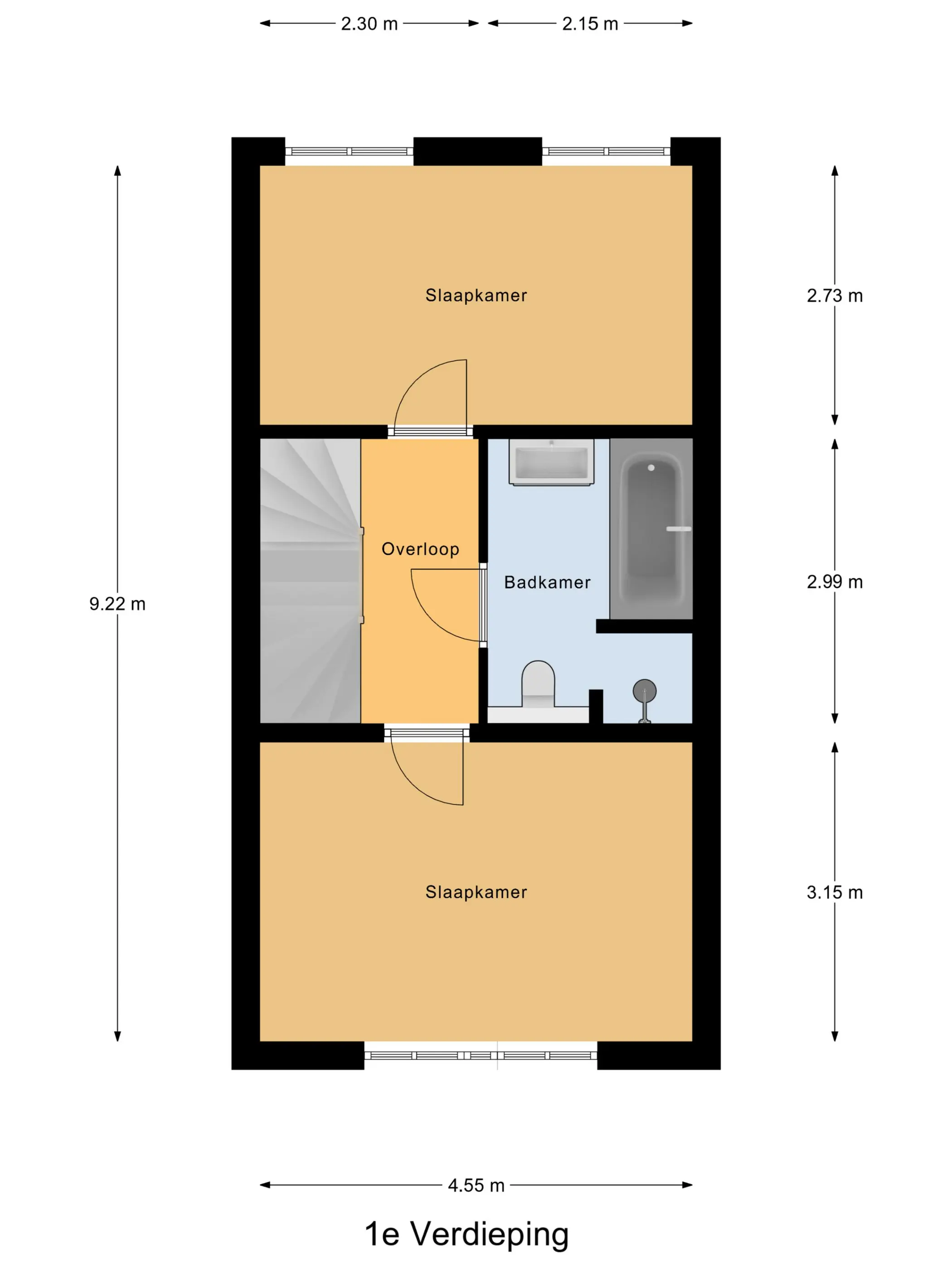 Eerste verdieping: De overloop biedt toegang tot 2 (voorheen 3) comfortabele slaapkamers, allen voorzien van een laminaatvloer, rolluiken (voorzijde elektrisch, achterzijde manueel) en horren – ideaal voor een goede nachtrust. De vergrote volledig betegelde badkamer beschikt over een inloopdouche, tweede toilet, ligbad en een wastafel met meubel.