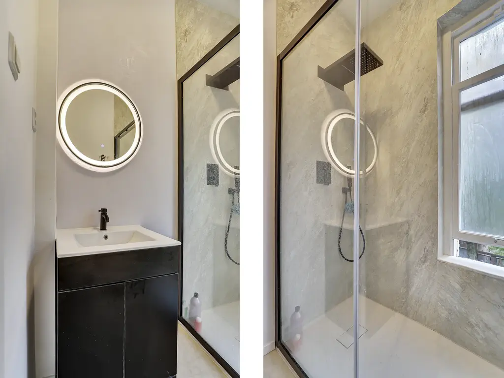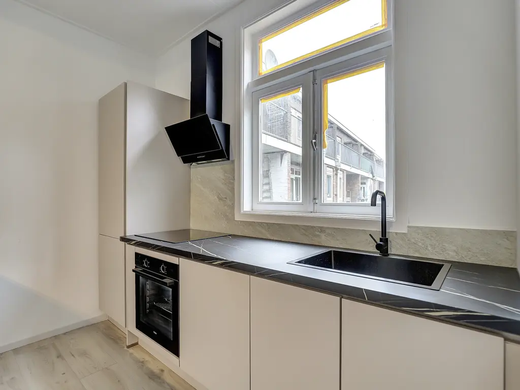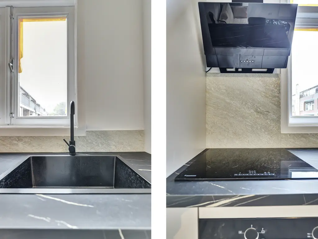 Tweede verdieping: Entree met hal, meterkast en toegang tot de eerste slaapkamer (of werkkamer) en een separaat toilet met fonteintje. De moderne badkamer (2025) is voorzien van een inloopdouche en een wastafelmeubel. De lichte woonkamer is strak afgewerkt met laminaatvloer en gladde wanden. De open keuken (2025) heeft een stijlvolle wandopstelling en is uitgerust met een inductiekookplaat, afzuigkap, combi-oven, koelkast, vriezer en een gezellig kookeiland waar je kunt tafelen of borrelen.