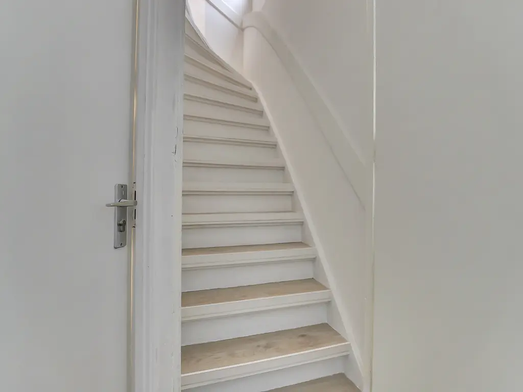 Derde verdieping: Via de interne trap bereik je de bovenste verdieping met een ruime hoofdslaapkamer, eveneens voorzien van laminaatvloer en strakke afwerking.