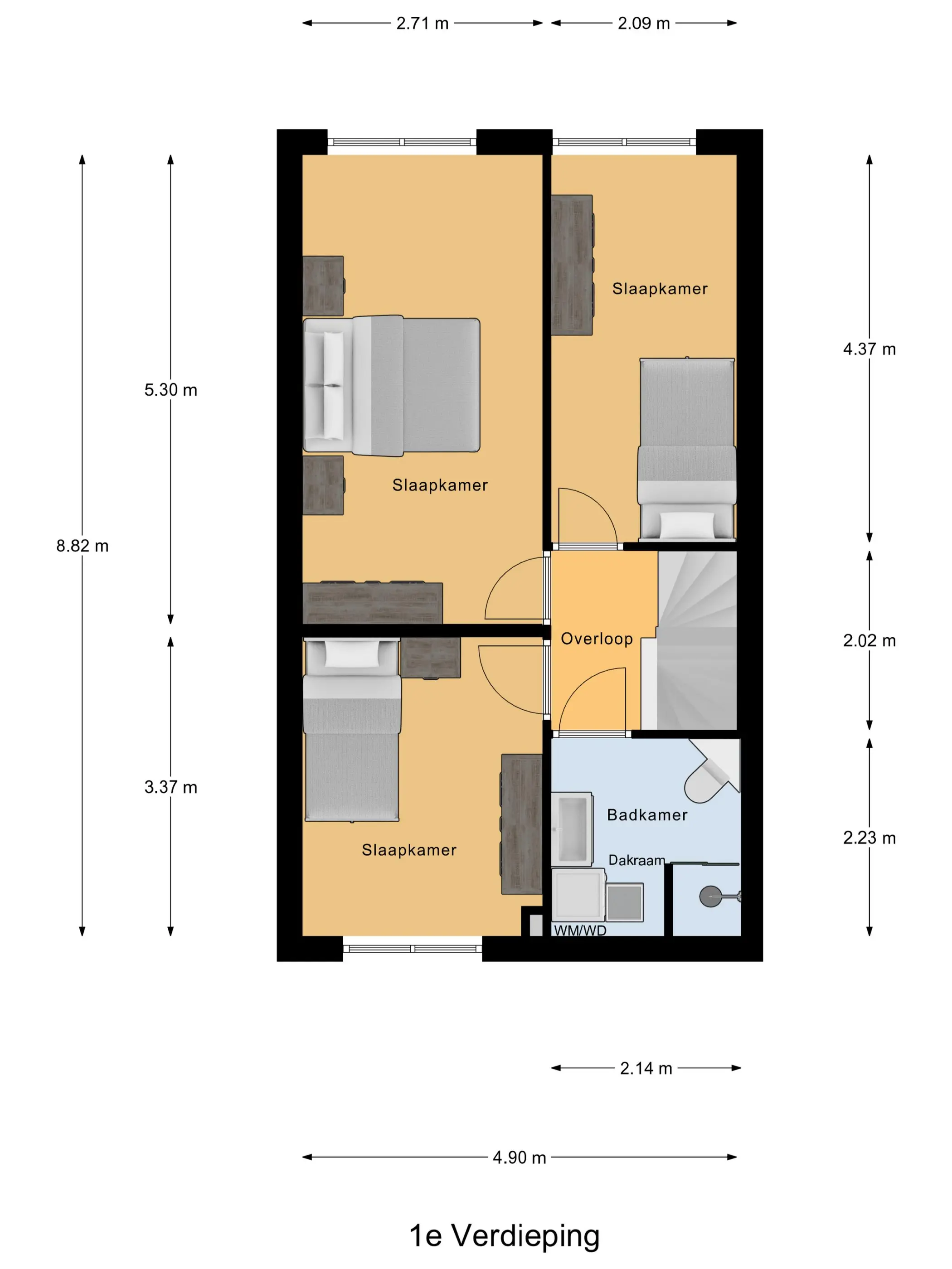 Eerste verdieping: De overloop geeft toegang tot drie ruime slaapkamers, allen met rechte gevels en voorzien van een nette laminaatvloer. De moderne badkamer is volledig betegeld en beschikt over een inloopdouche, wastafelmeubel, tweede toilet, dakraam en aansluitingen voor wasmachine en droger.