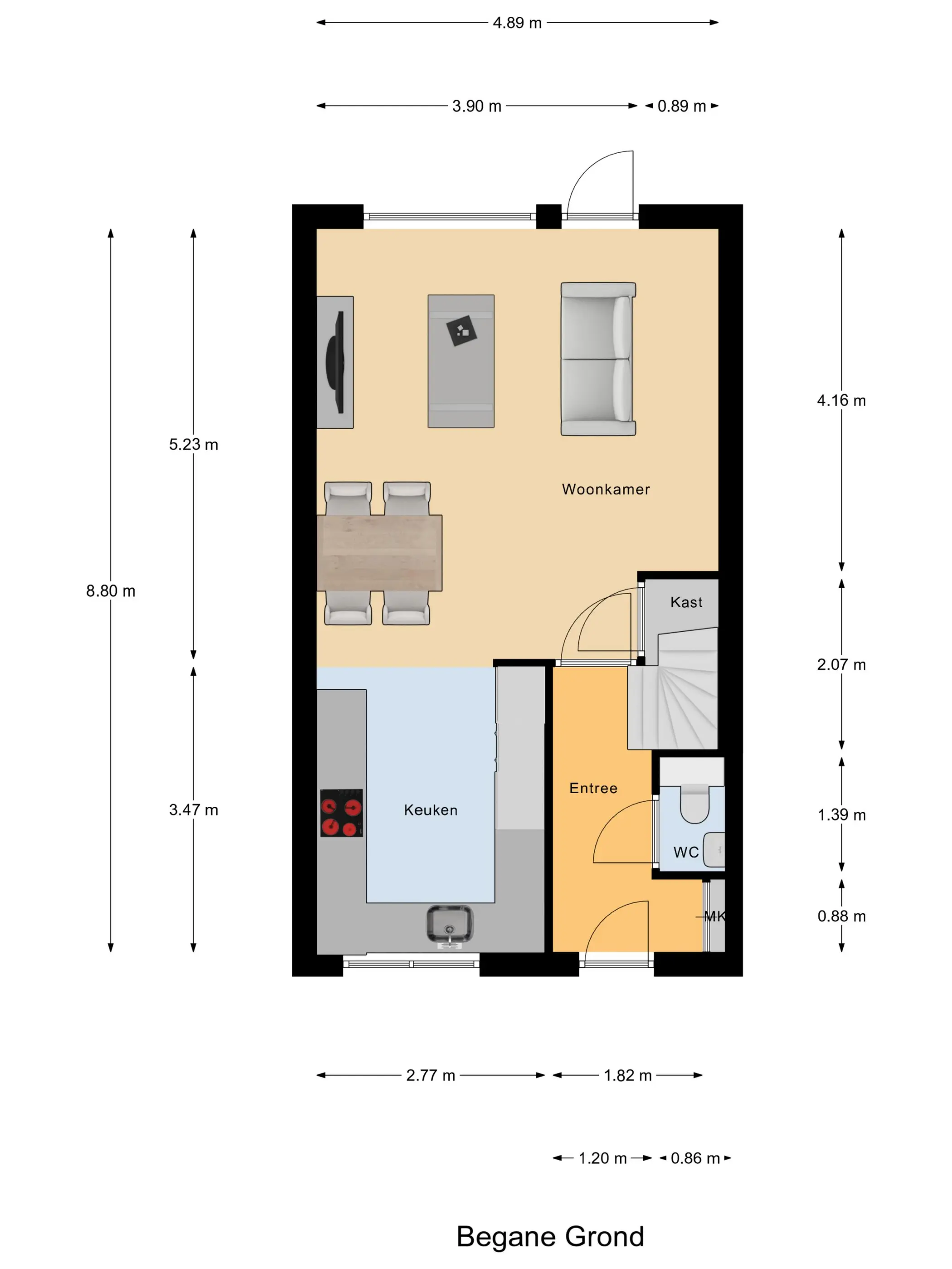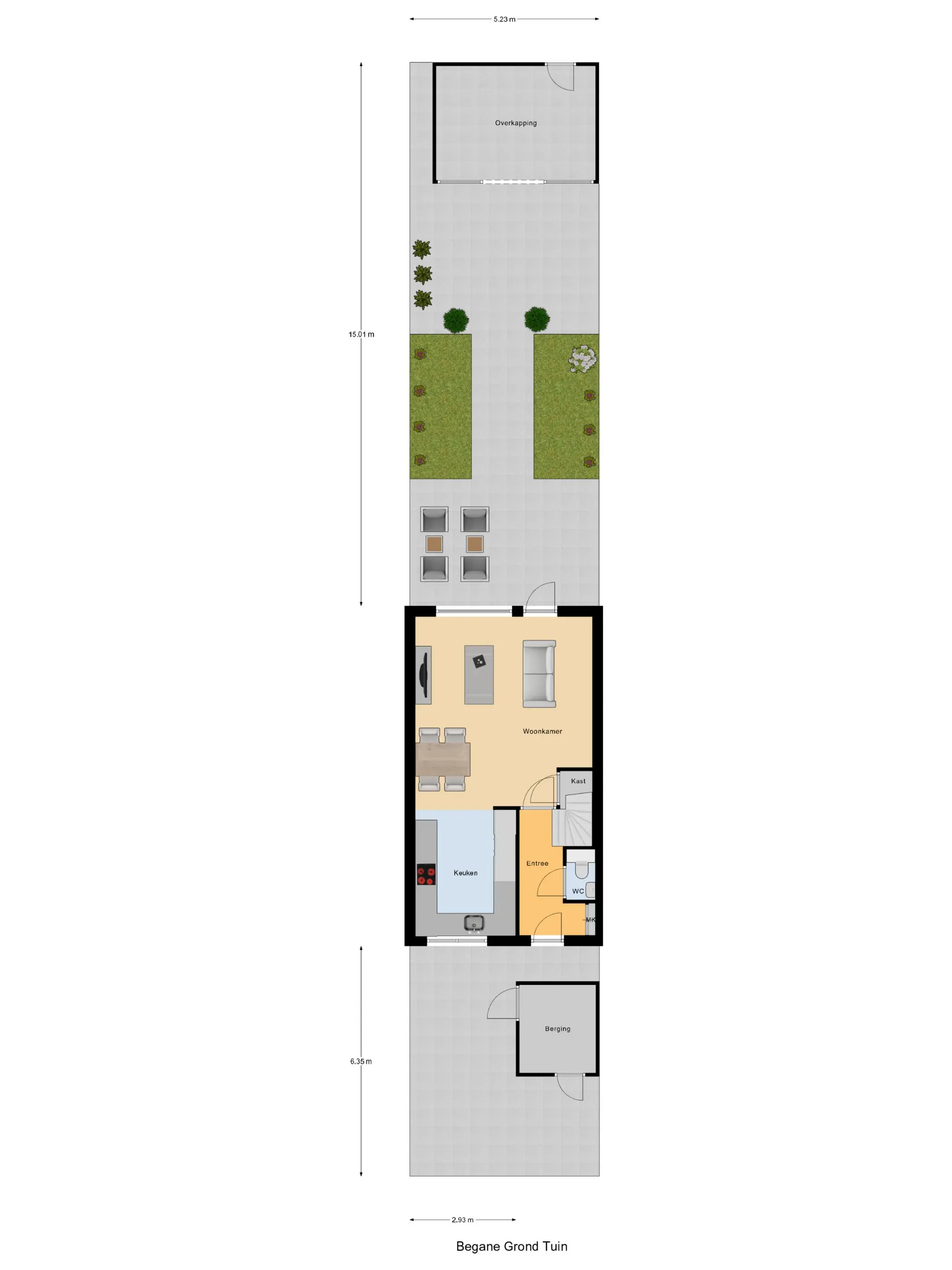 Begane grond: Via de entree/hal met meterkast, toilet en trapopgang betreed je de woning. De lichte woonkamer is strak afgewerkt en voorzien van een mooie PVC-vloer met vloerverwarming. Vanuit de woonkamer heb je toegang tot de zonnige, onderhoudsvriendelijke tuin op het zuidoosten, volledig bestraat en voorzien van een overkapping, achterom en houten berging – ideaal om het hele jaar door van buiten te genieten.