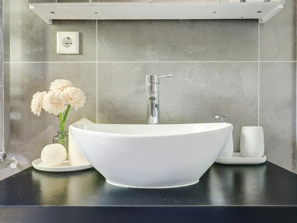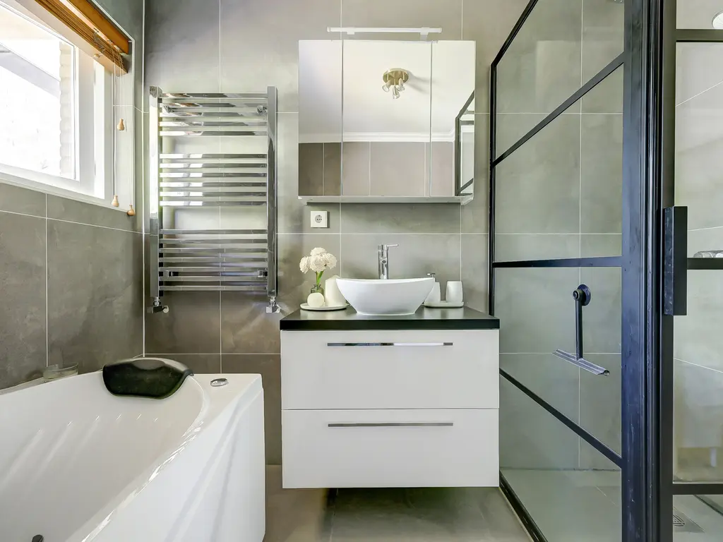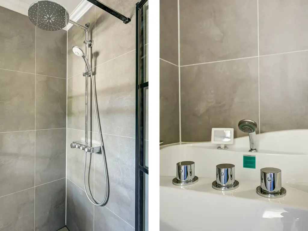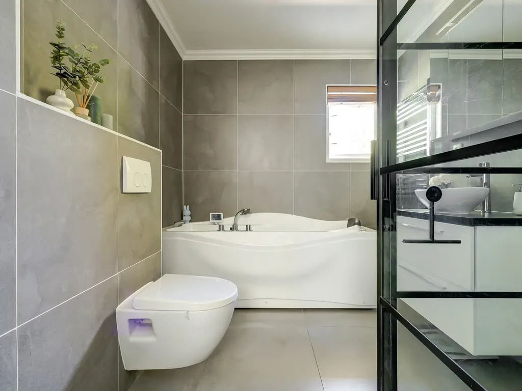 De badkamer (2019) is modern en compleet: geheel betegeld, met 2e toilet, wastafelmeubel, inloopdouche en whirlpool ligbad.