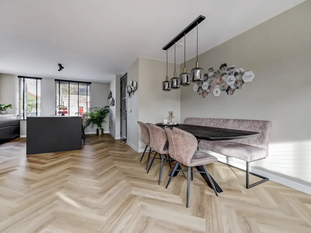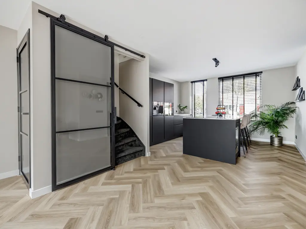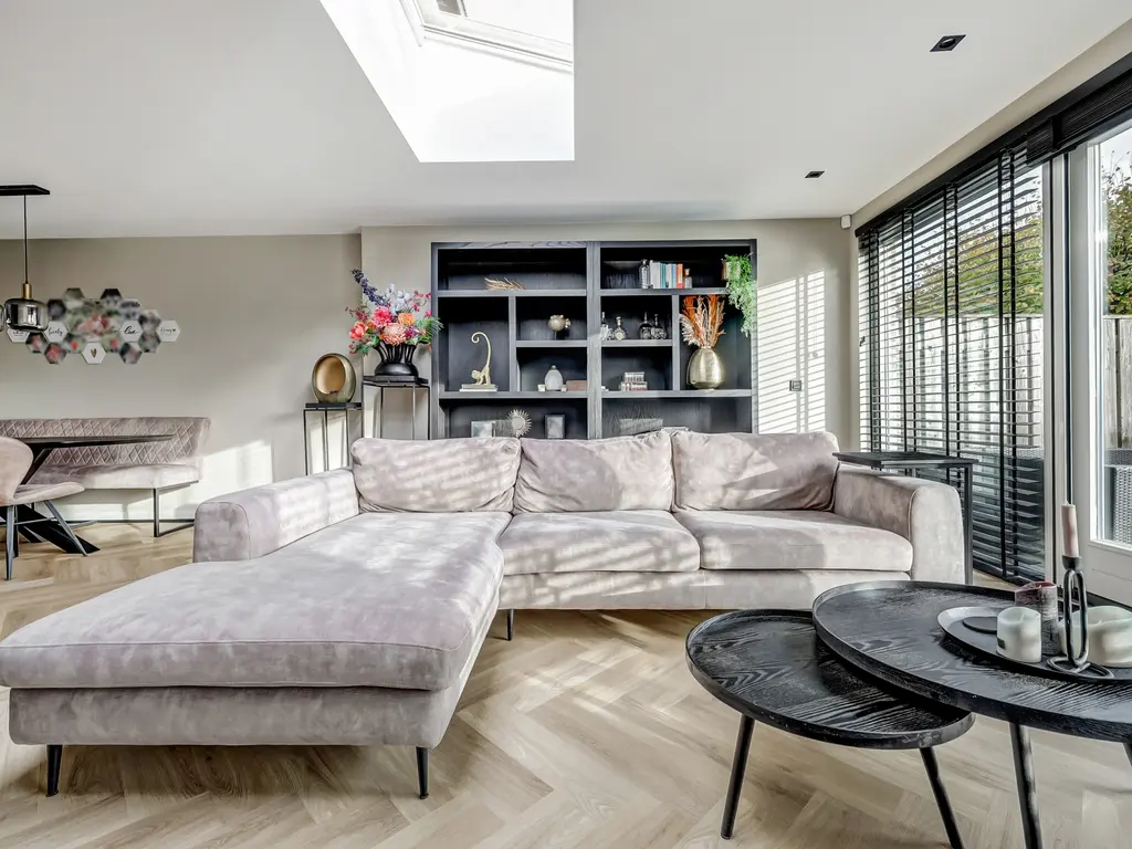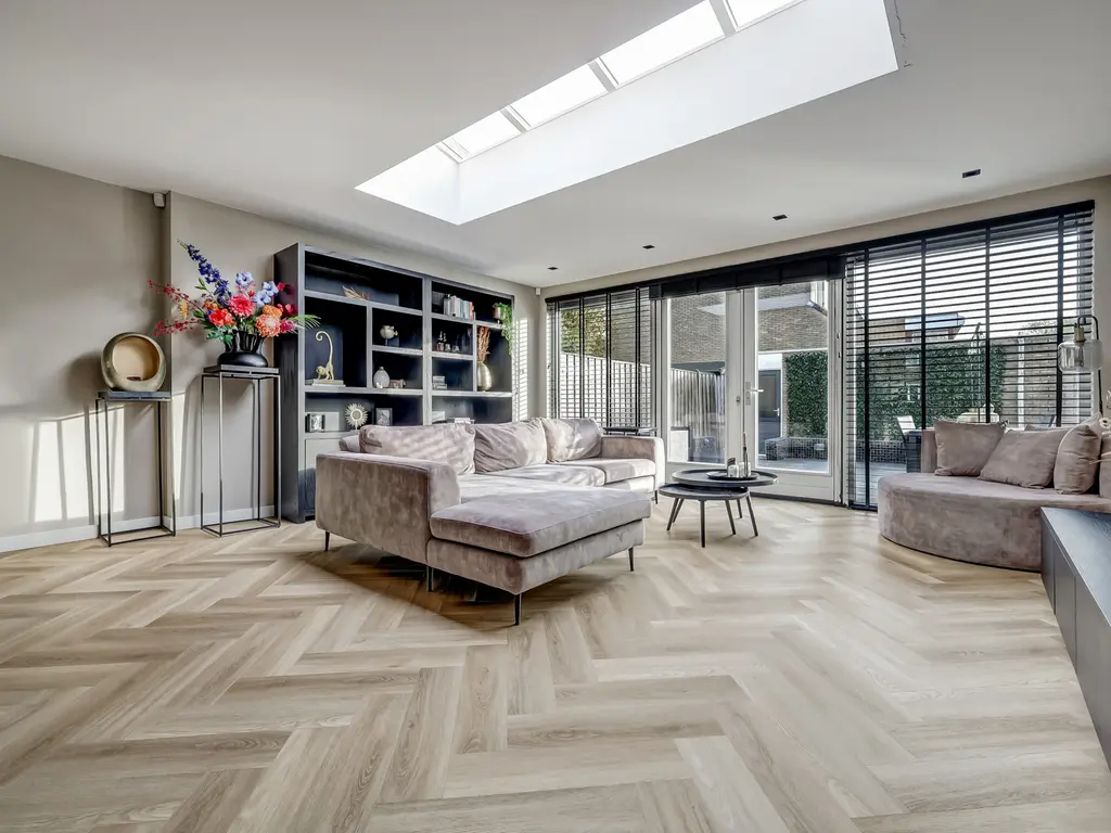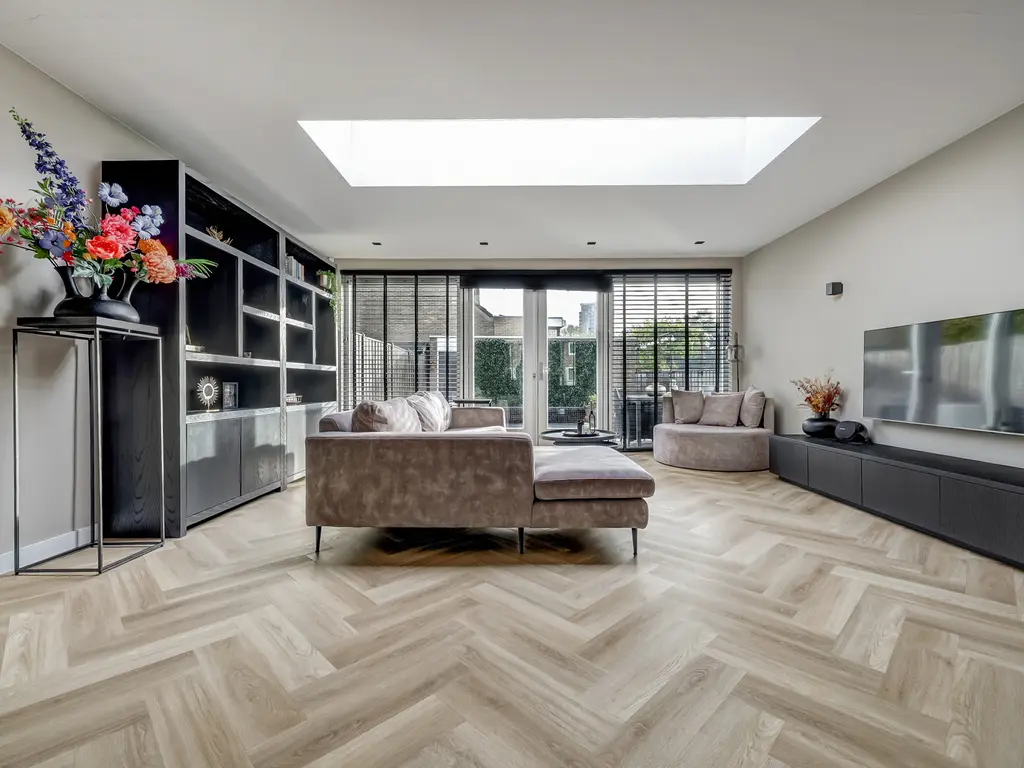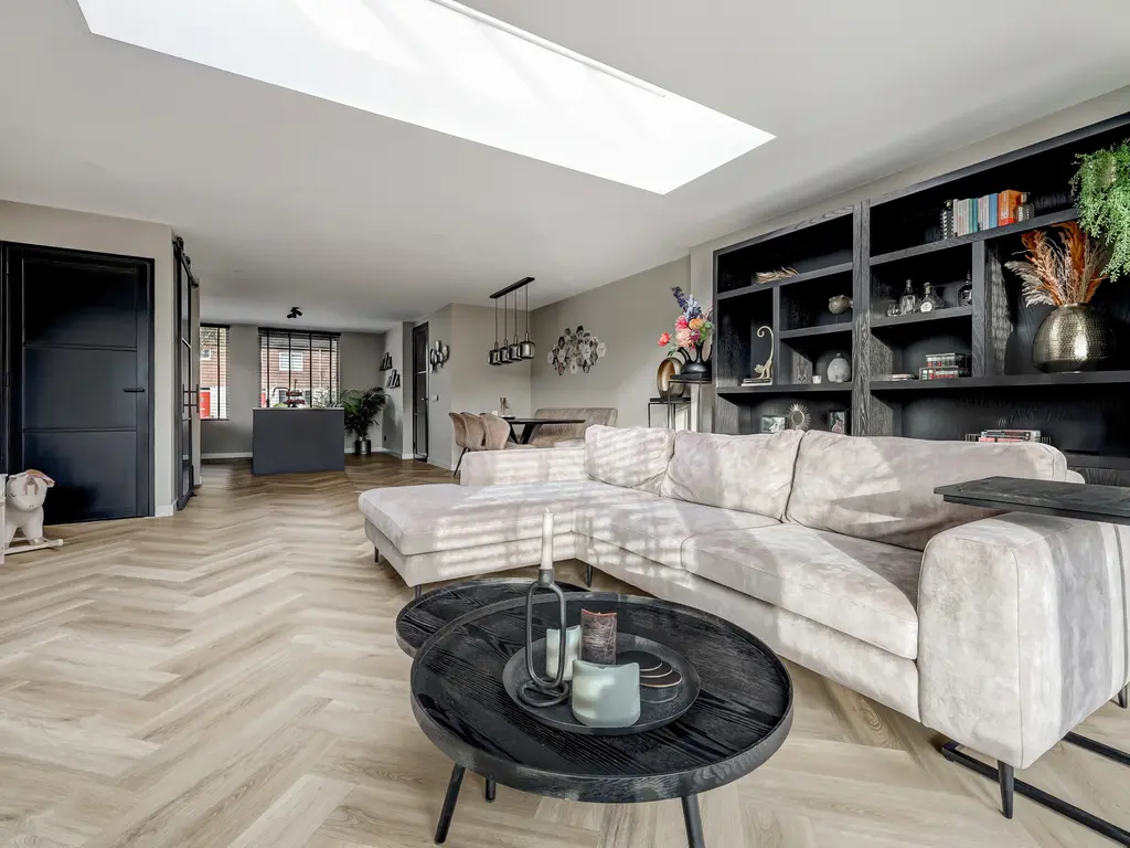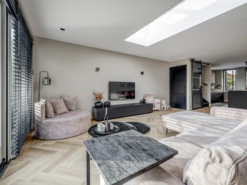Begane grond: Via de entree met hal, moderne toiletruimte en meterkast stap je binnen in de lichte woonkamer. De uitbouw van 4 meter (2022) met lichtstraat voorzien van een screen (met afstandsbediening) zorgt voor extra leefruimte en een fijne, open sfeer. De stijlvolle PVC-visgraatvloer met vloerverwarming en gestuukte, strak afgewerkte muren geven het geheel een luxe uitstraling.