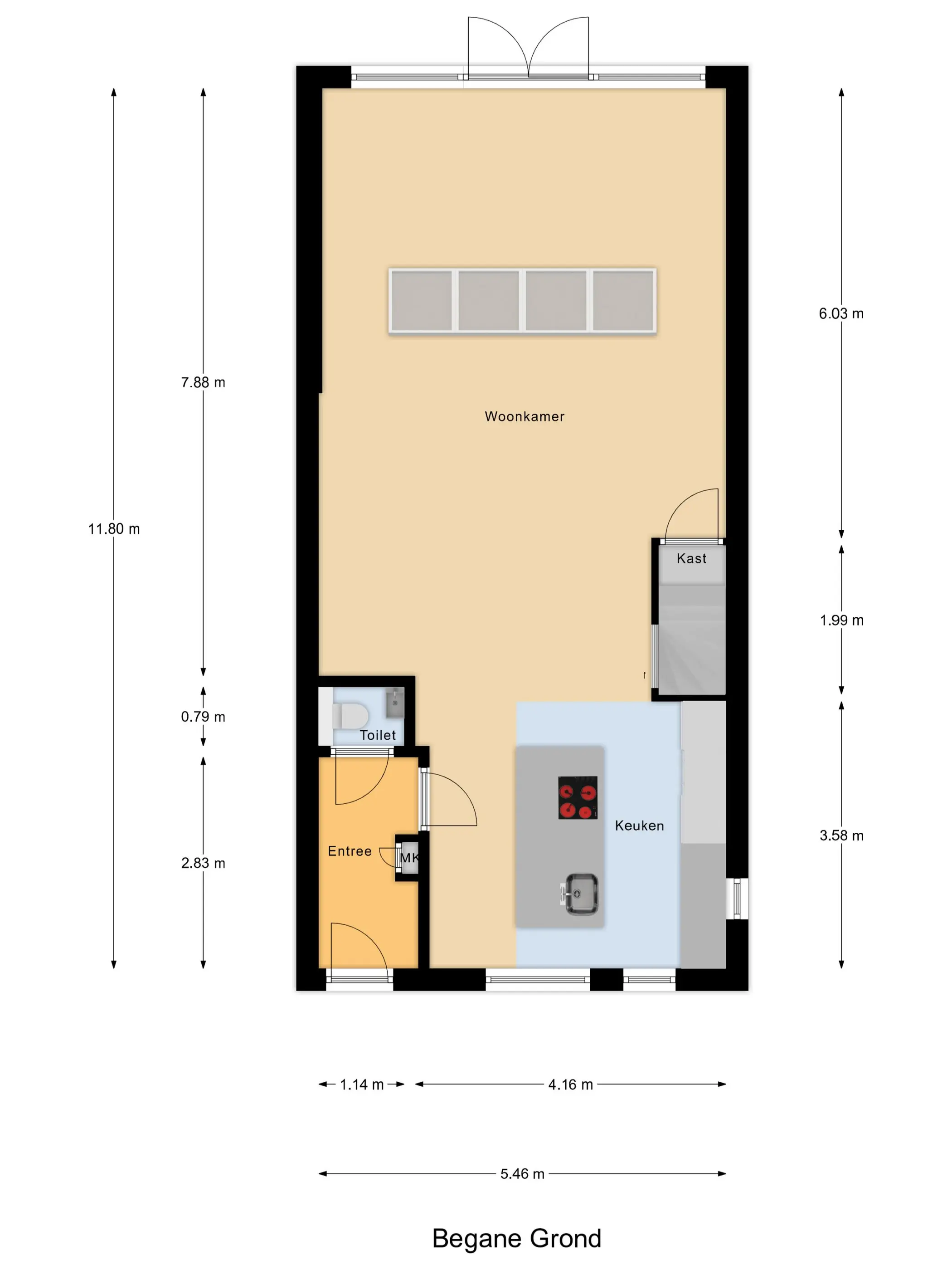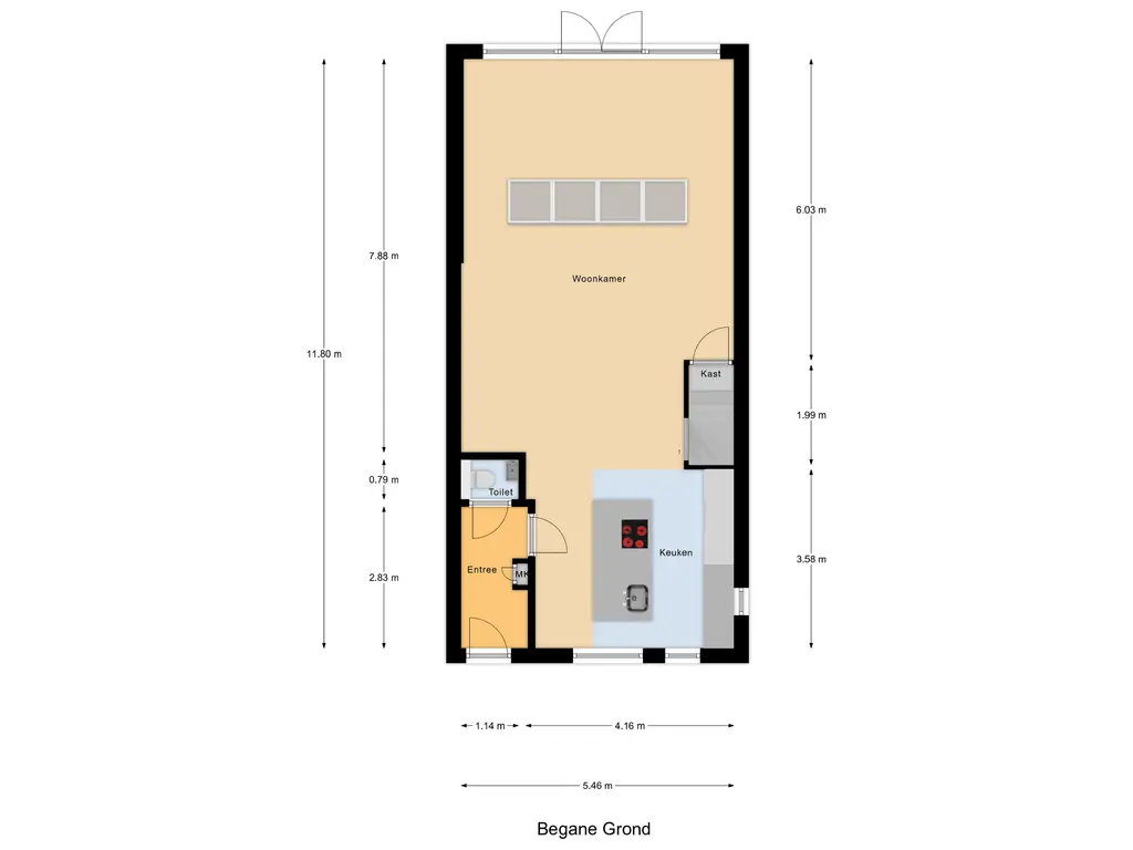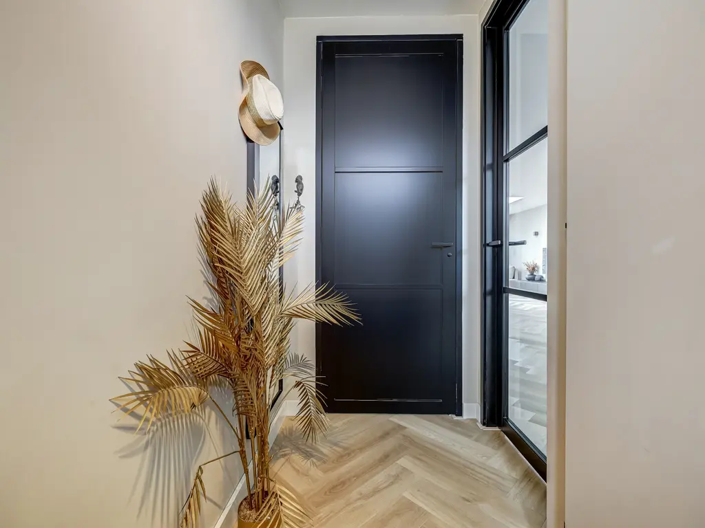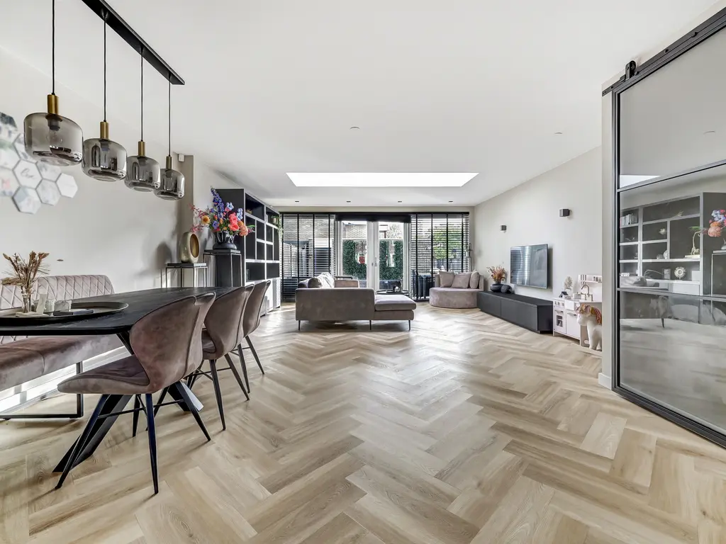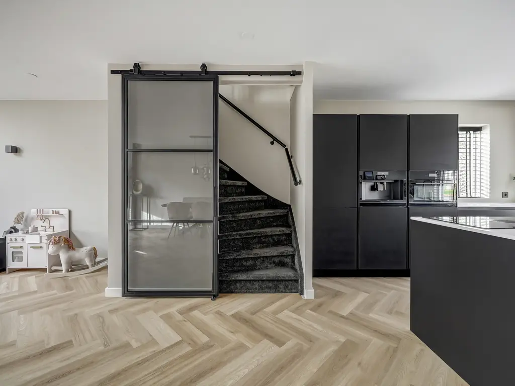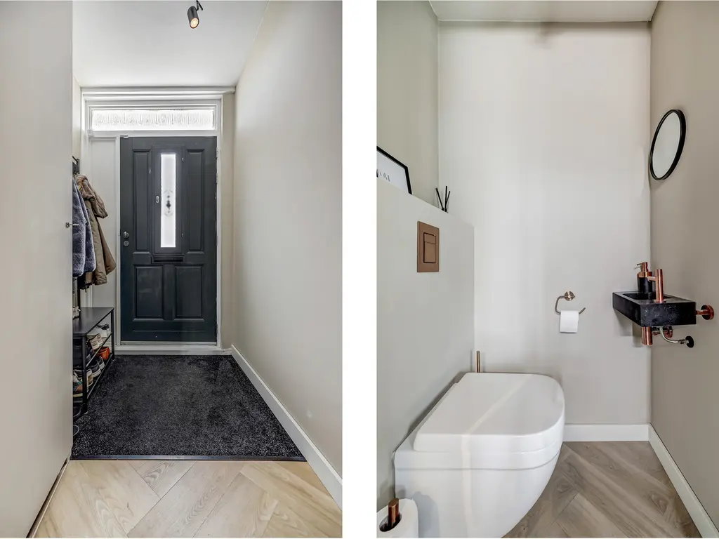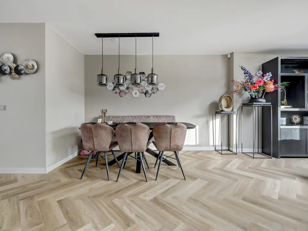 Begane grond: Via de entree met hal, moderne toiletruimte en meterkast stap je binnen in de lichte woonkamer. De uitbouw van 4 meter (2022) met lichtstraat voorzien van een screen (met afstandsbediening) zorgt voor extra leefruimte en een fijne, open sfeer. De stijlvolle PVC-visgraatvloer met vloerverwarming en gestuukte, strak afgewerkte muren geven het geheel een luxe uitstraling.