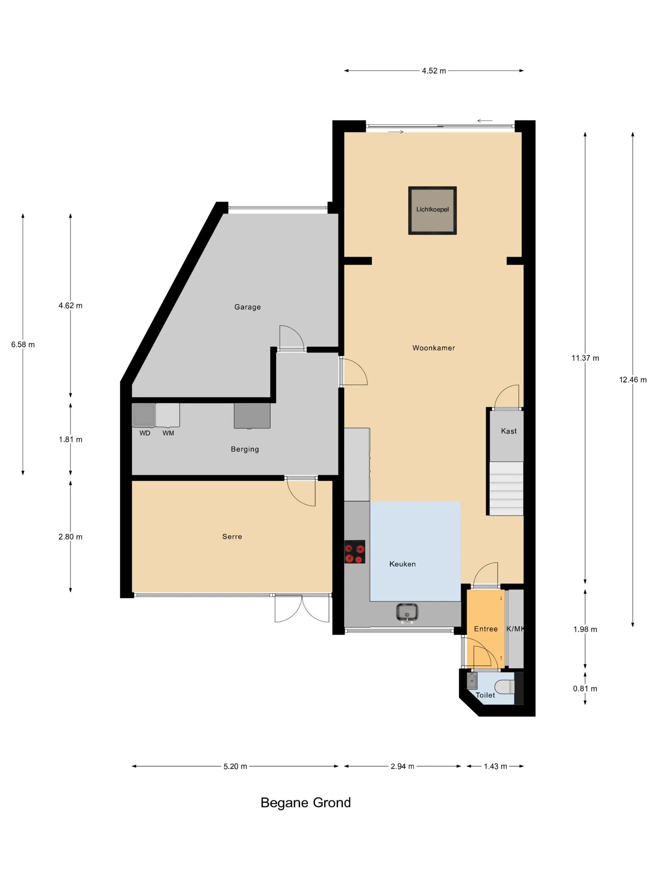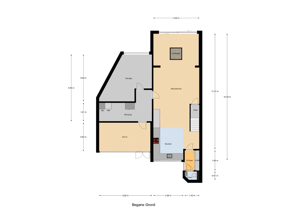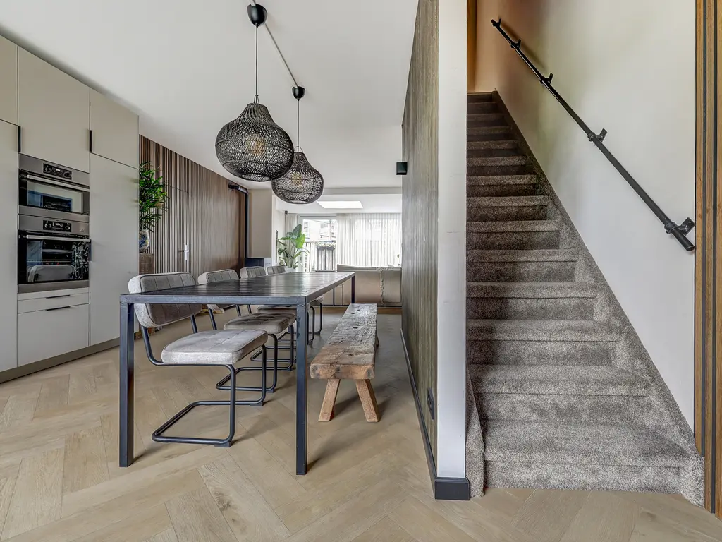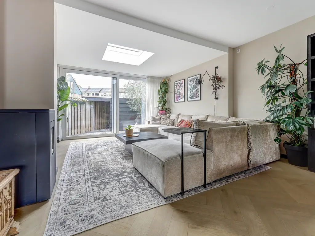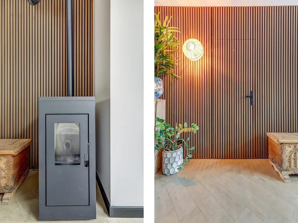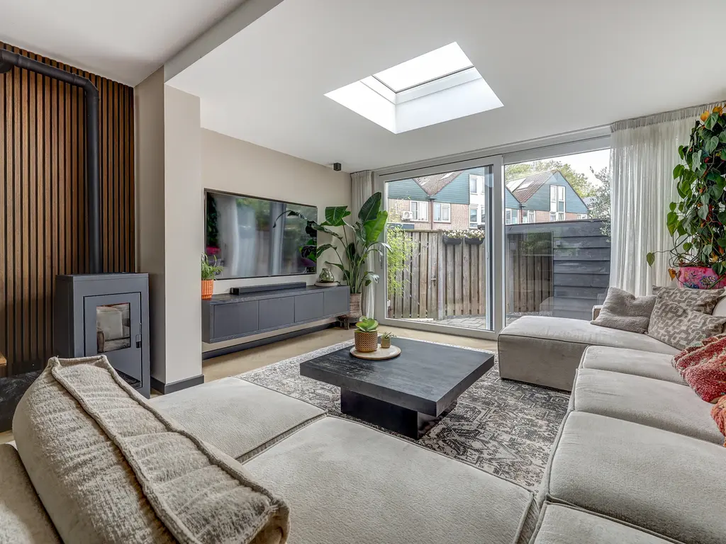 Begane grond: Welkom! In de hal vind je de meterkast en een modern, zwevend toilet. De ruime woonkamer is uitgebouwd en voorzien van een lichtkoepel, waardoor er een prachtige, lichte leefruimte is ontstaan. De PVC-visgraatvloer met vloerverwarming, palletkachel en strakke wandafwerking zorgen voor een stijlvolle en warme uitstraling.