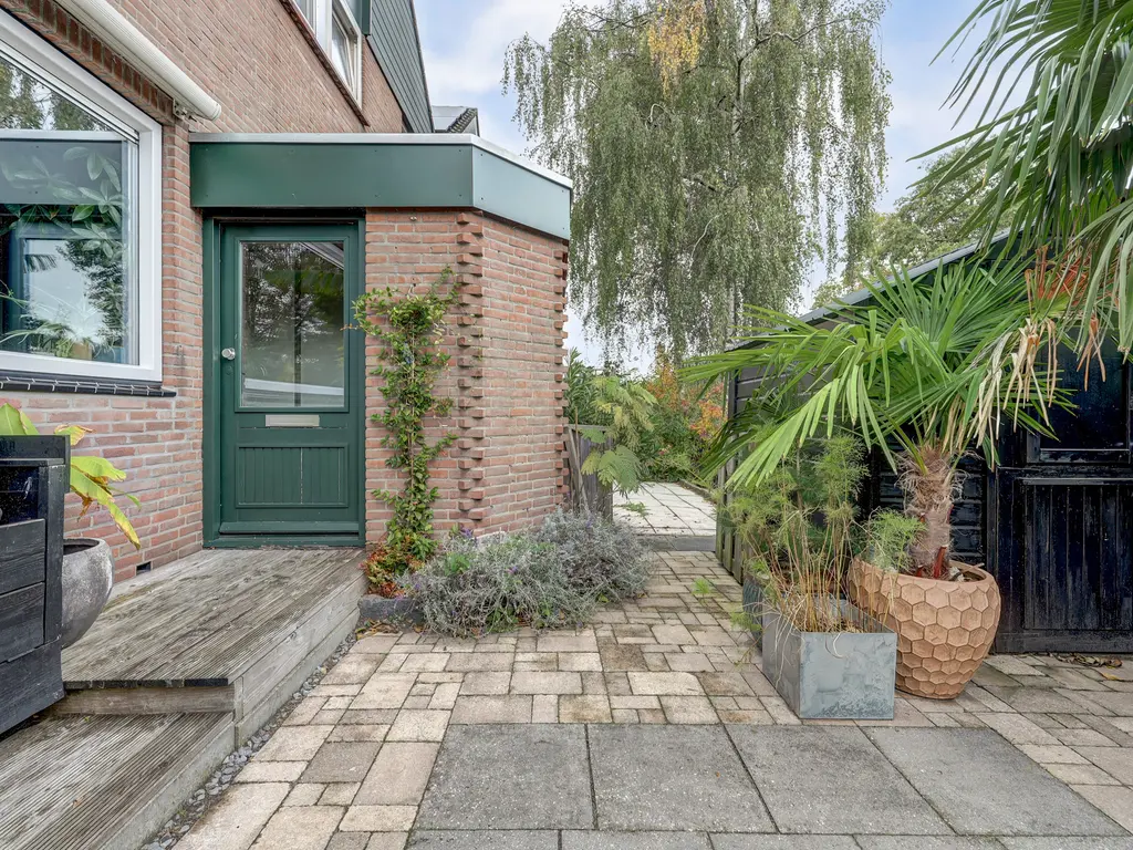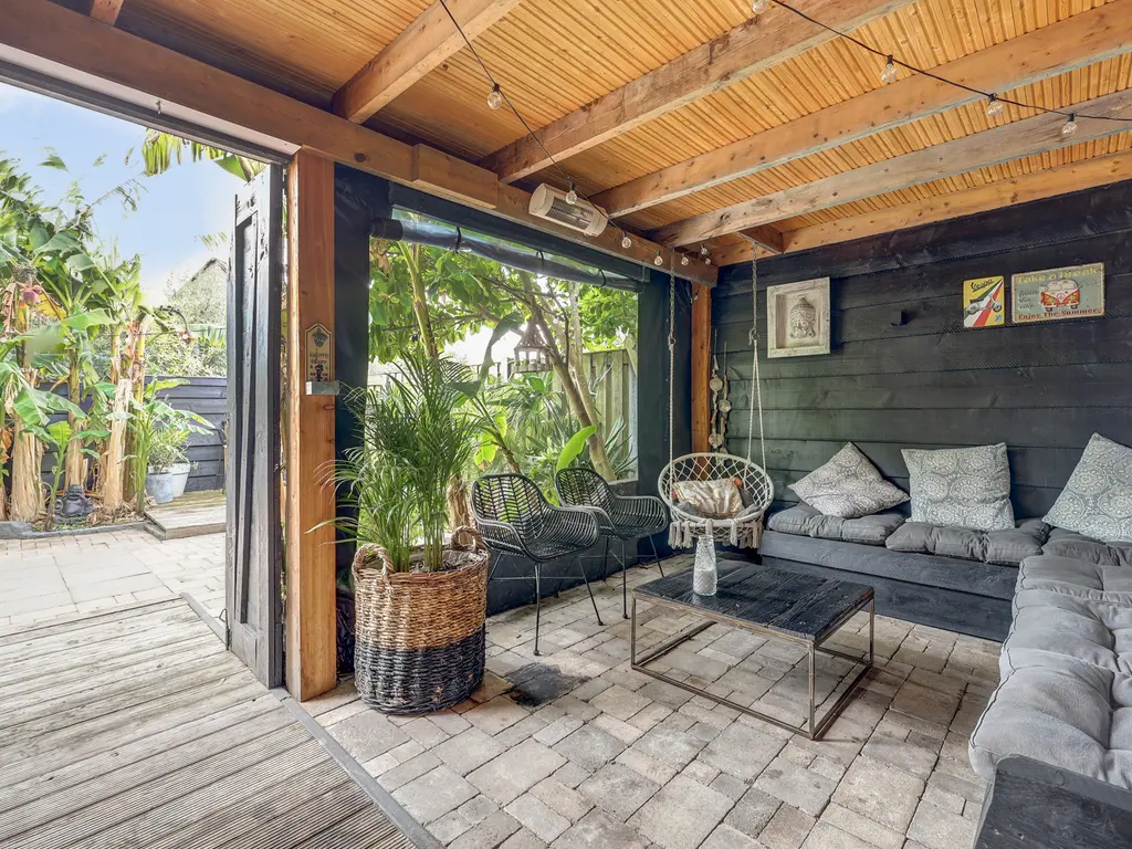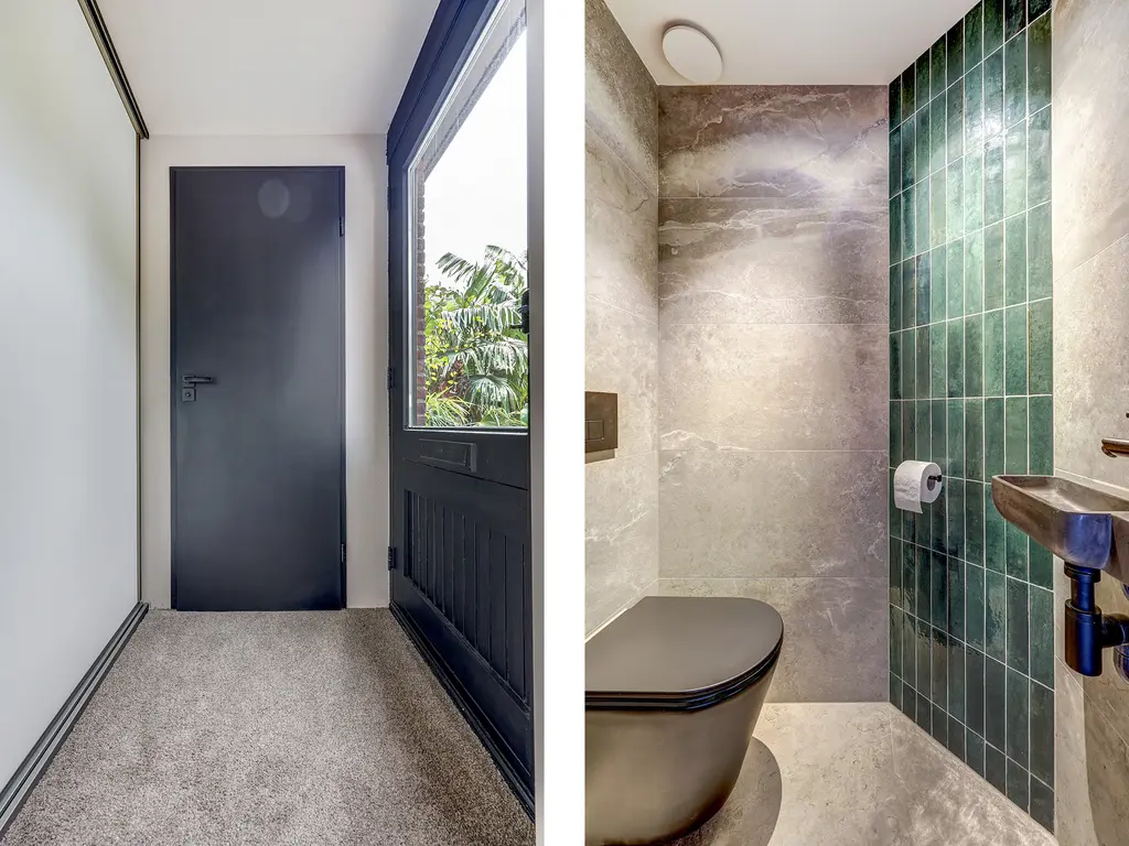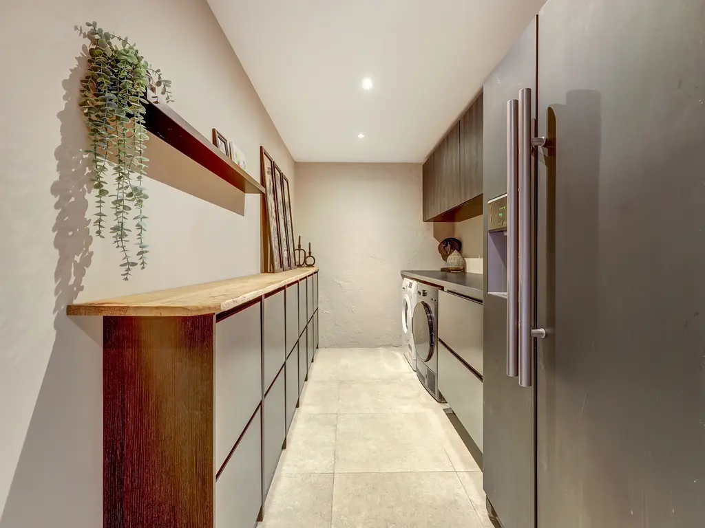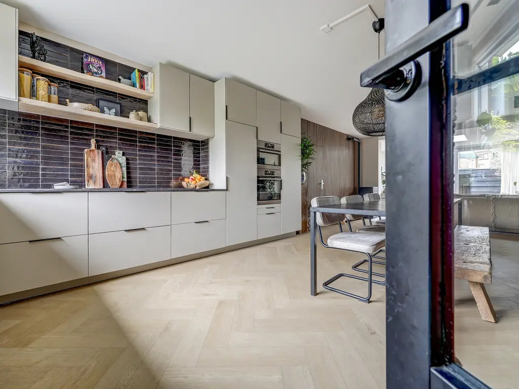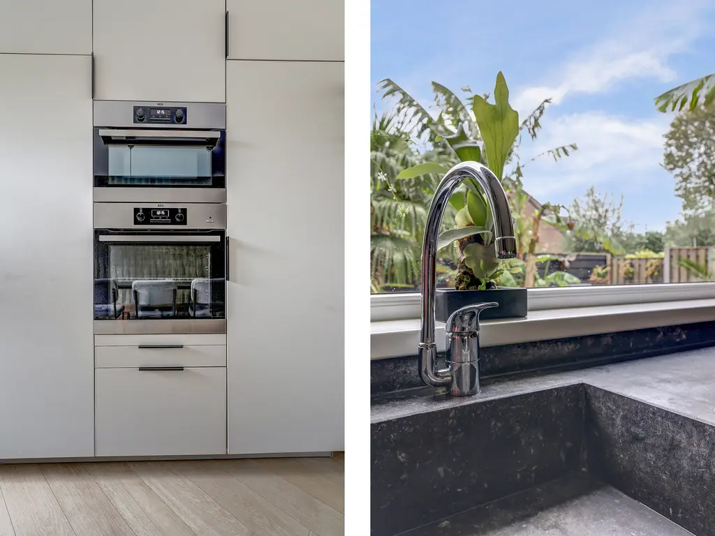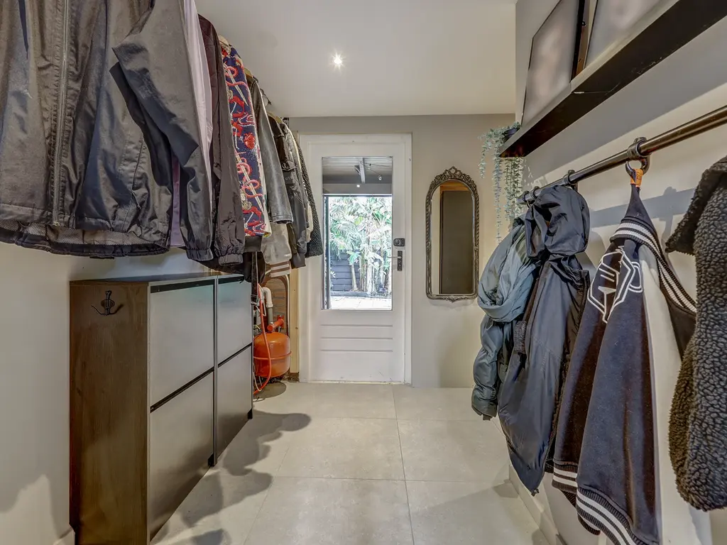 Via een mooi weggewerkte deur kom je in de bijkeuken met keukenblok, aansluitingen voor wasmachine en droger, en toegang tot de overkapping en zonnige tuin — een heerlijke plek om beschut te genieten van het buitenleven.