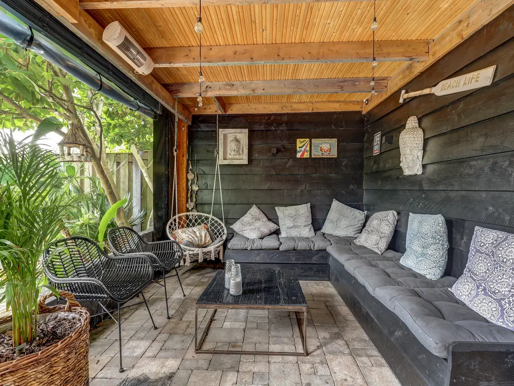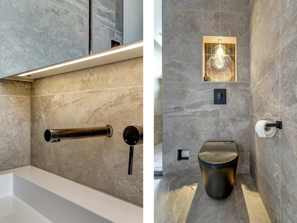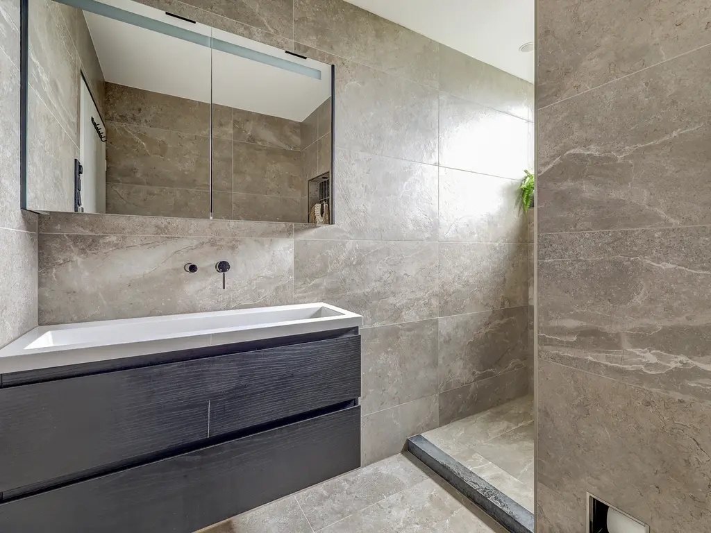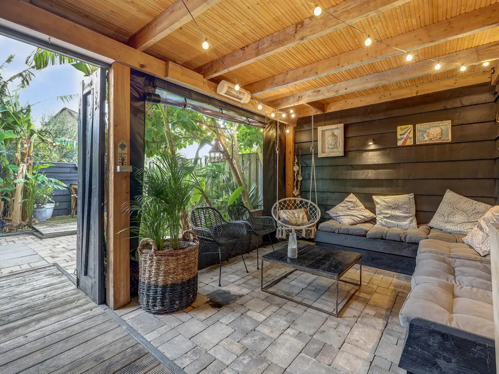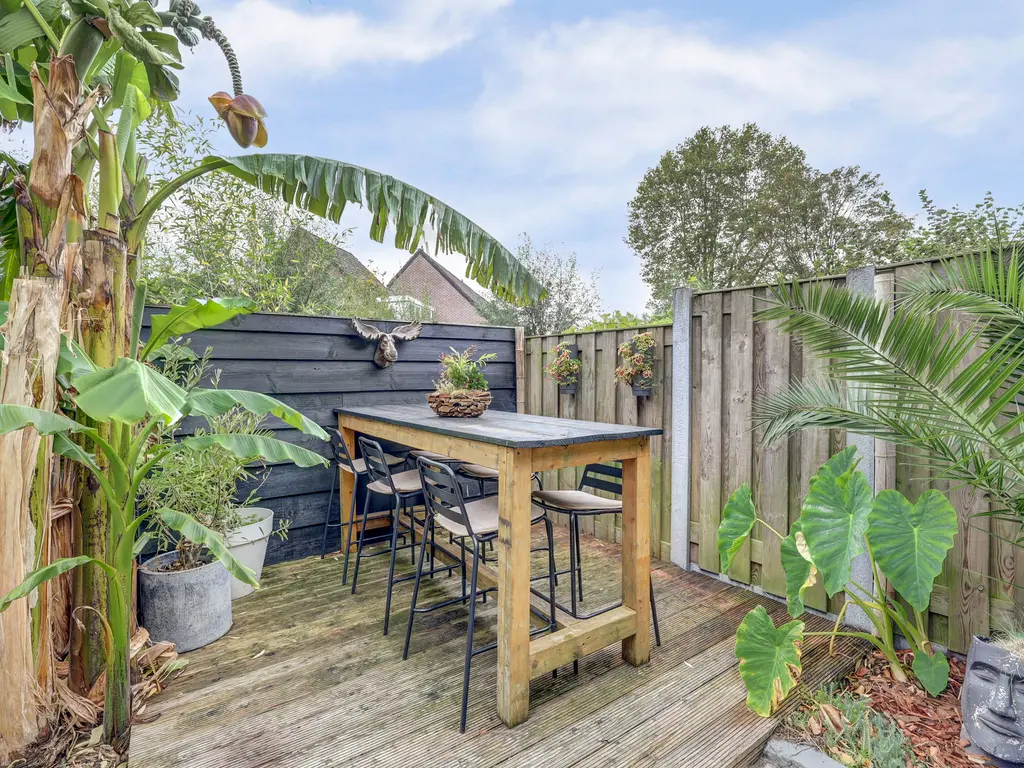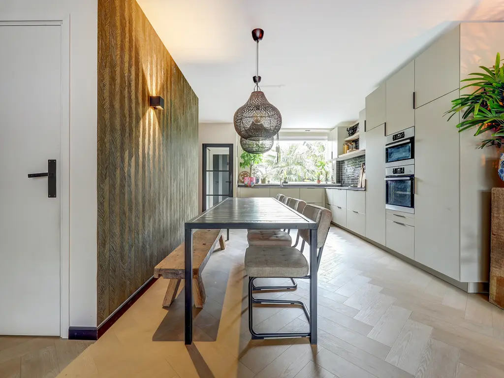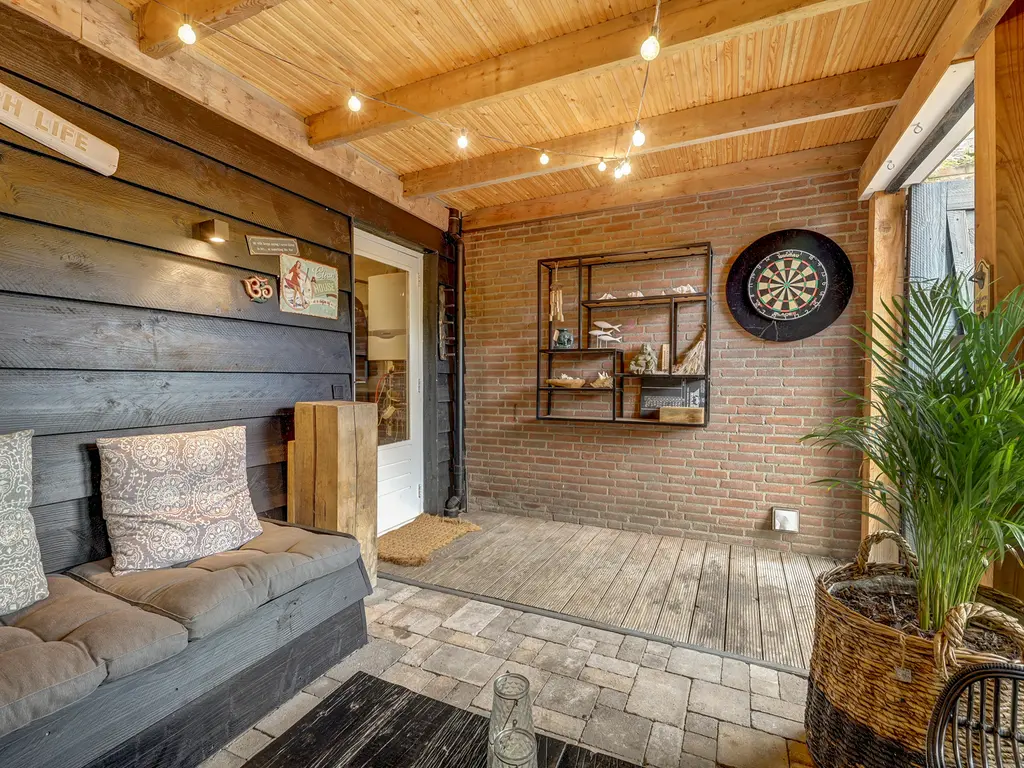Via een mooi weggewerkte deur kom je in de bijkeuken met keukenblok, aansluitingen voor wasmachine en droger, en toegang tot de overkapping en zonnige tuin — een heerlijke plek om beschut te genieten van het buitenleven.