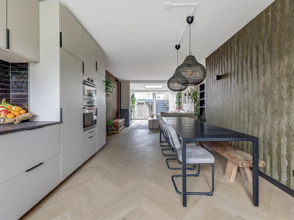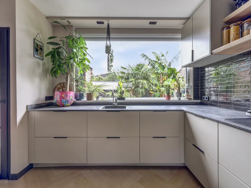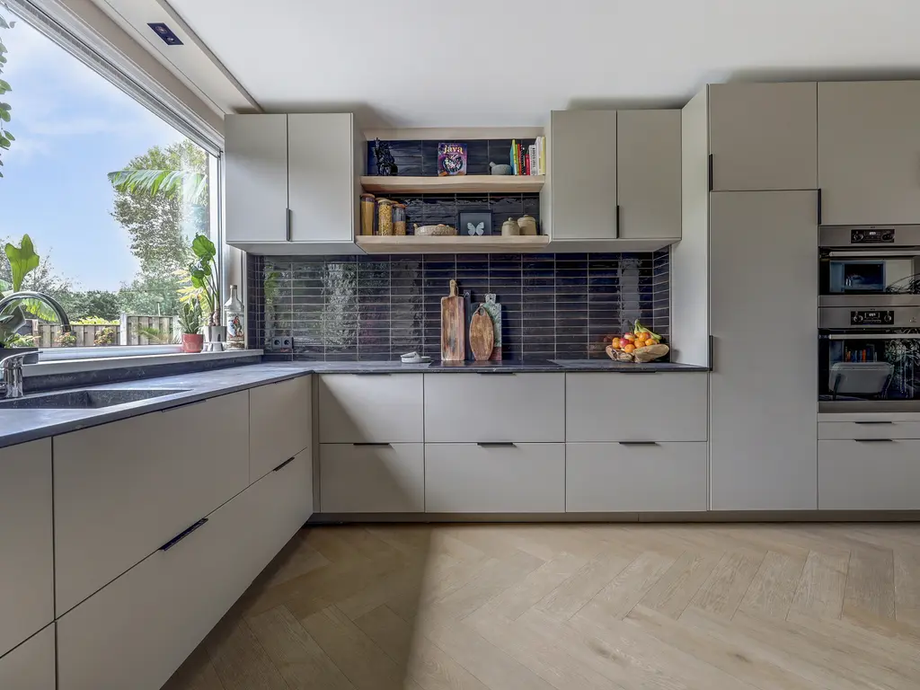 Moderne strakke open keuken (2024) welke mooi uitzicht heeft over de tuin. De keuken is v.v. een koelkast, vriezer, vaatwasser, magnetron, oven en prachtig natuurstenen aanrechtblad.