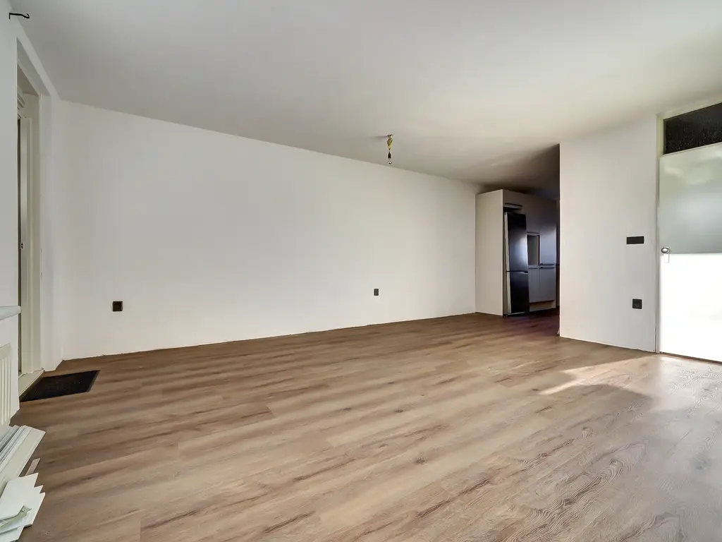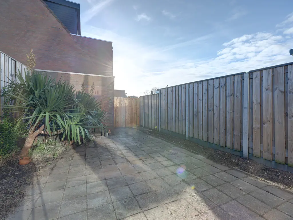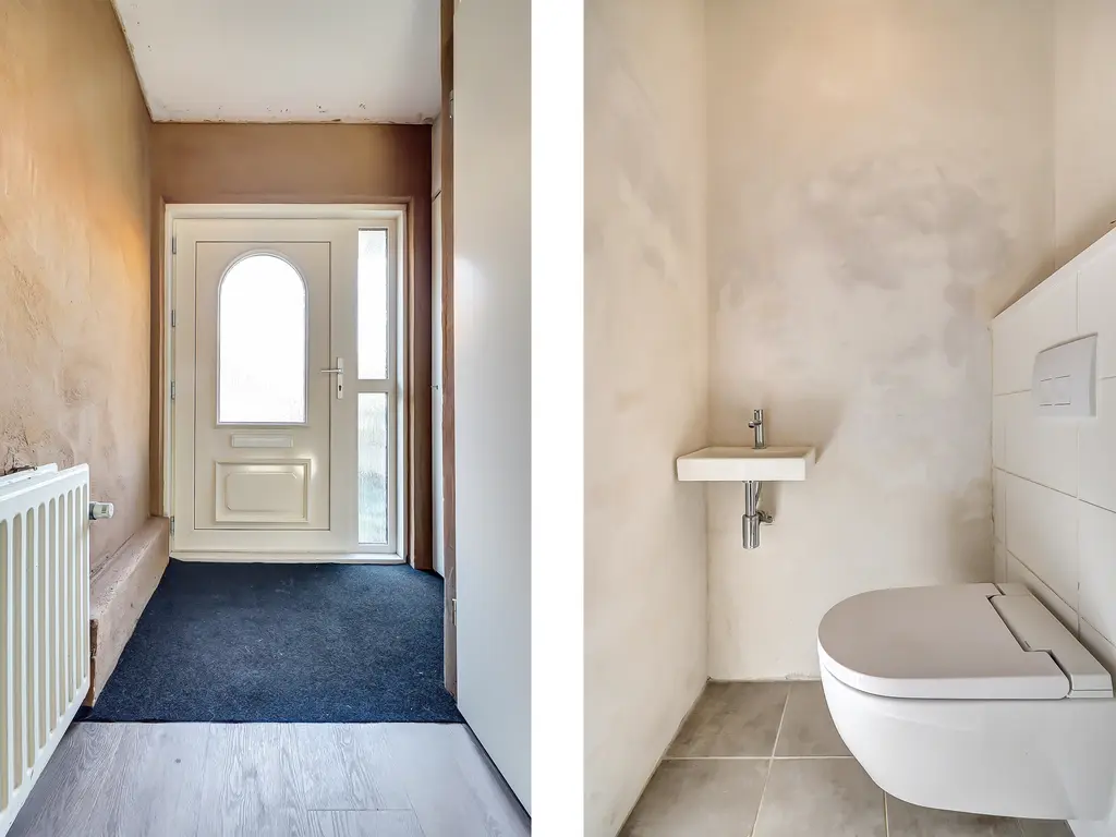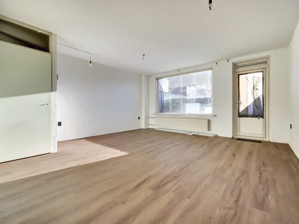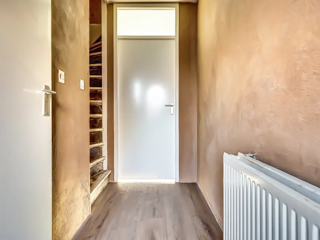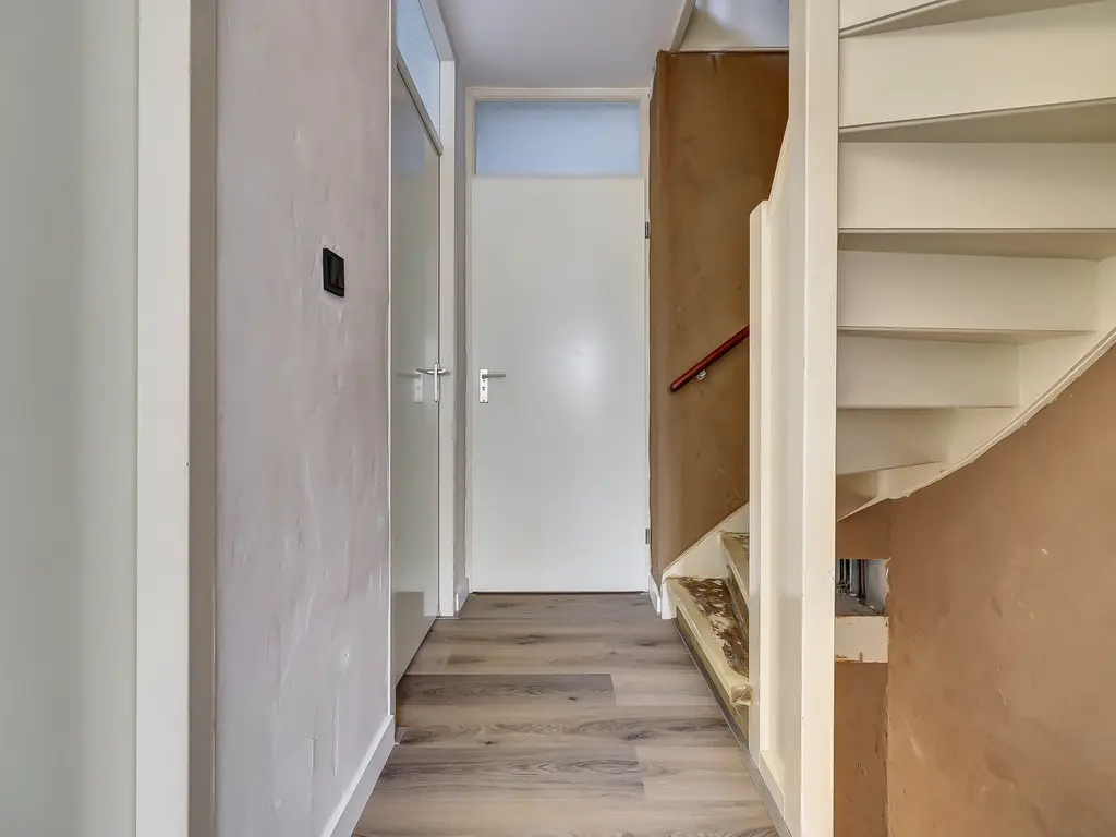 Begane grond: Entree/hal met meterkast, modern zwevend toilet en trapopgang naar de eerste verdieping. De ruime en lichte woonkamer is voorzien van een fraaie PVC-vloer en biedt via een deur toegang tot de zonnige achtertuin. De tuin beschikt over een stenen berging en een handige achterom.