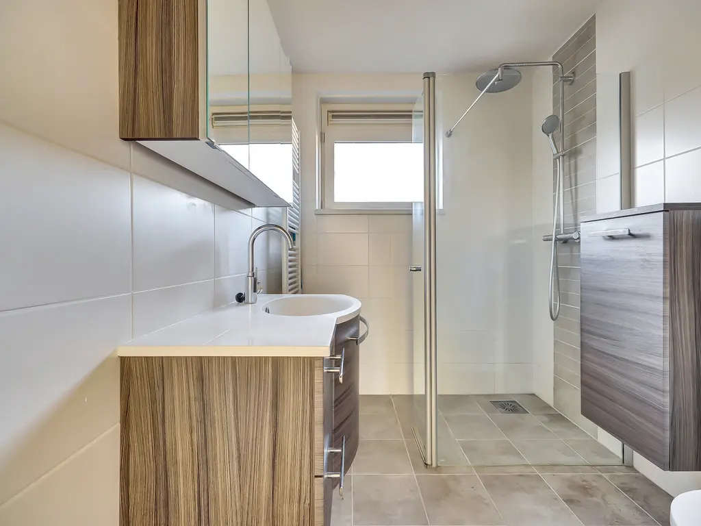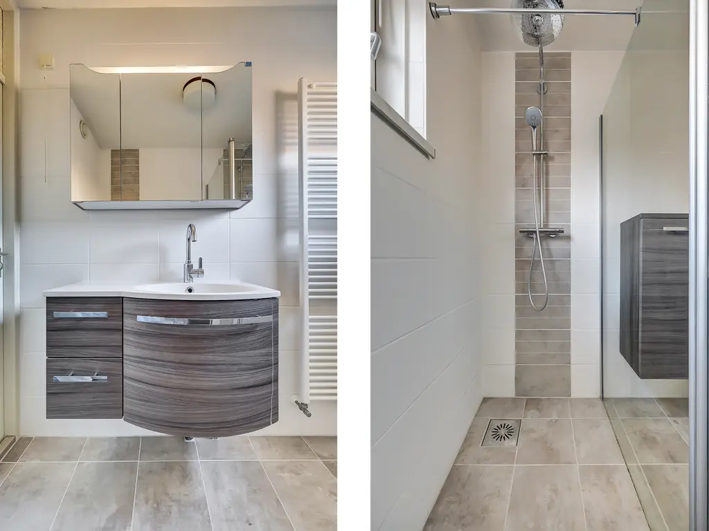 De moderne, strak afgewerkte badkamer is volledig betegeld en uitgerust met een inloopdouche, wastafelmeubel en een tweede toilet.