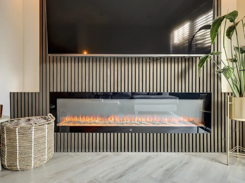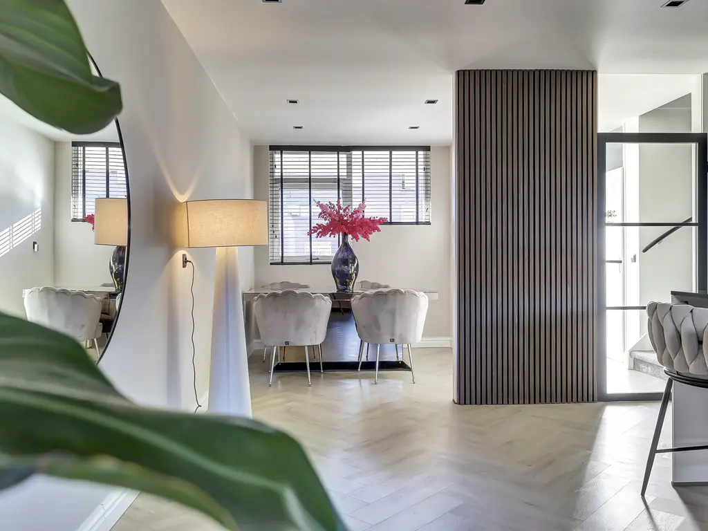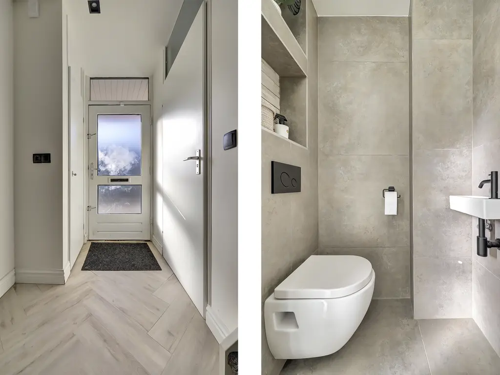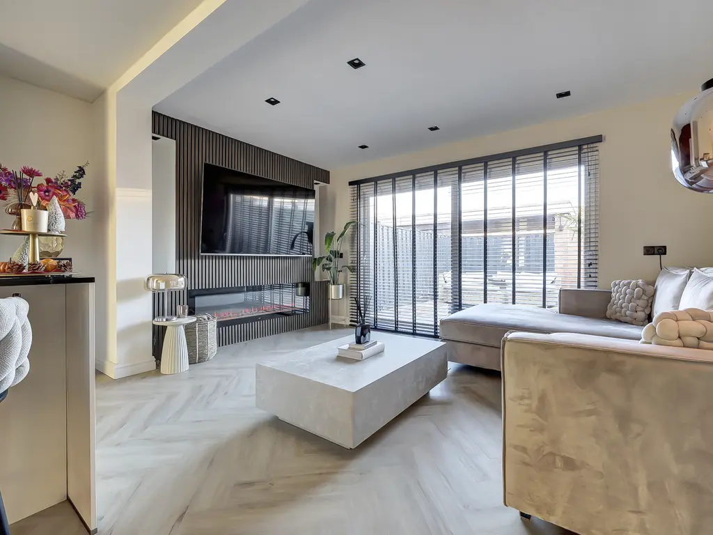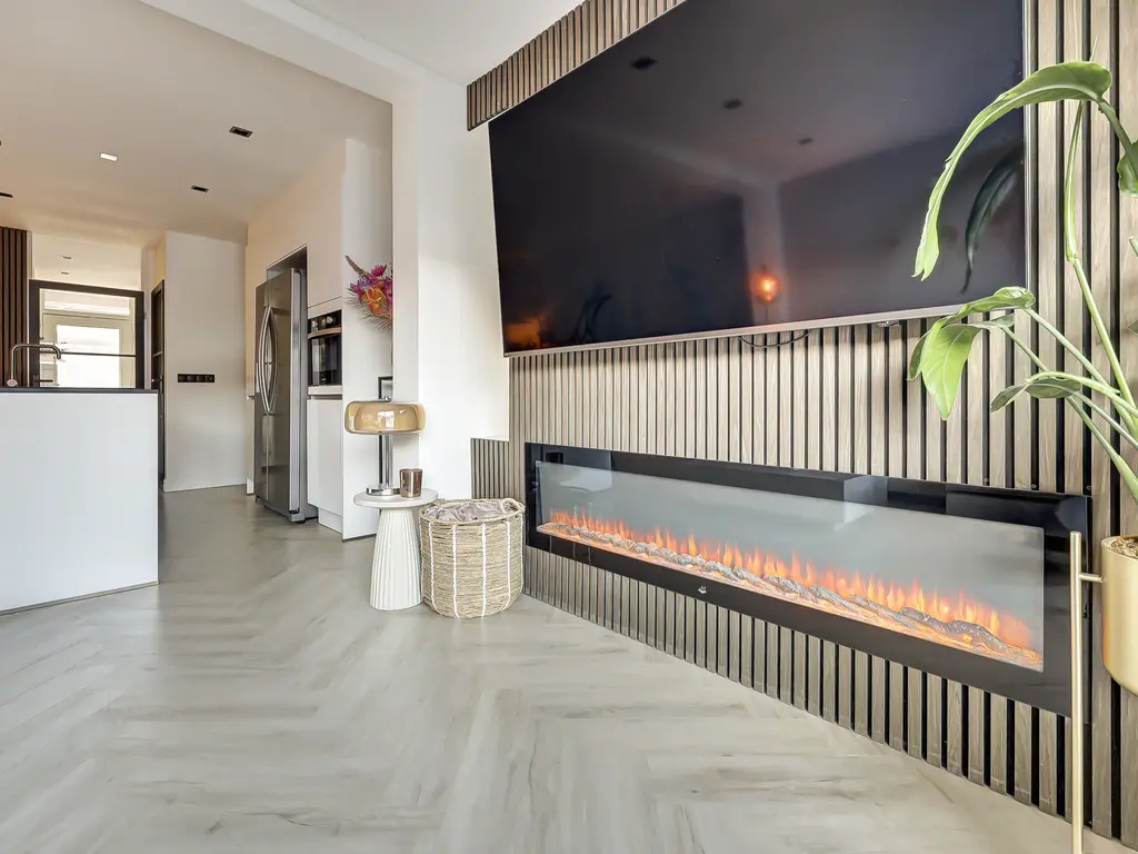 De gehele begane grond is afgewerkt met een moderne PVC visgraatvloer met vloerverwarming. Ook de stijlvolle cinewall met sierhaard is een echte eyecatcher. Aan de voorzijde van de woning bevindt zich een apart eetgedeelte waar u gezellig kunt tafelen met familie en vrienden.