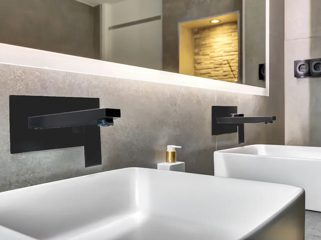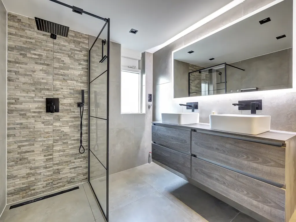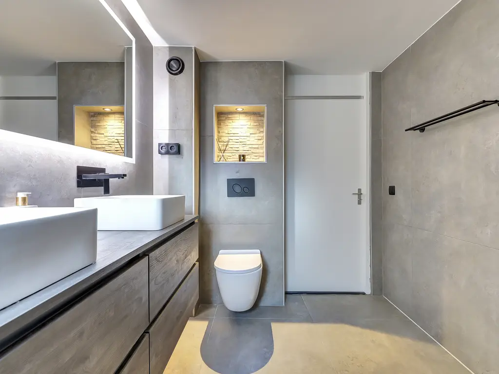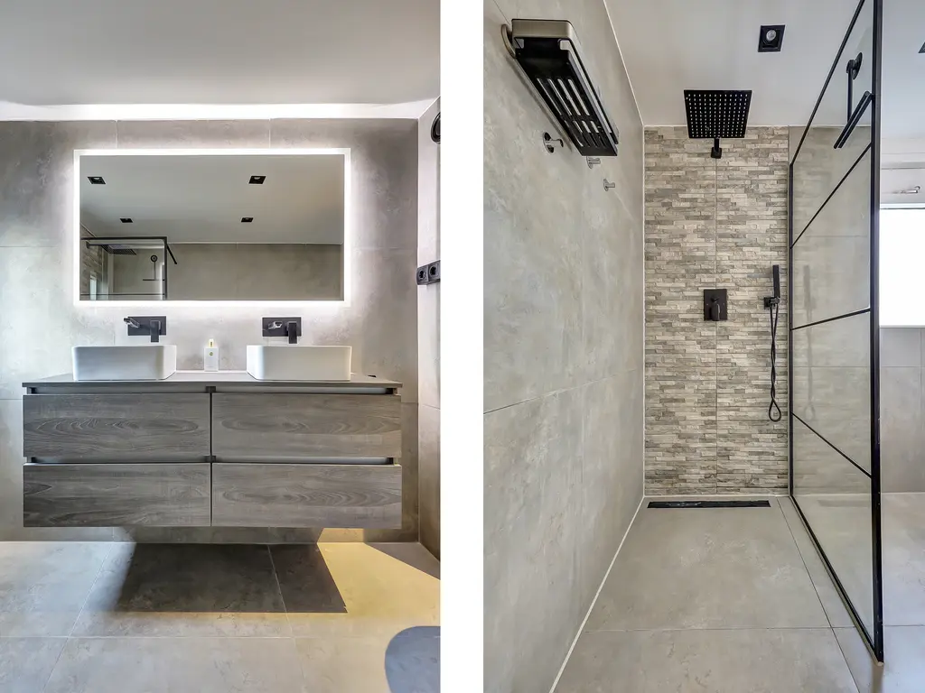 De moderne badkamer (2023) is uitgerust met een ruime inloopdouche met regendouche, een stijlvol badkamermeubel met wastafel en een zwevend toilet.