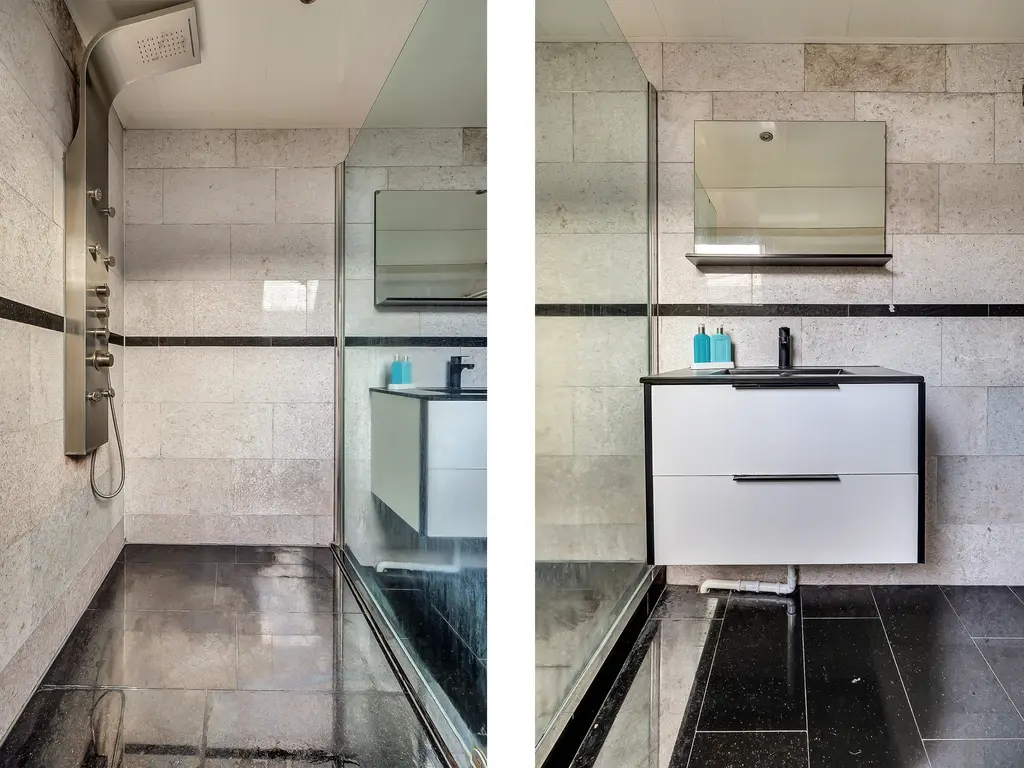 Eerste verdieping: Overloop met bergkast inclusief aansluitingen voor wasmachine en droger, stookhok met cv-ketel (Remeha Tzerra HR 2017) en toegang tot 2 ruime slaapkamers welke zijn v.v. een laminaatvloer en kunststof kozijnen met HR++ glas. De badkamer is stijlvol afgewerkt met inloopdouche, wastafelmeubel, 2e toilet, designradiator en granieten wand en vloertegels tot het plafond.
