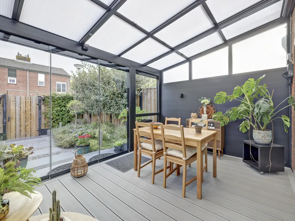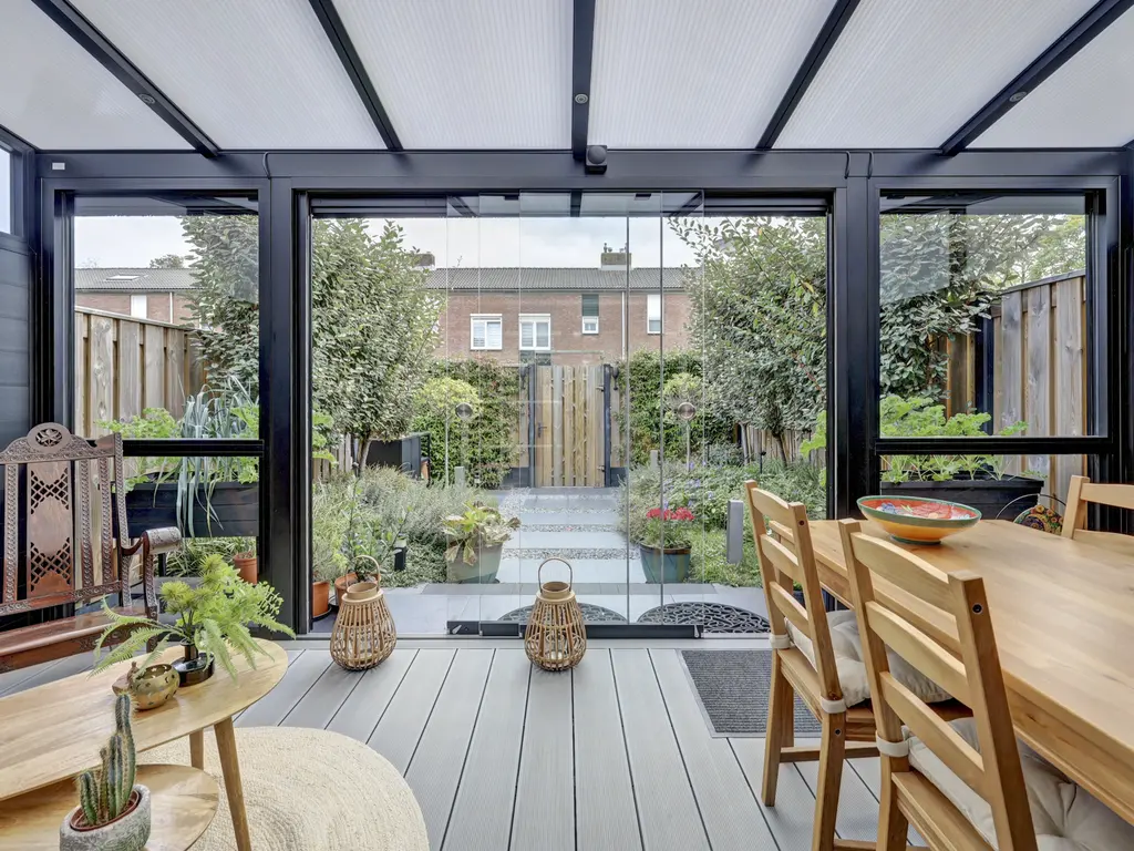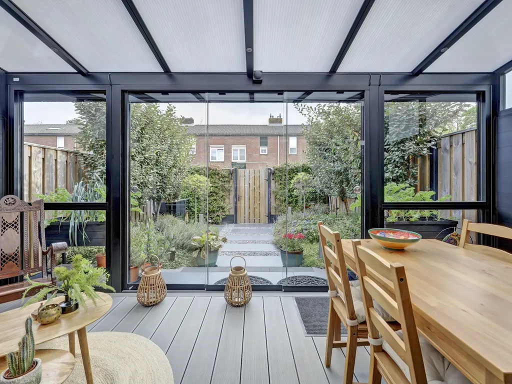 - Tuingerichte woonkamer met schuifpui naar tuinkamer voorzien van verlichting en terrasverwarmer (2021)